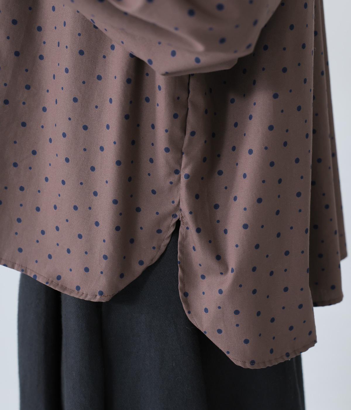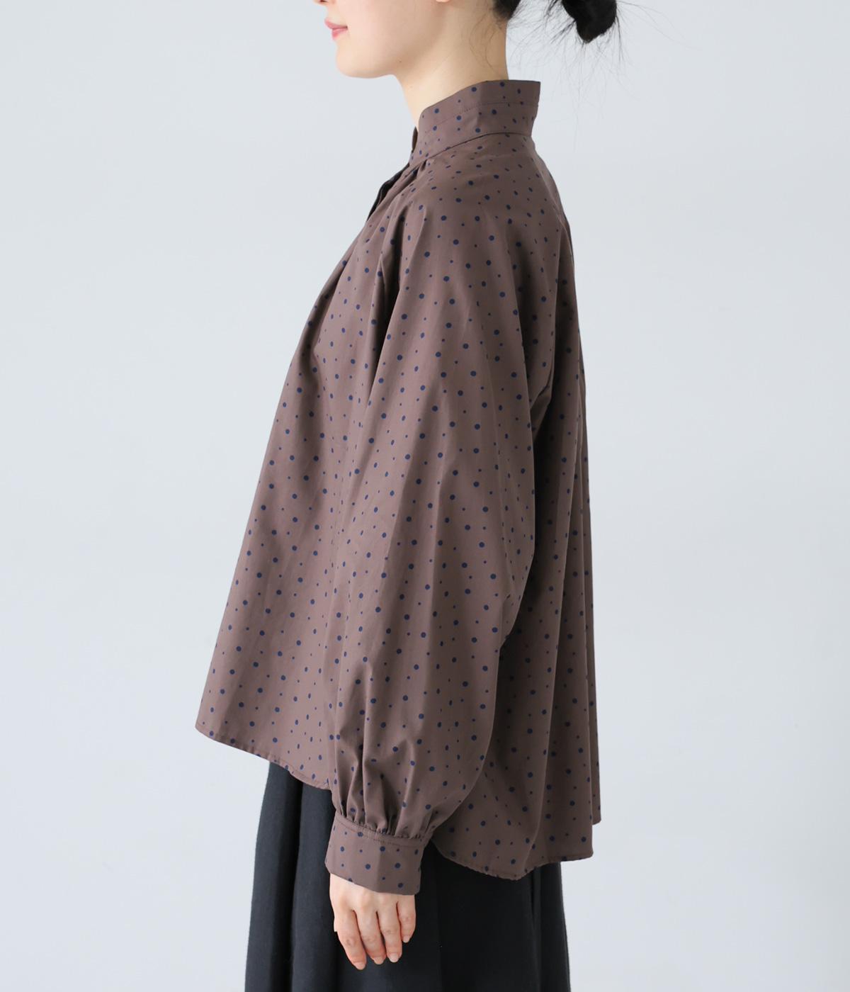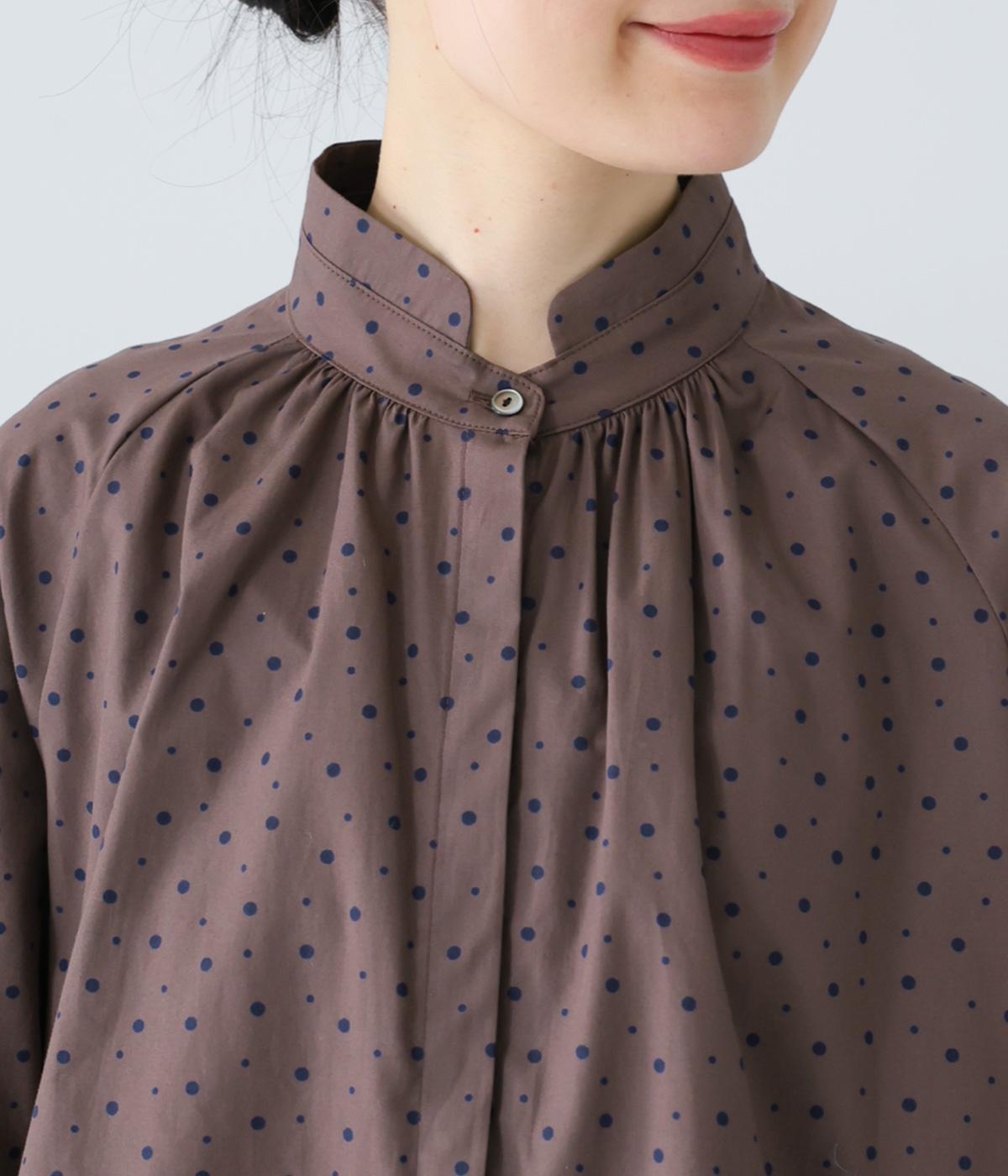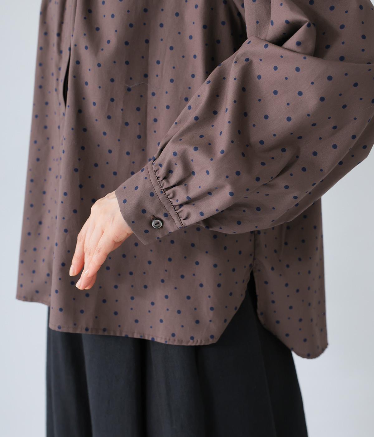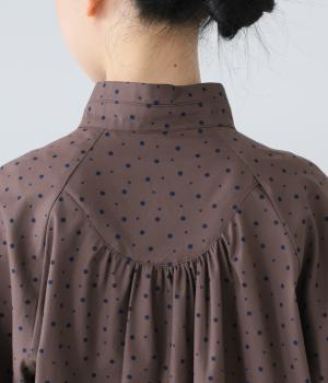 大きさの異なるドットをちりばめた大人フェミニンなブラウス。前後の身頃と袖にたっぷりとギャザーを入れて、どこから見ても華やかに仕上げました。クラシカルなスタンドカラーとシックな色合いで甘さを中和。前後差をつけたラウンドヘムもポイントです。