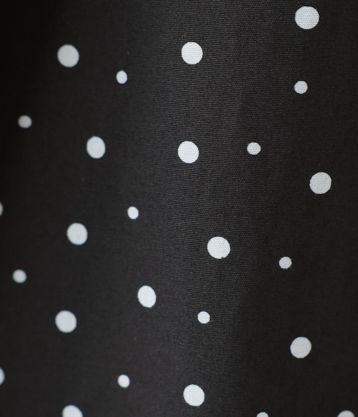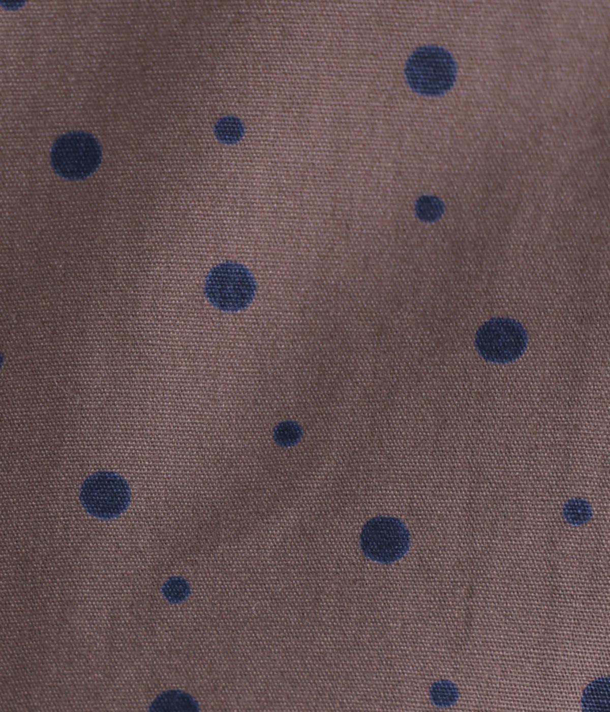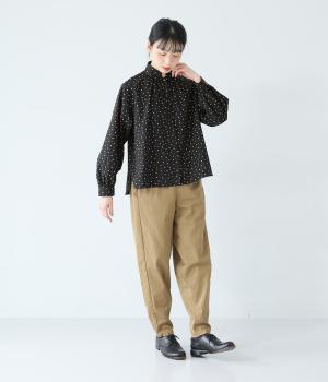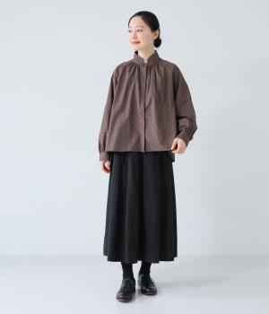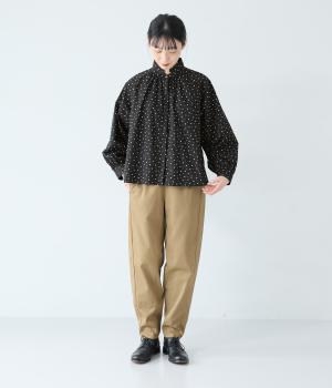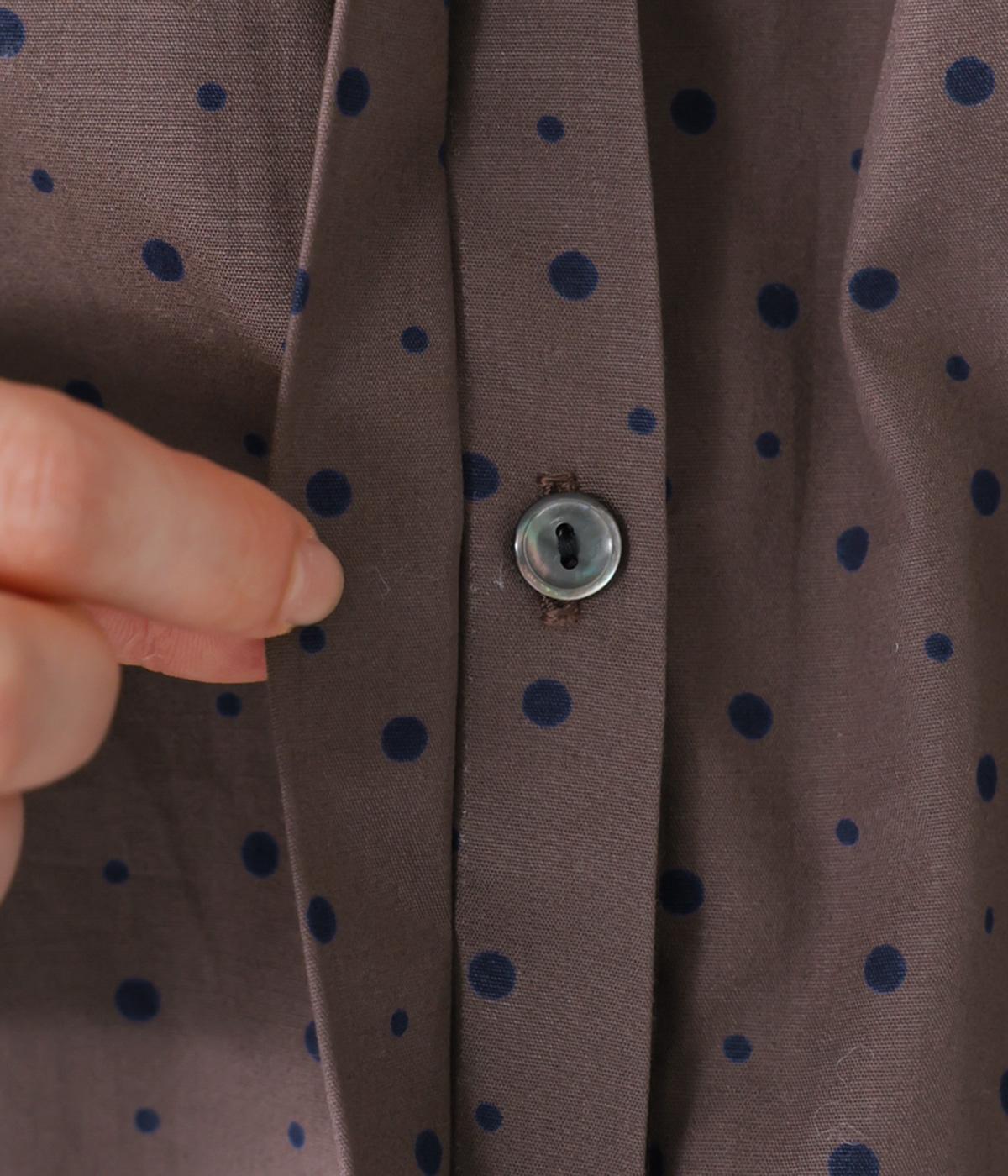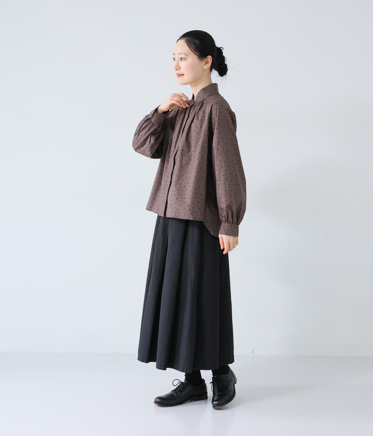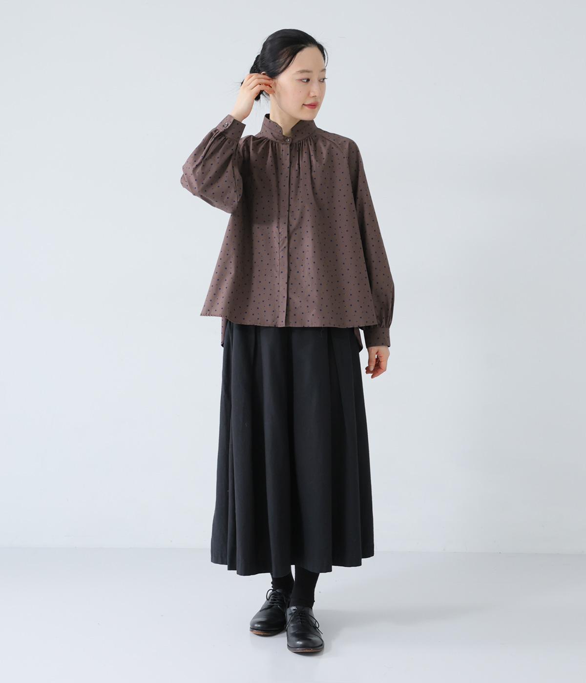 大きさの異なるドットをちりばめた大人フェミニンなブラウス。前後の身頃と袖にたっぷりとギャザーを入れて、どこから見ても華やかに仕上げました。クラシカルなスタンドカラーとシックな色合いで甘さを中和。前後差をつけたラウンドヘムもポイントです。