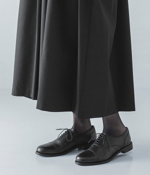つま先のラインがポイントのストレートチップシューズです。ハトメ(ひもを通す穴)がすっきりと見える内羽根デザインで、よりクラシックで洗練されたルックスに仕上がりました。素材にはツヤの美しい上質な牛革を使用し、はき続けるほどにやわらかくなじんでいきます。普段のカジュアルな装いにも、フォーマルなシーンにも対応する万能シューズです。