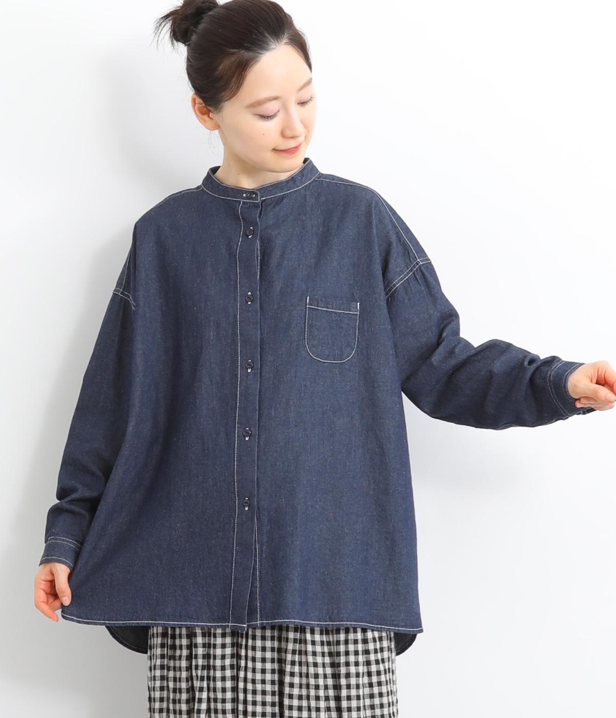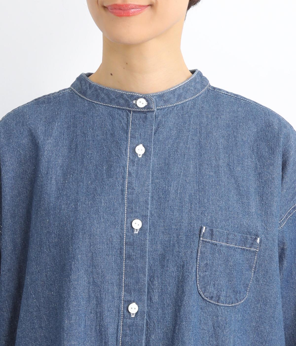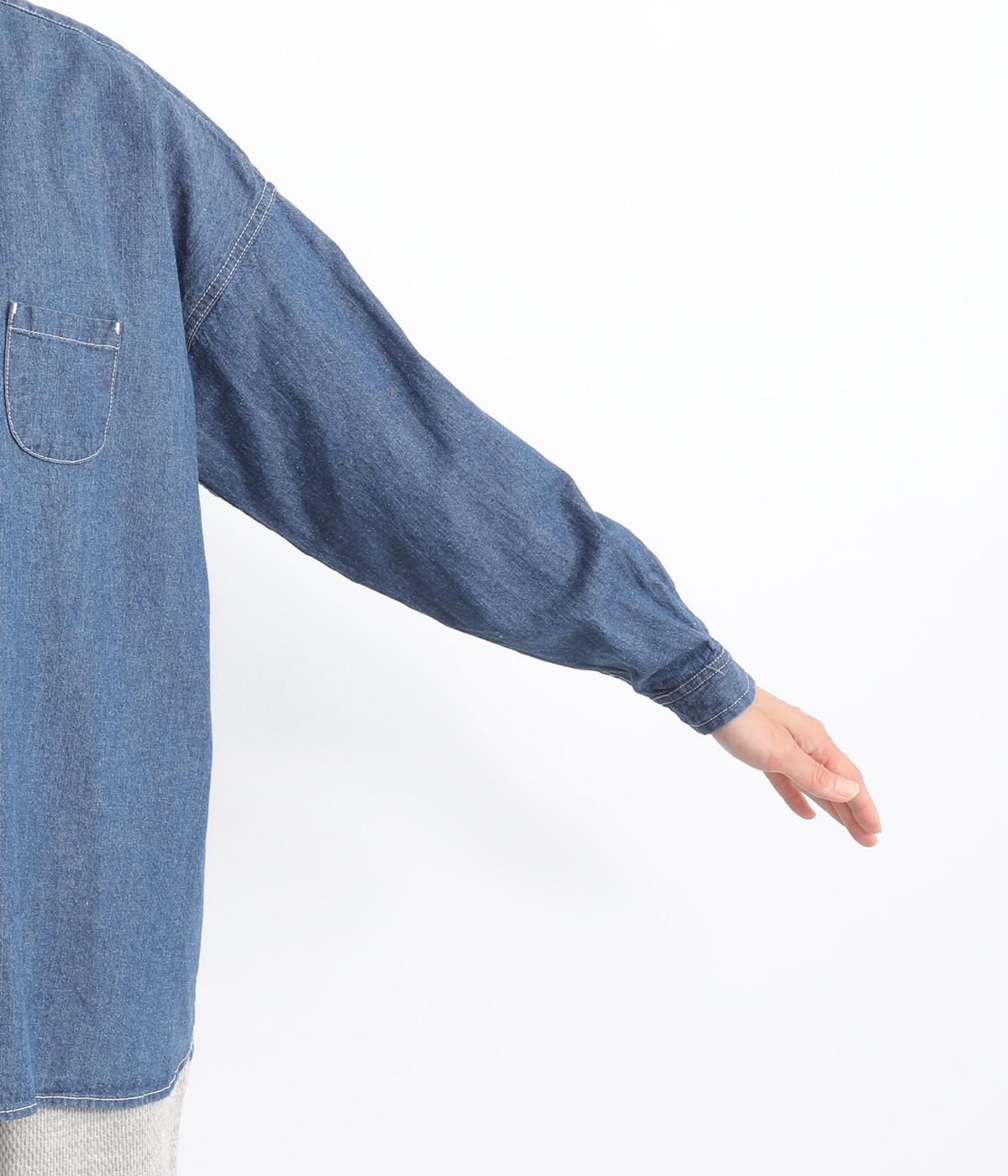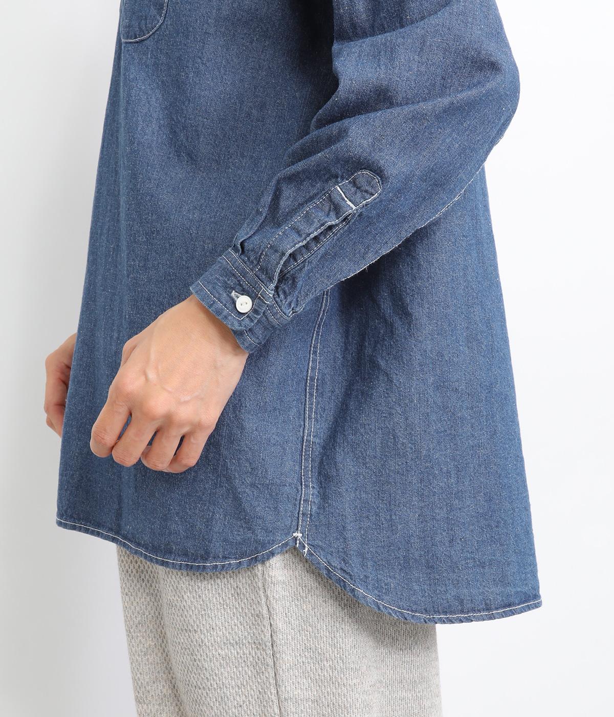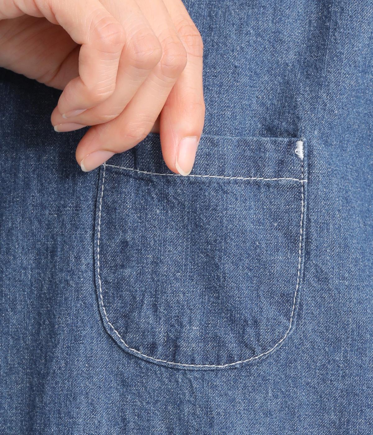 気になる腰まわりをカバーしつつ、パンツやレギンスとの相性も抜群なチュニック丈のデニムシャツ。白いステッチワークがカジュアルなムードを加速させます。左胸の丸みを帯びた小さなポケットが愛らしいポイントに。羽織りとしても活躍する便利なアイテムです。