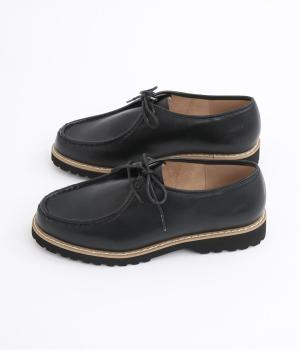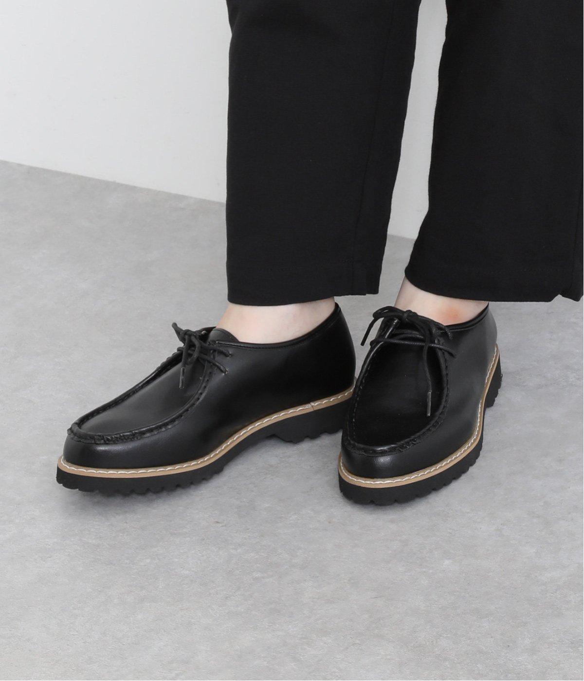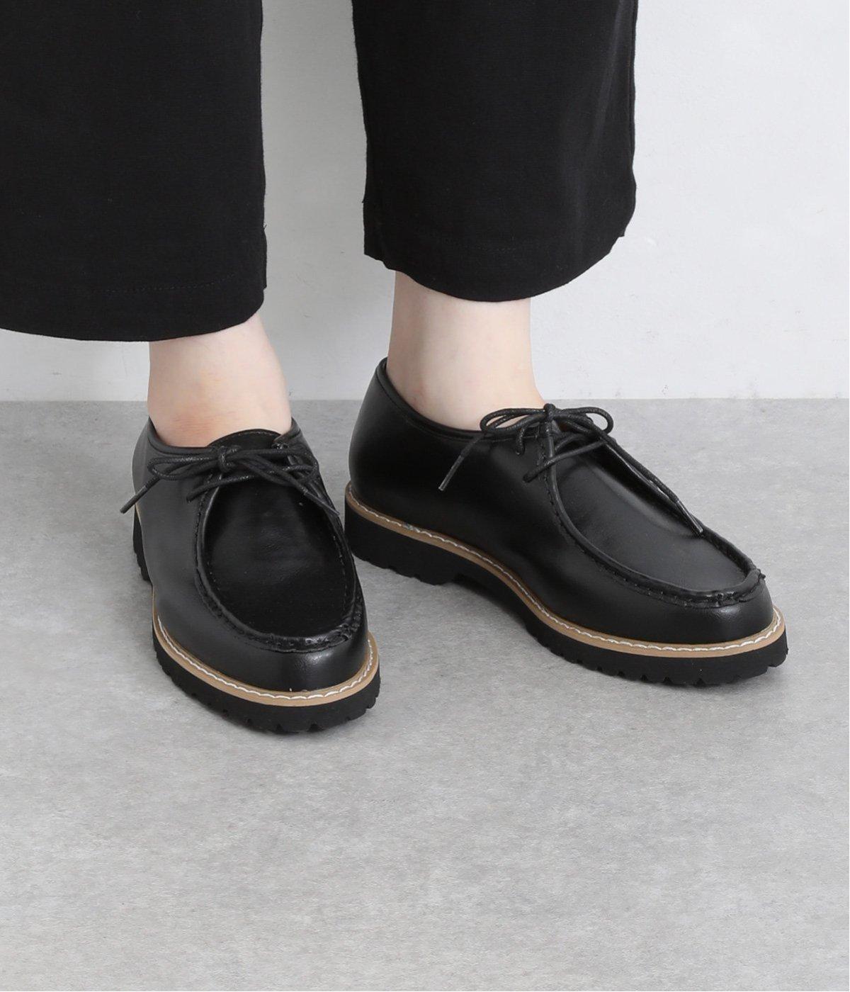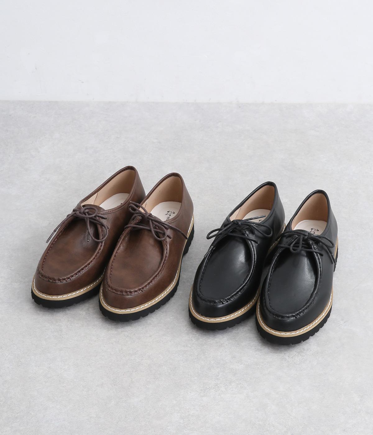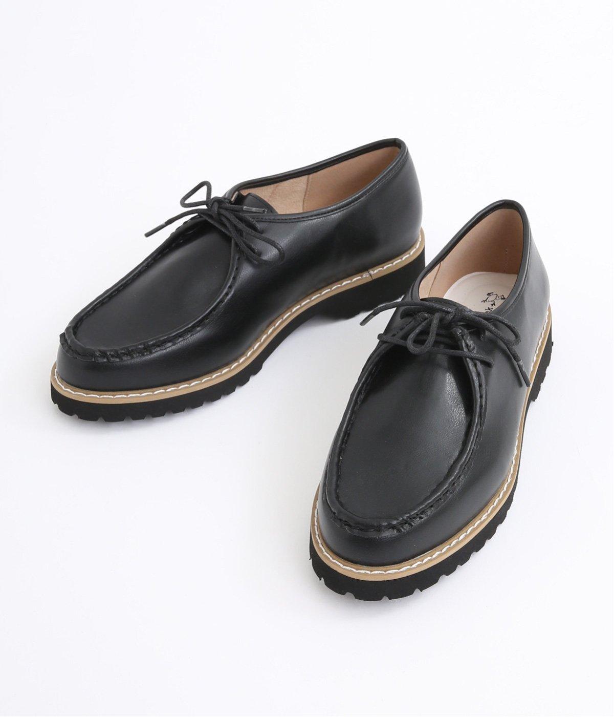 重厚感のあるブラックソールにベージュのコバがほどよいアクセントになっています。甲を深くおおうマニッシュテイストなデザインが着こなしのポイントになり、ほどよくカジュアルダウンしてくれます。