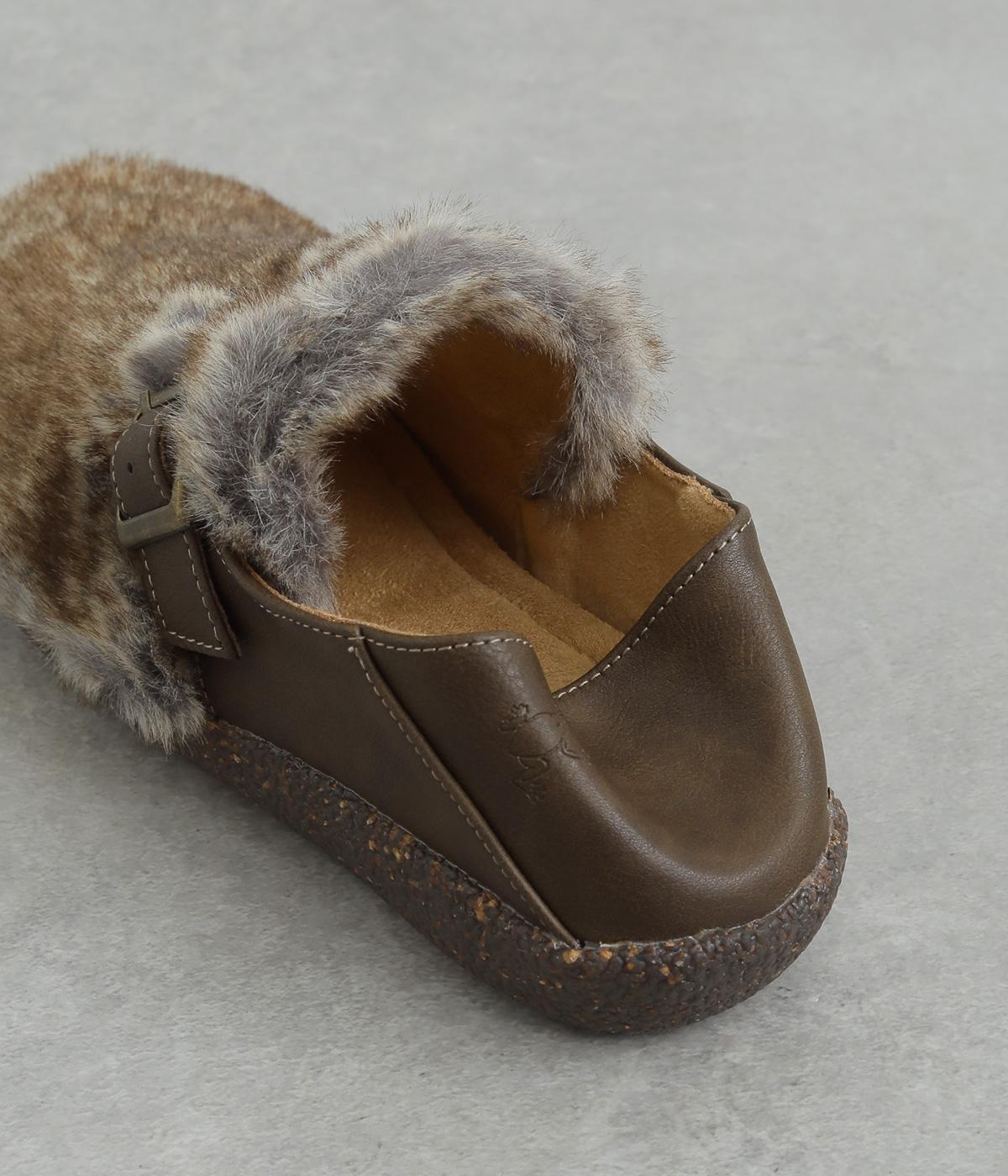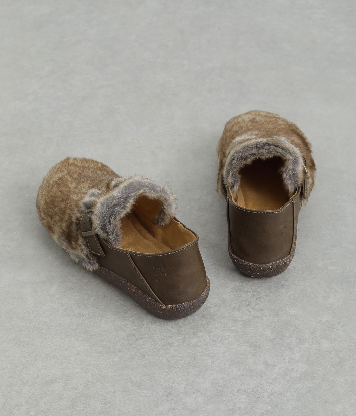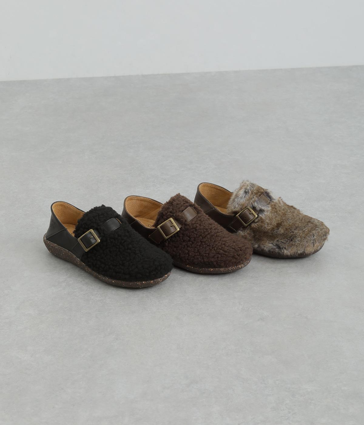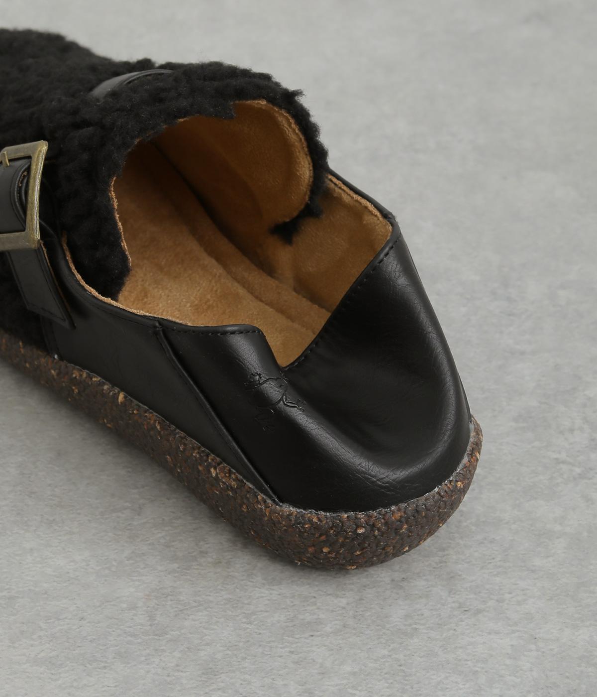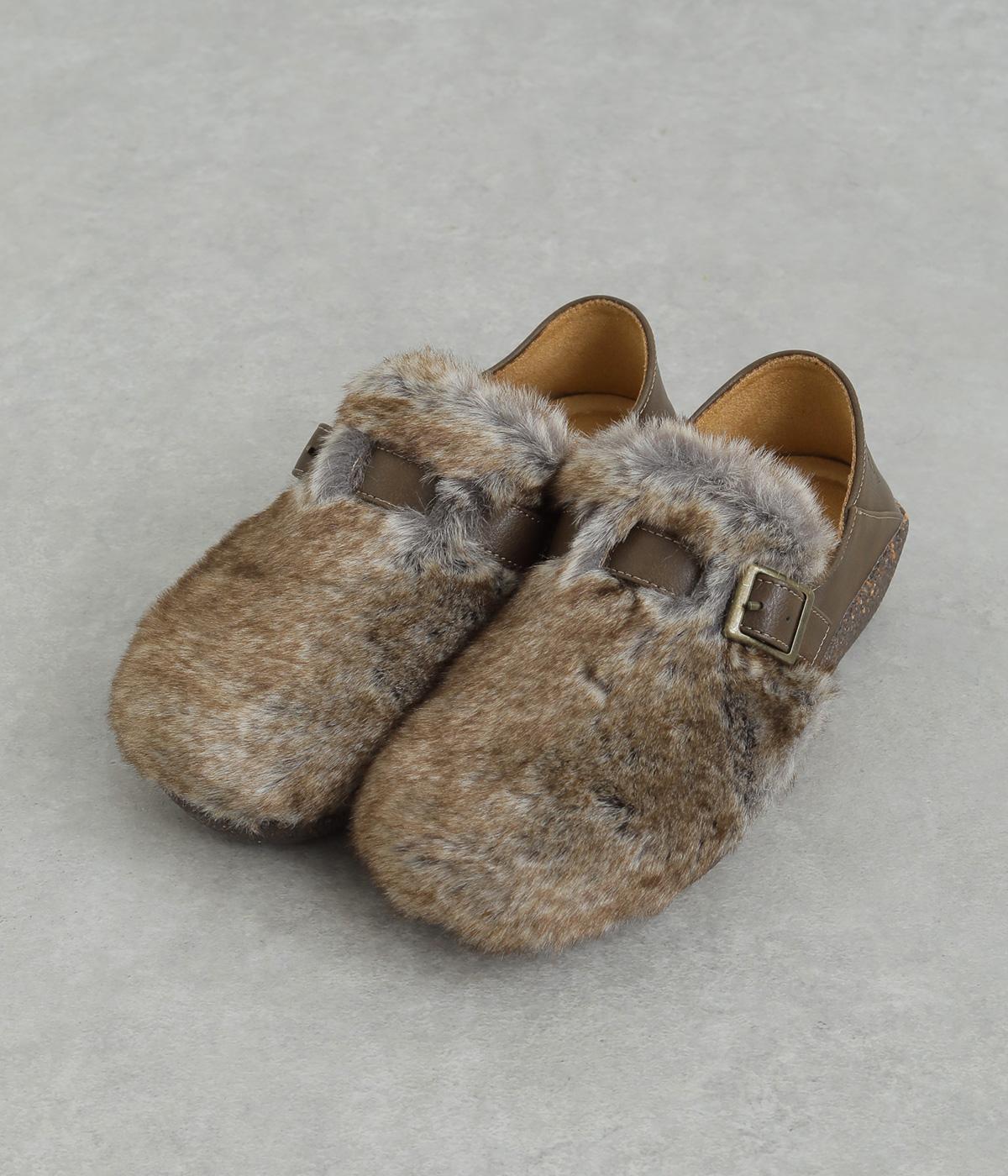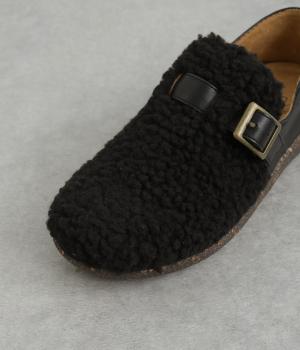 ボアやファーをあしらった季節感たっぷりのアイテムです。踵部分やベルトには上品なフェイクレザーを使用。コルクのような見た目がおしゃれな合成底にも注目です。