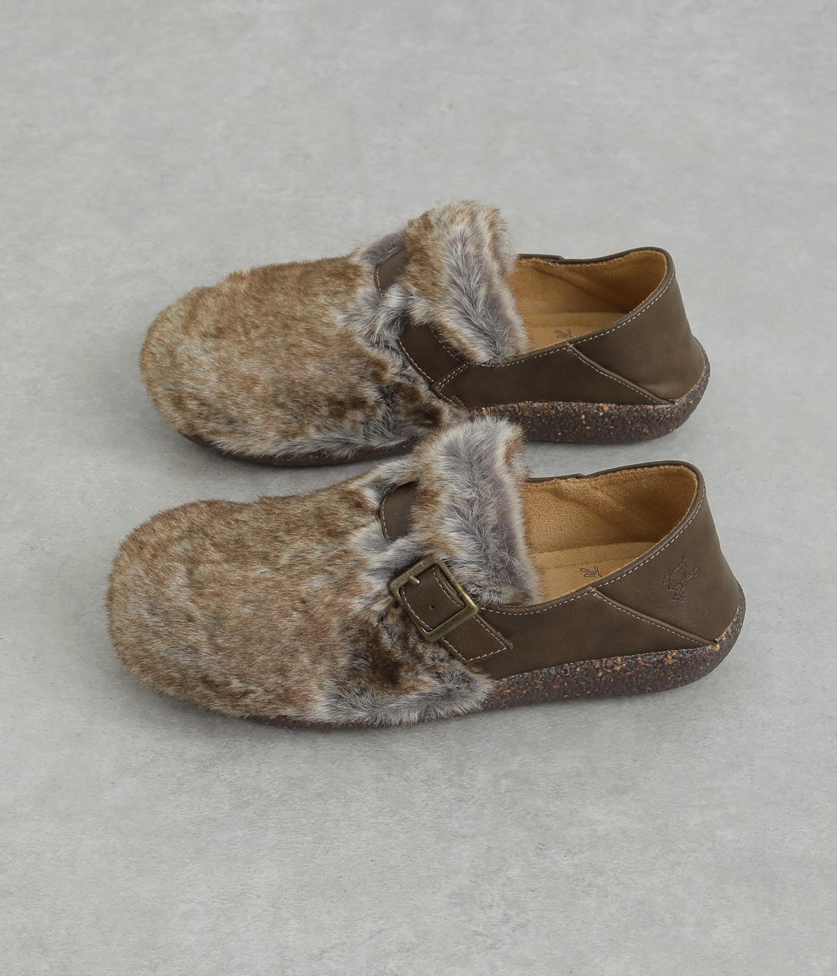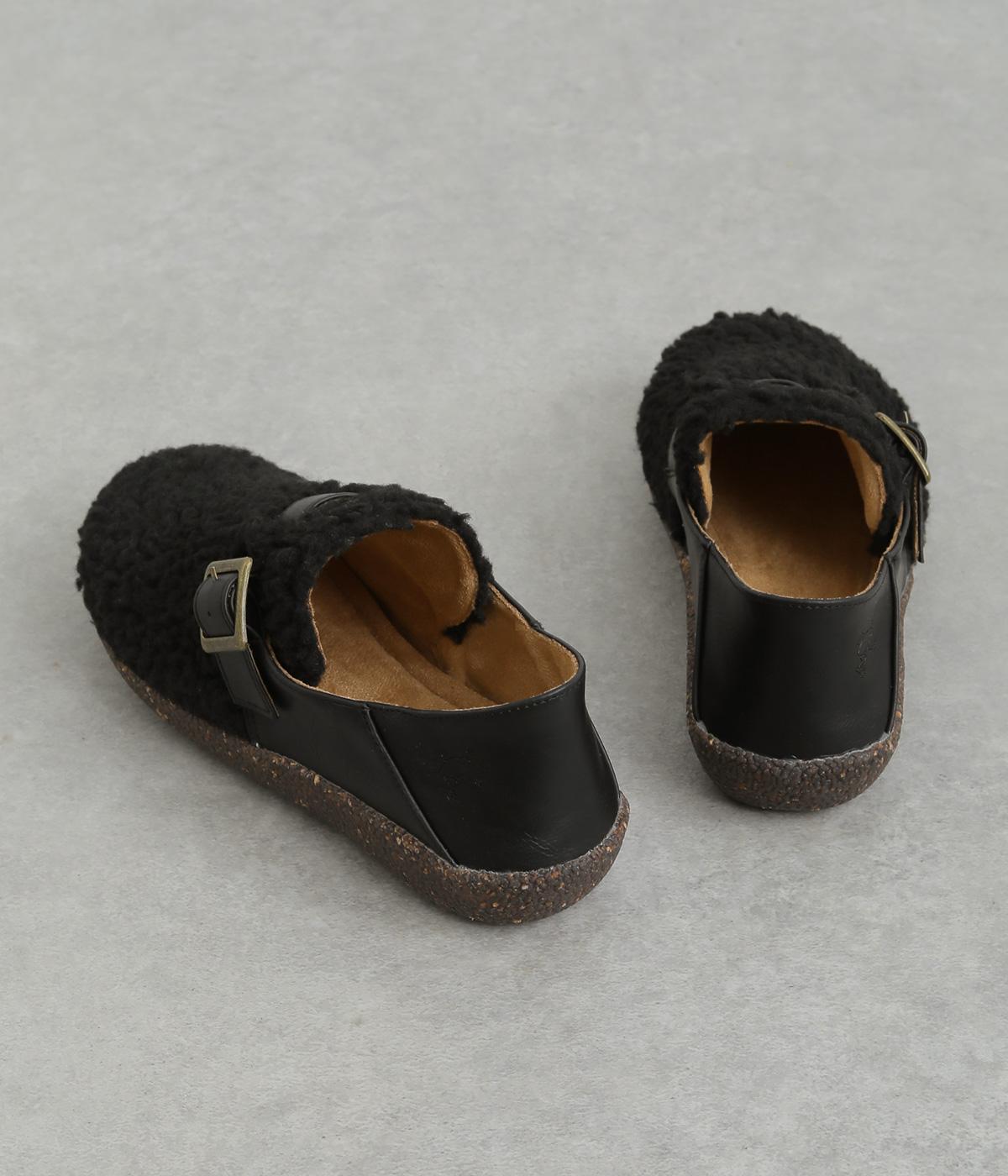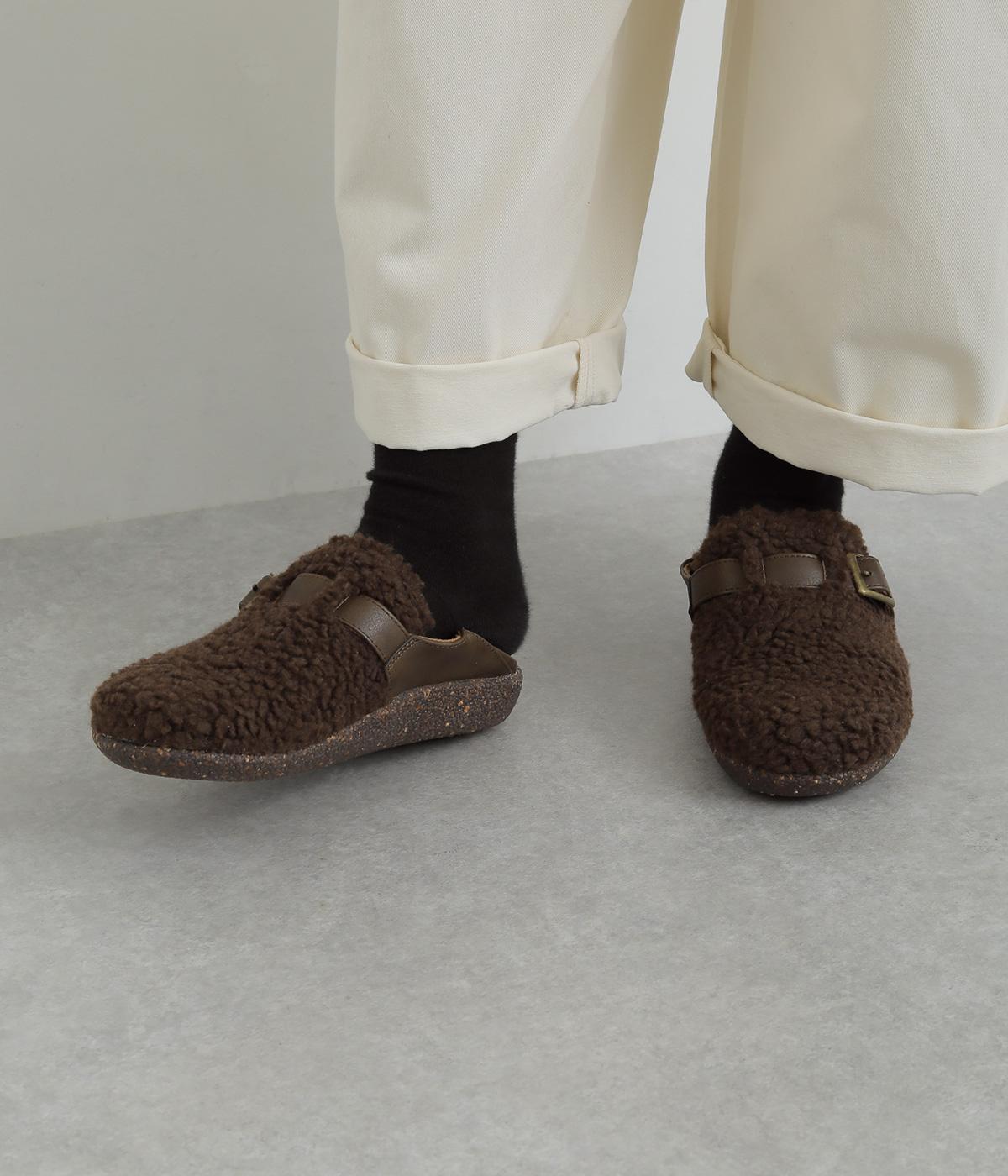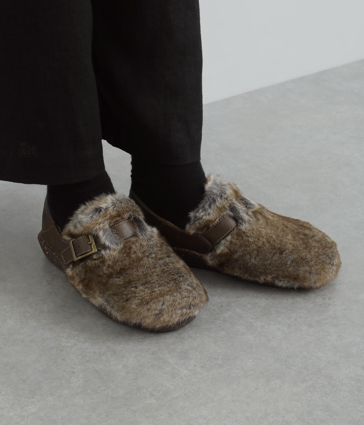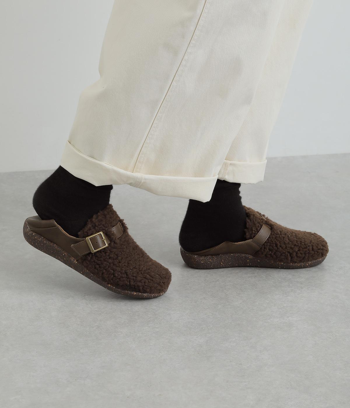 ボアやファーをあしらった季節感たっぷりのアイテムです。踵部分やベルトには上品なフェイクレザーを使用。コルクのような見た目がおしゃれな合成底にも注目です。