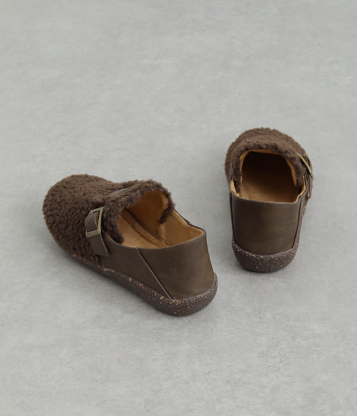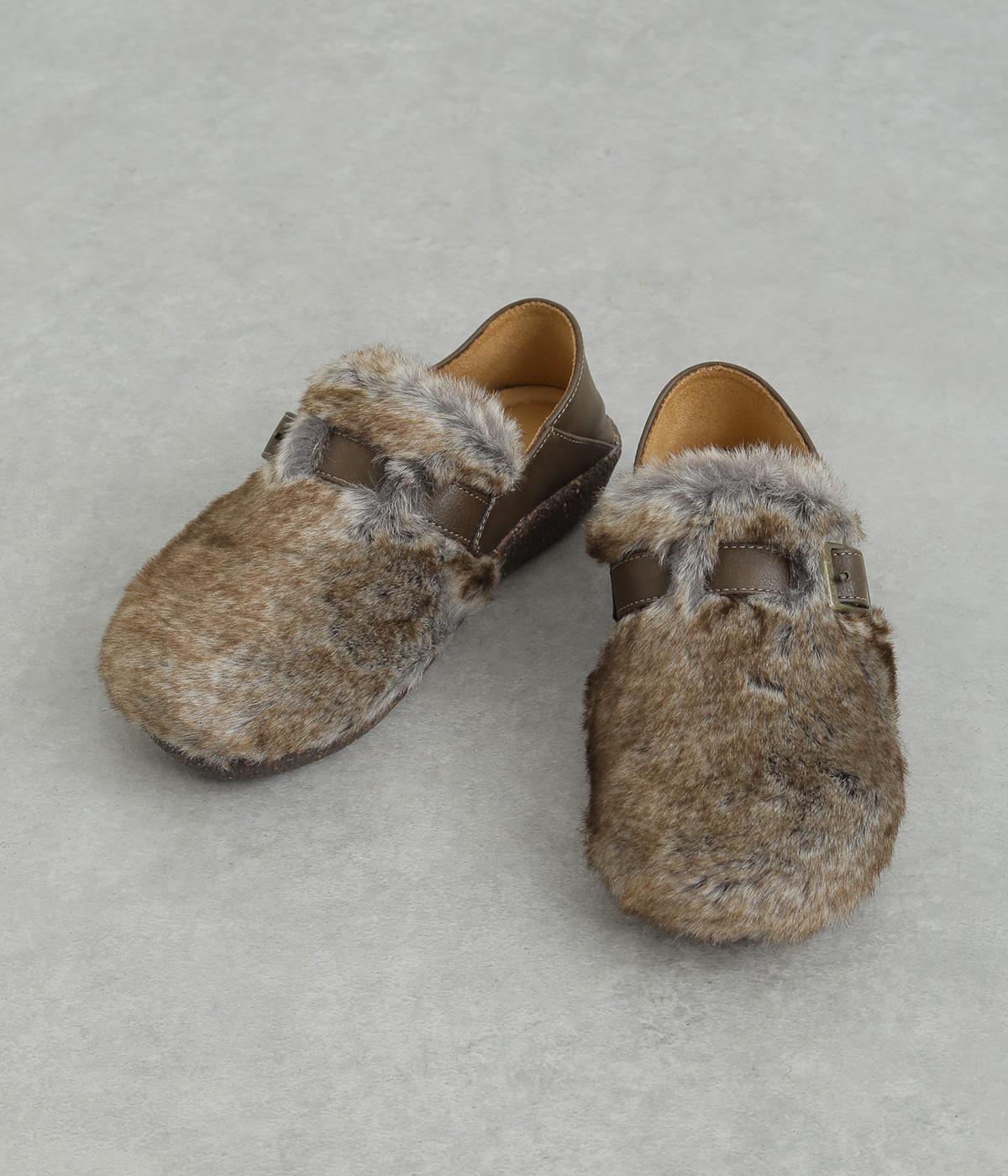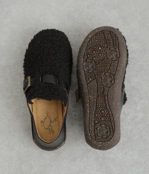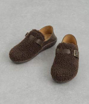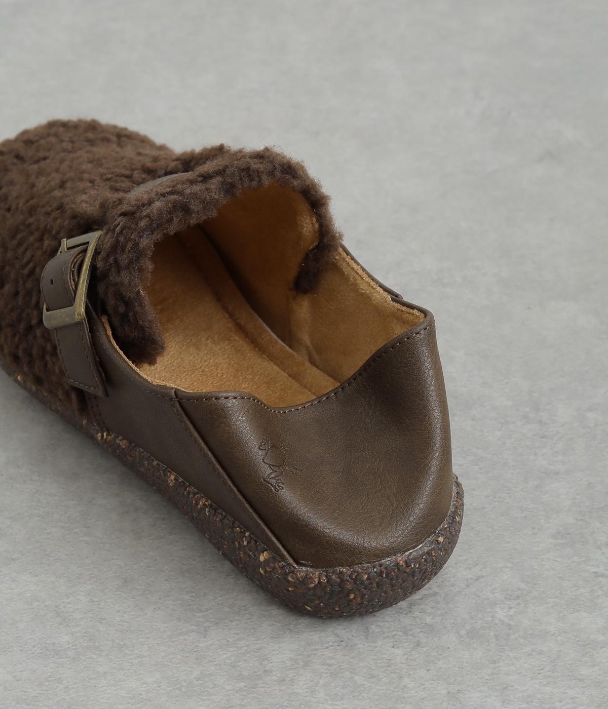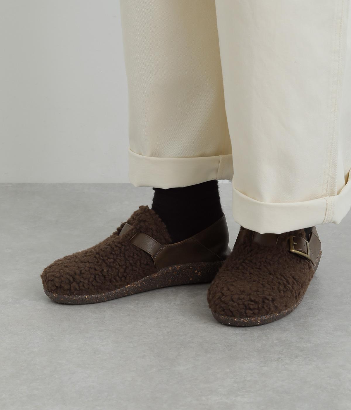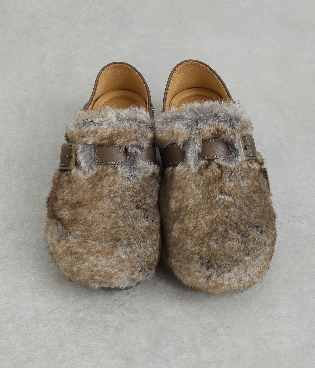 ボアやファーをあしらった季節感たっぷりのアイテムです。踵部分やベルトには上品なフェイクレザーを使用。コルクのような見た目がおしゃれな合成底にも注目です。