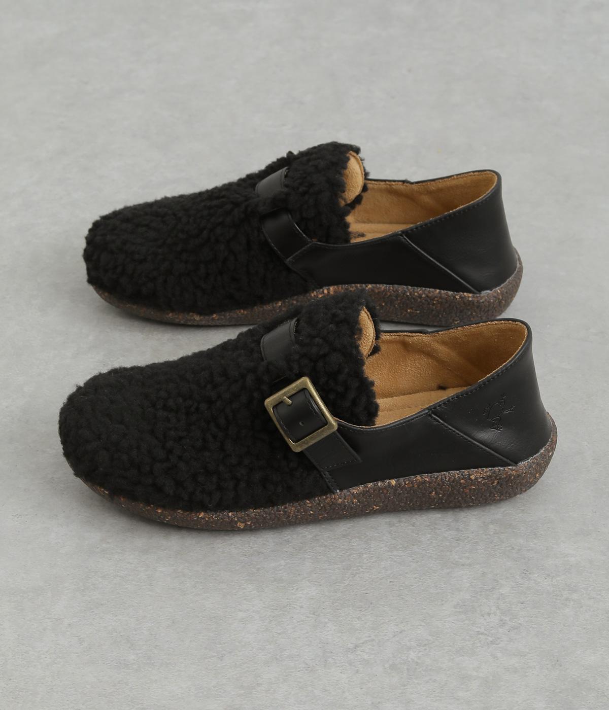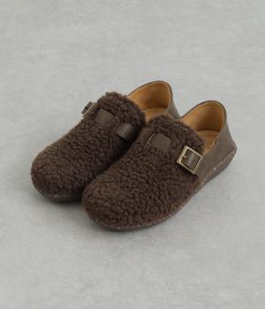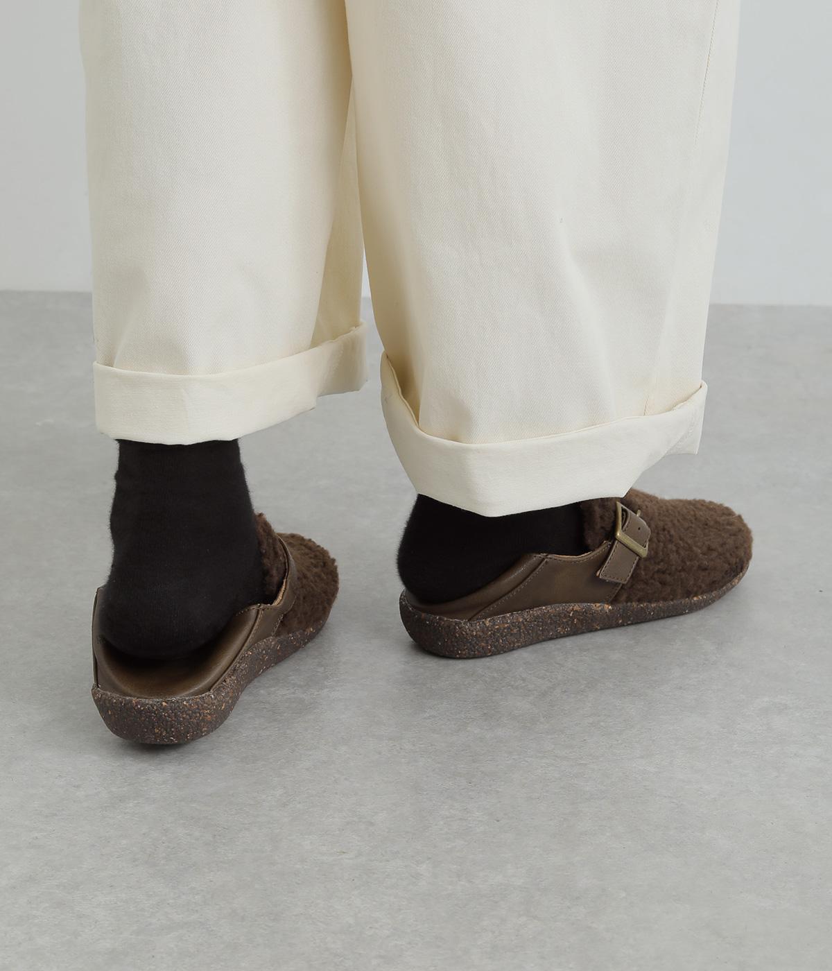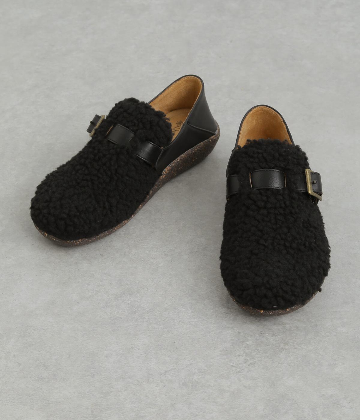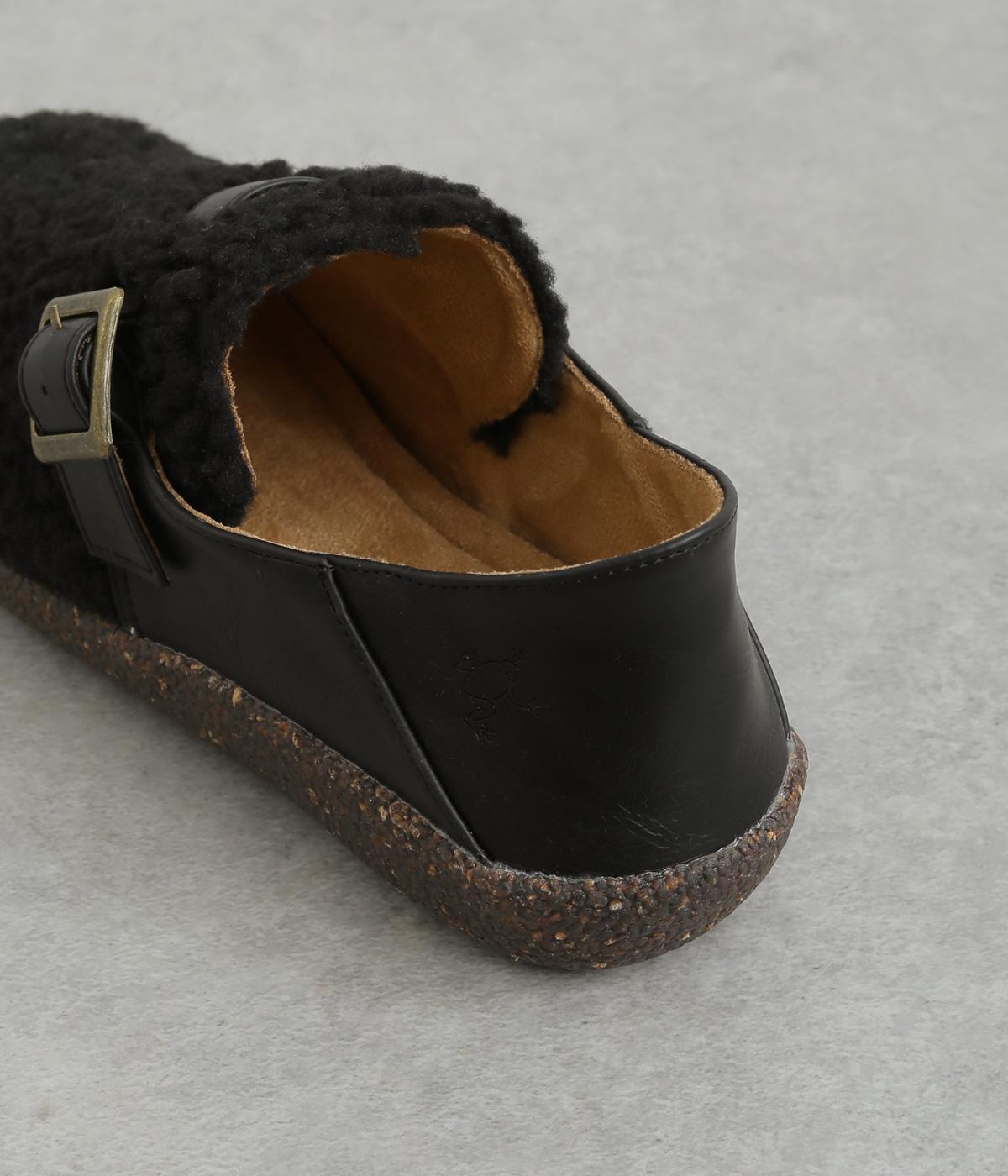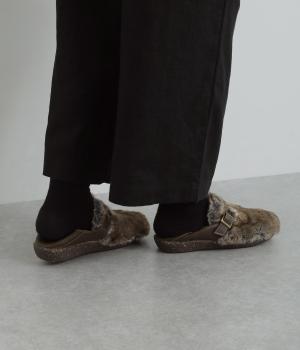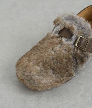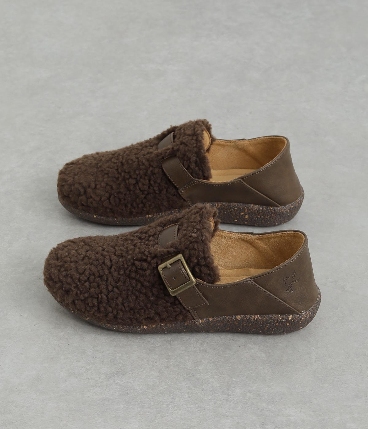 ボアやファーをあしらった季節感たっぷりのアイテムです。踵部分やベルトには上品なフェイクレザーを使用。コルクのような見た目がおしゃれな合成底にも注目です。