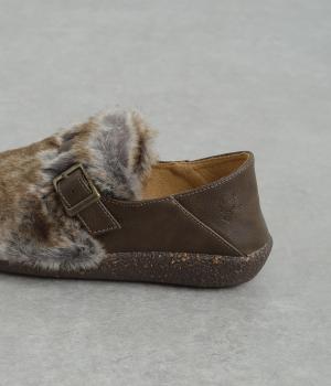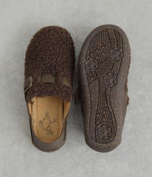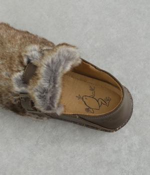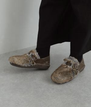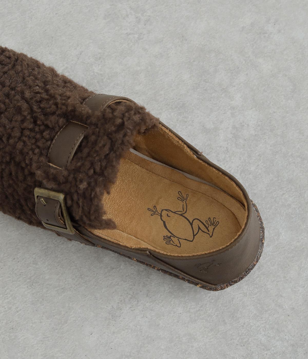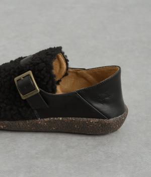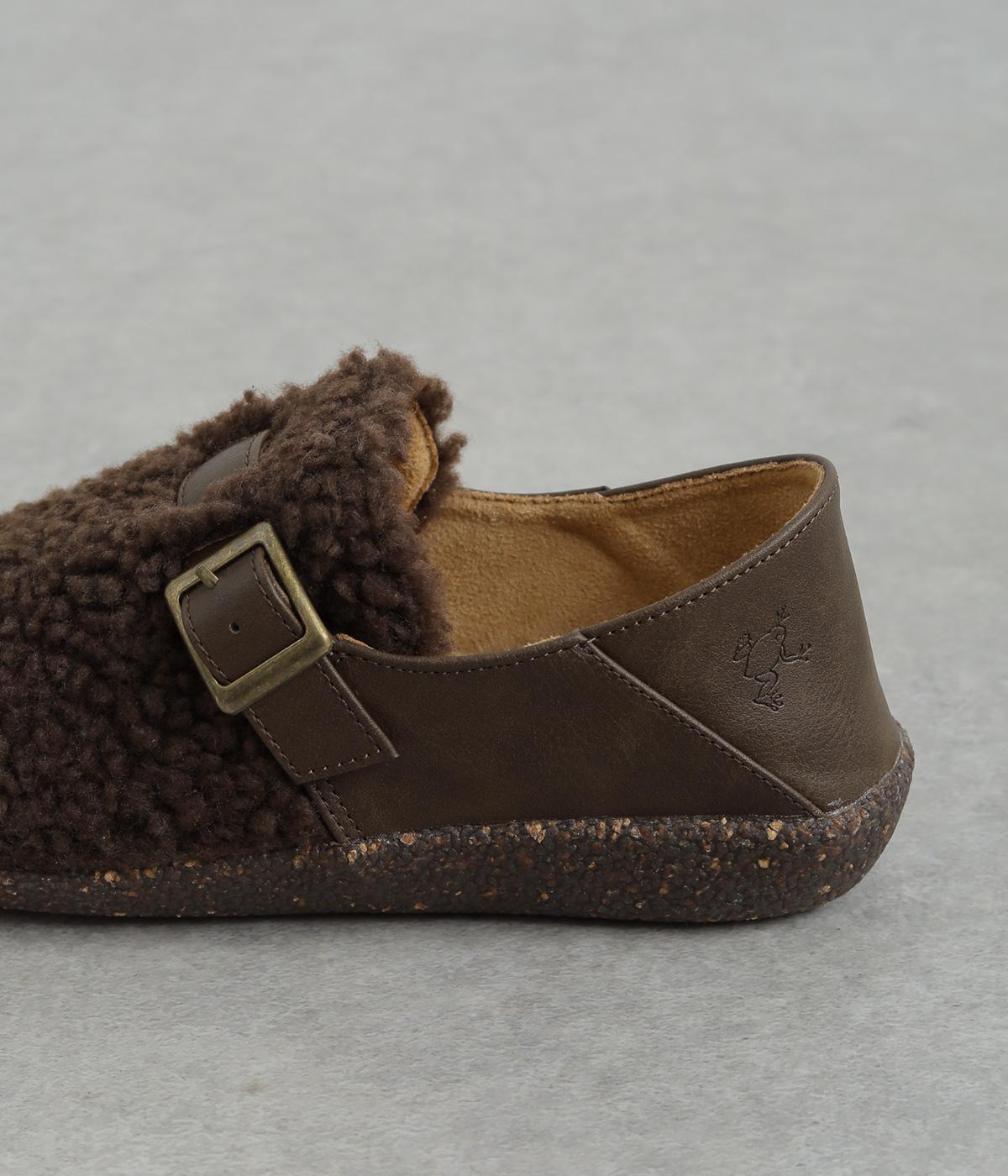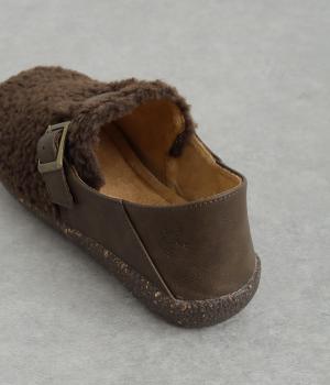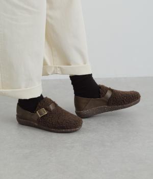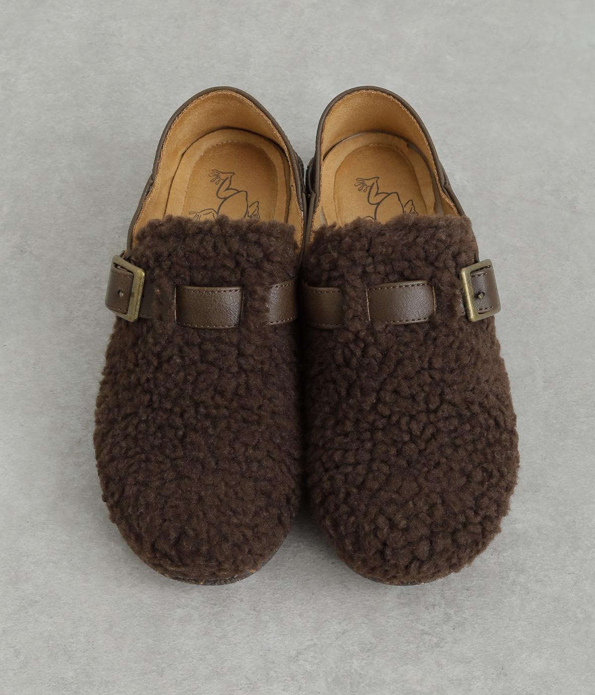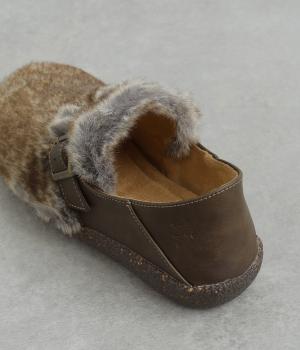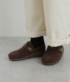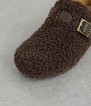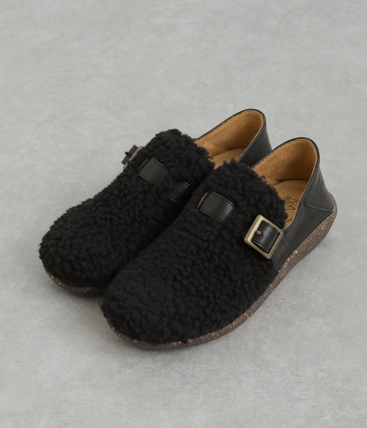 ボアやファーをあしらった季節感たっぷりのアイテムです。踵部分やベルトには上品なフェイクレザーを使用。コルクのような見た目がおしゃれな合成底にも注目です。
