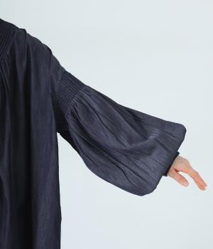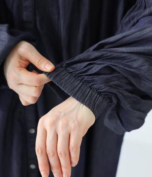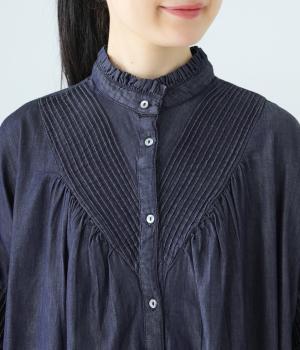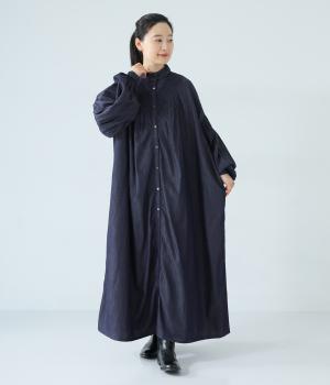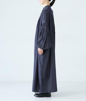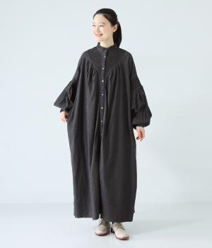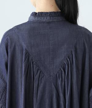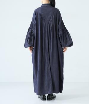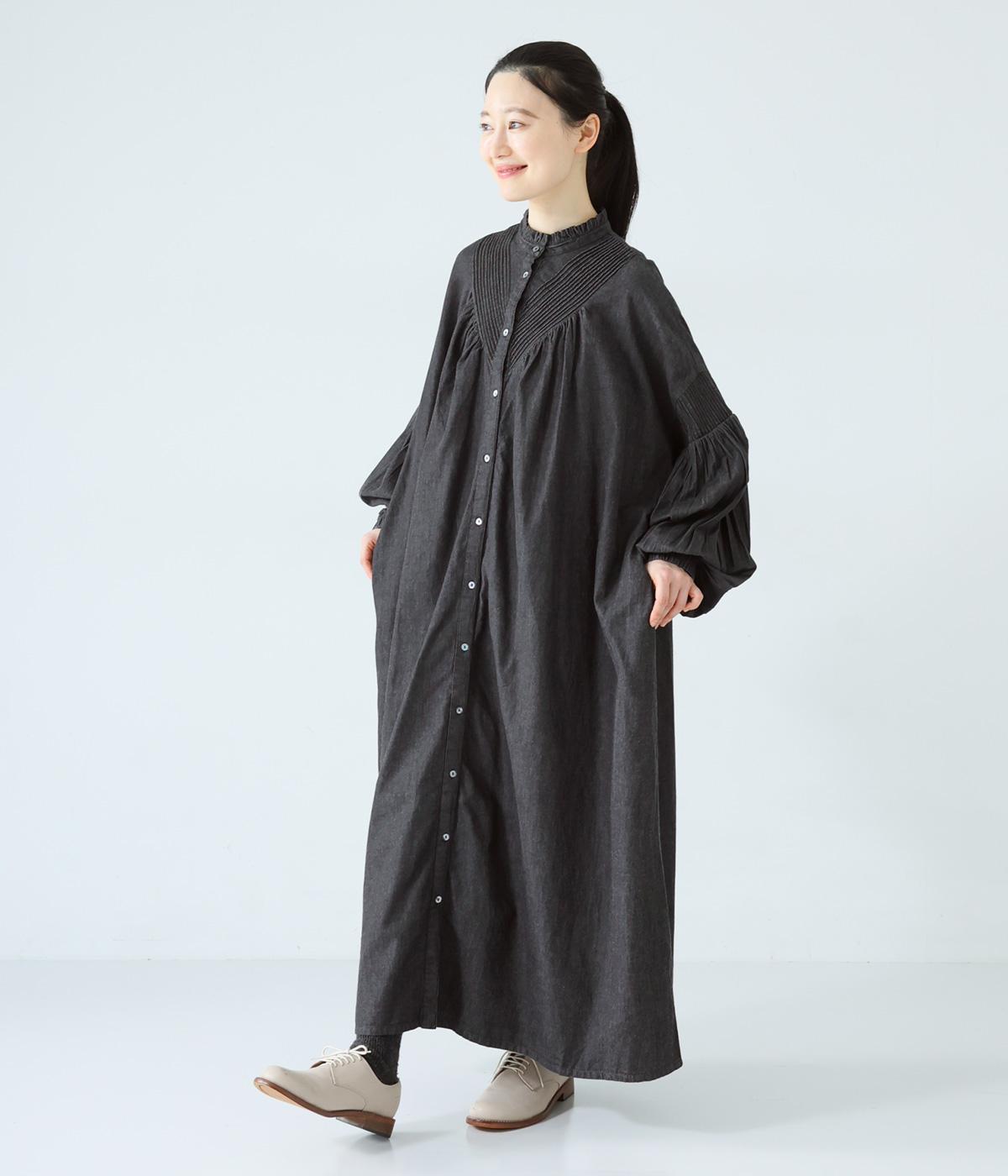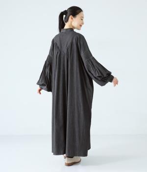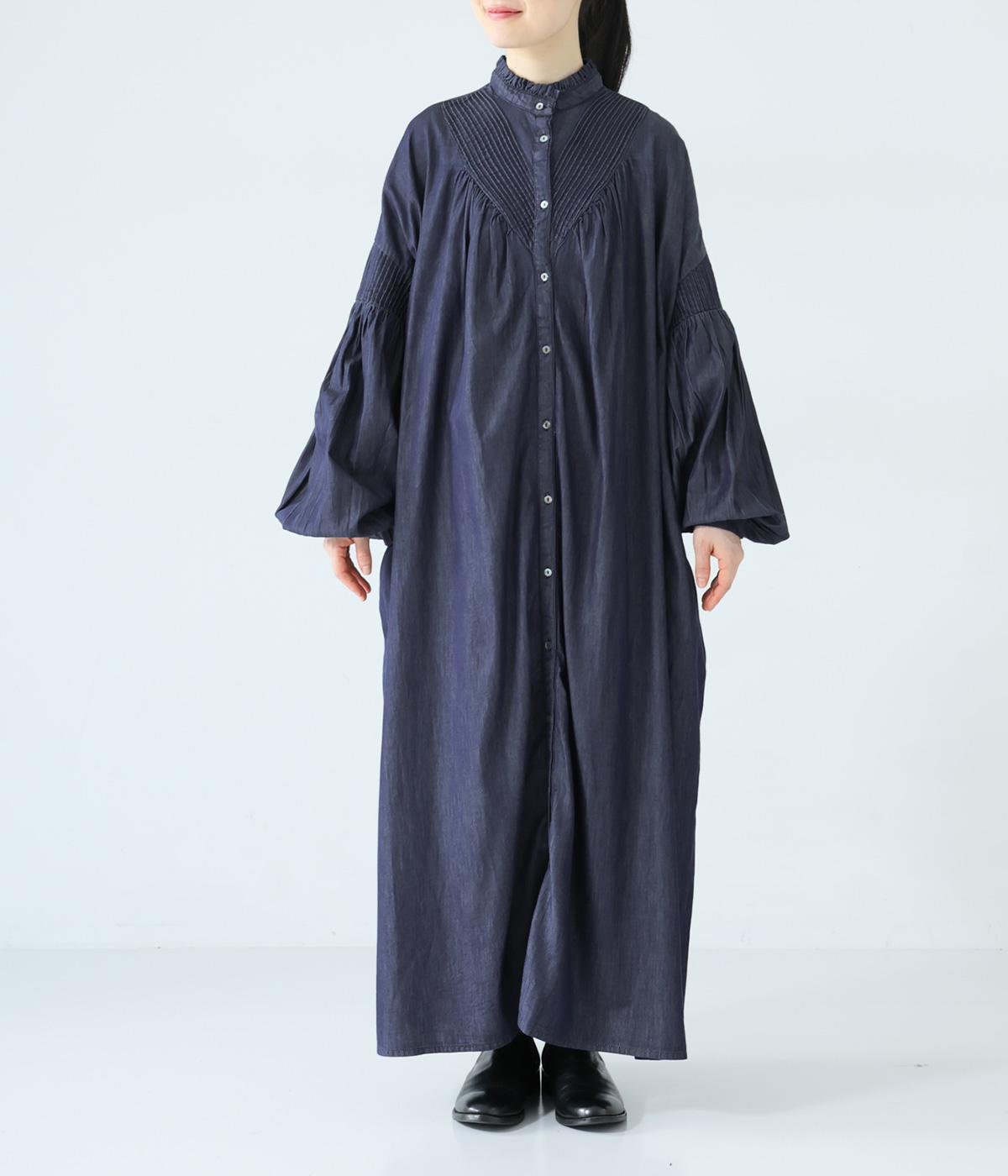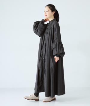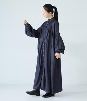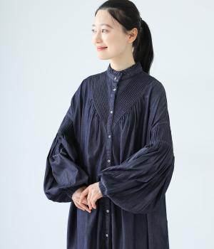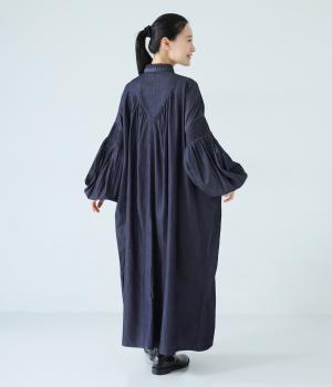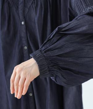 前後の身頃と袖にギャザーを入れ生地を贅沢に使用したワンピース。やわらかな生地感が横への広がりをおさえ、きれいなドレープを表現してくれます。首元の控えめなフリルが顔まわりを愛らしい印象に。前ヨークや袖ぐりの細かなピンタックにも注目です。