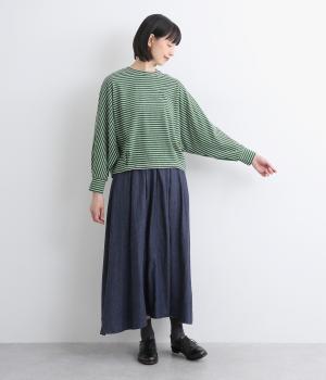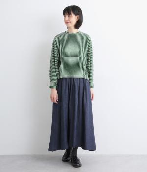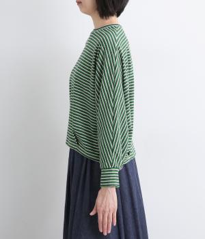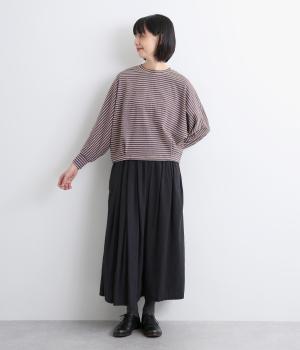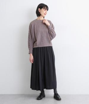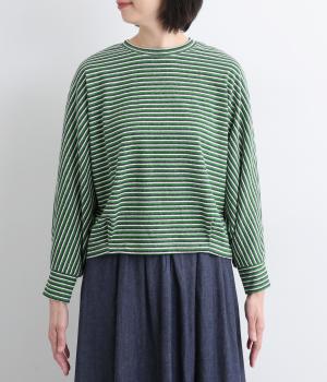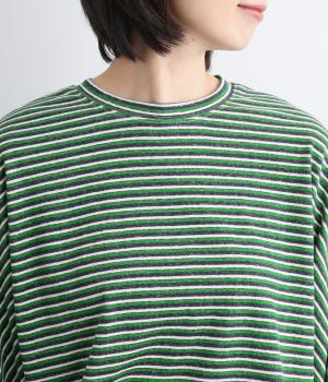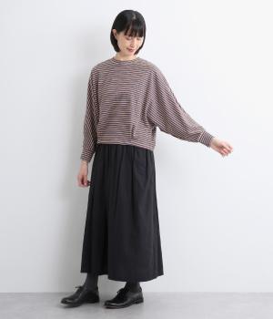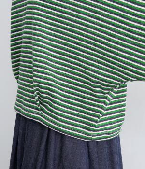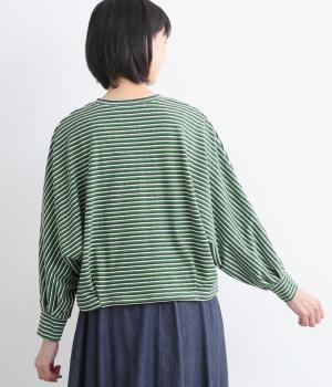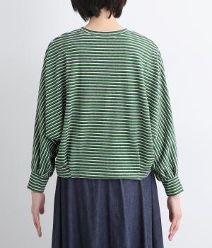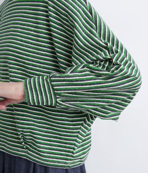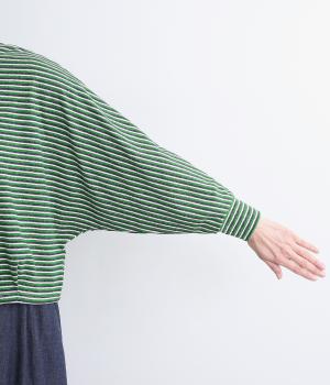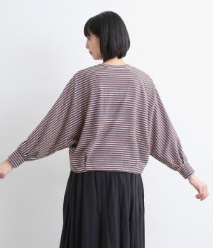 身頃つづきのゆったりとしたドルマンスリーブにマルチボーダー柄で着こなしのポイントになる一枚。コンパクトな着丈に裾タックですっきりとまとめています。袖口切り替えもメリハリのあるワンポイントです。