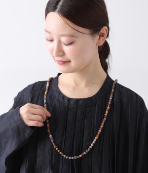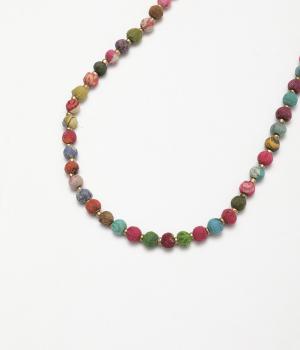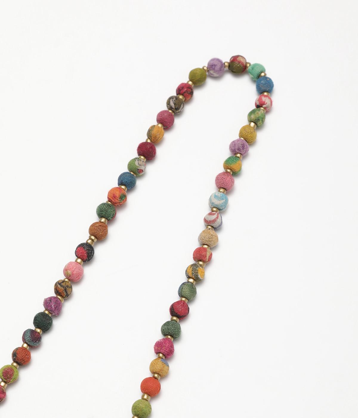 ラリーキルトを用いた色鮮やかなネックレス。小さなゴールドカラーのビーズを組み合わせてアクセントにしています。細めなので、カラフルながらも派手になりすぎないのが魅力です。