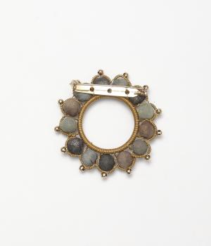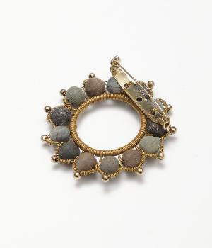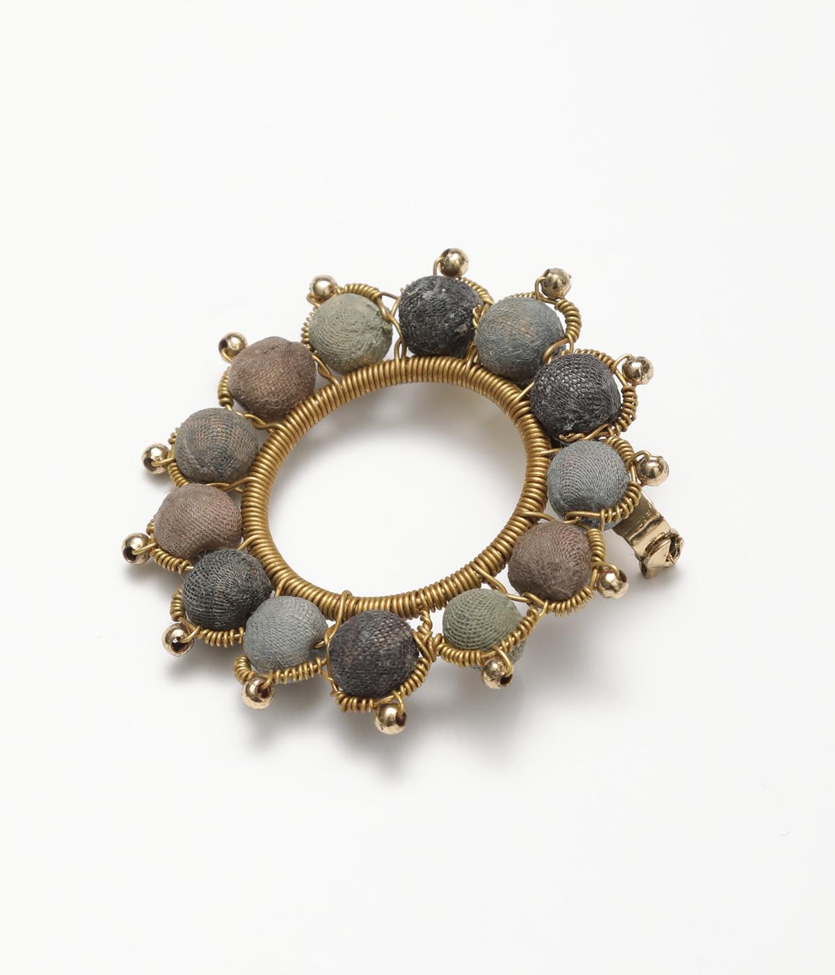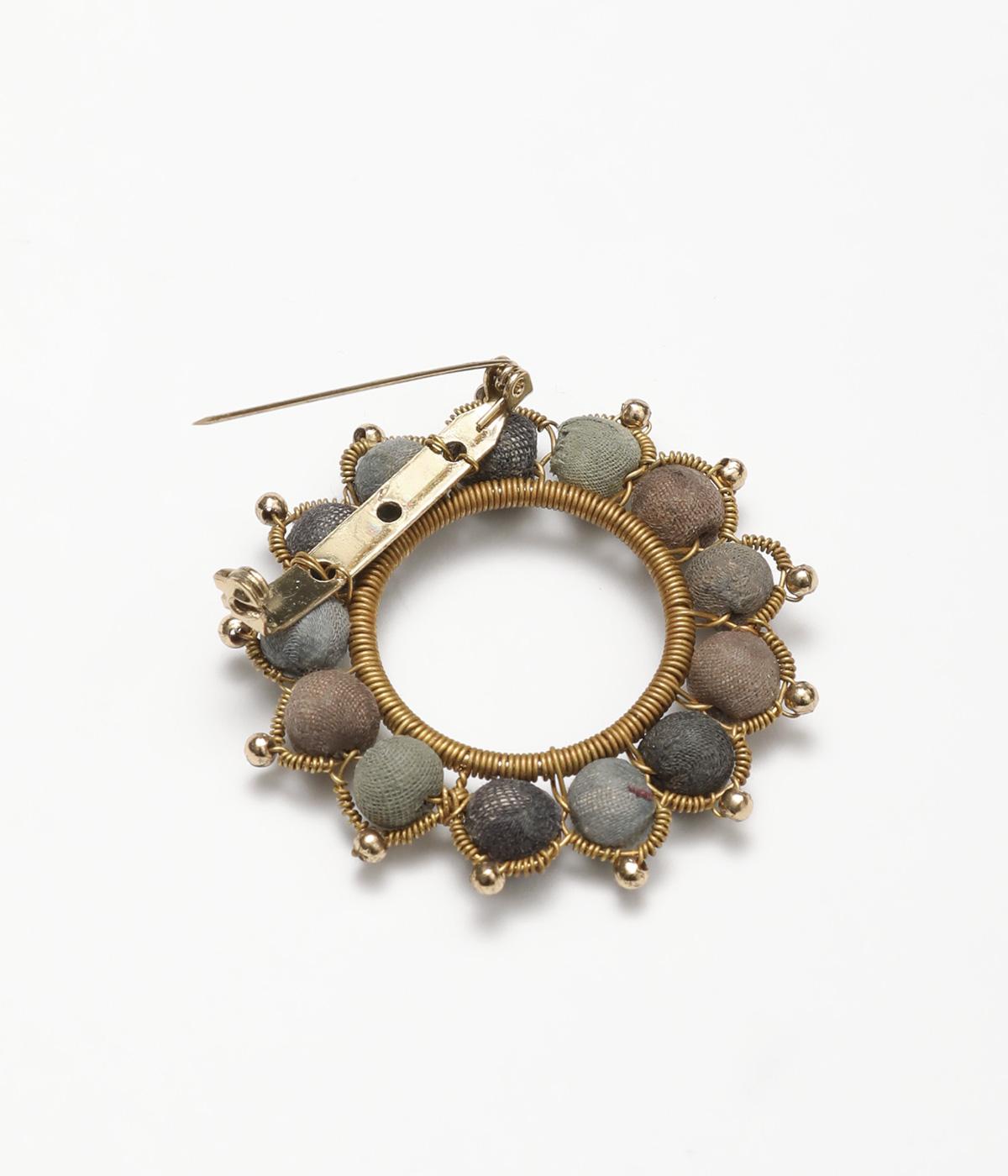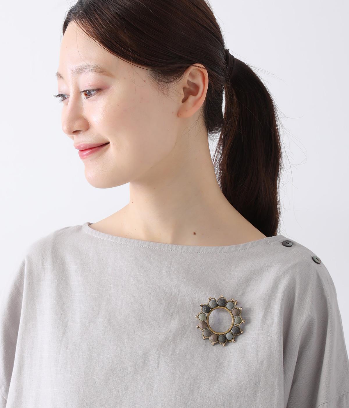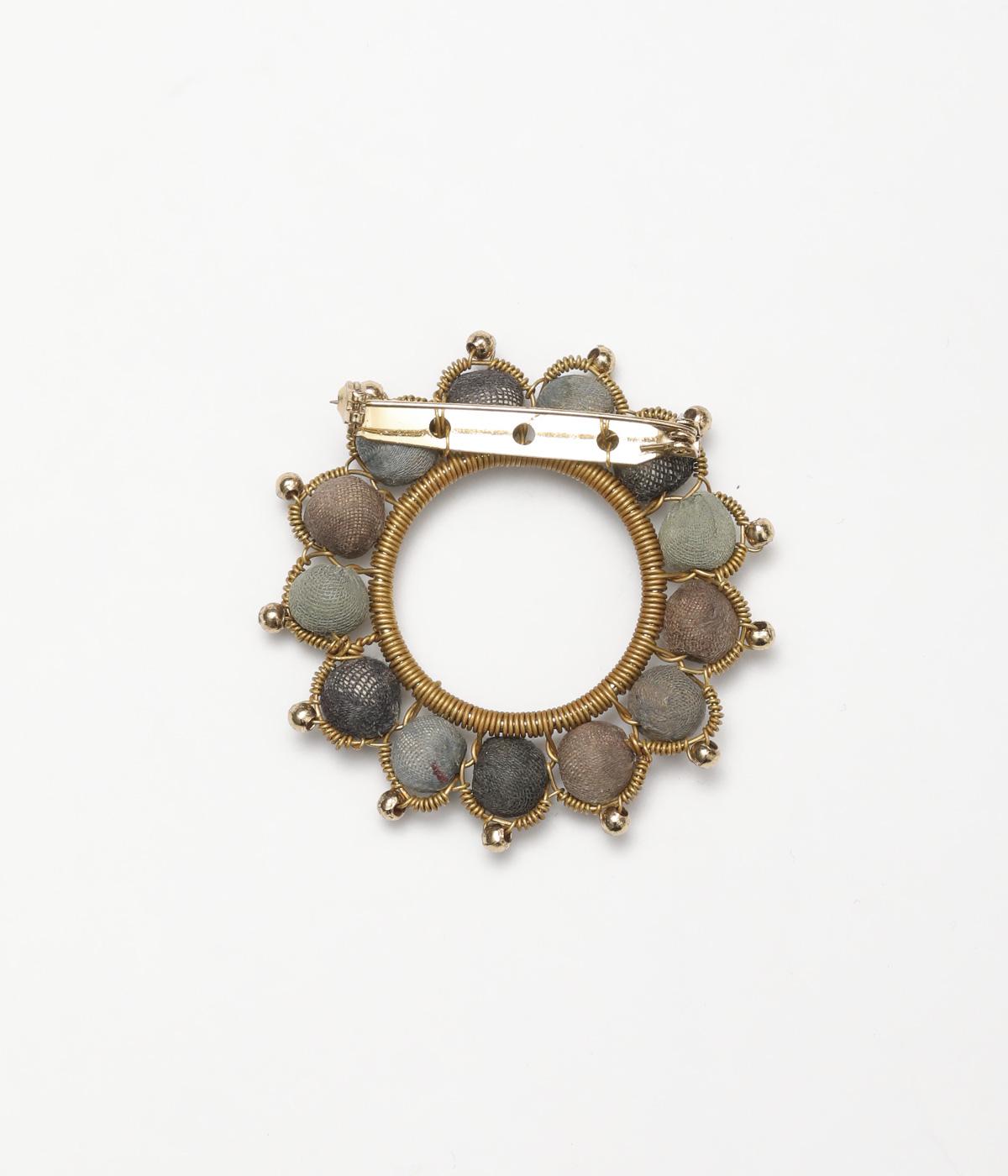ワイヤーを用いてラリーボールをサークル状に並べたクラフト感あふれるブローチ。シックなモノトーンカラーが大人な雰囲気をただよわせ、さまざまな装いになじみやすいのが魅力です。回転式のブローチピンで針をロックできるので、安心してつけられるのもうれしいポイント。