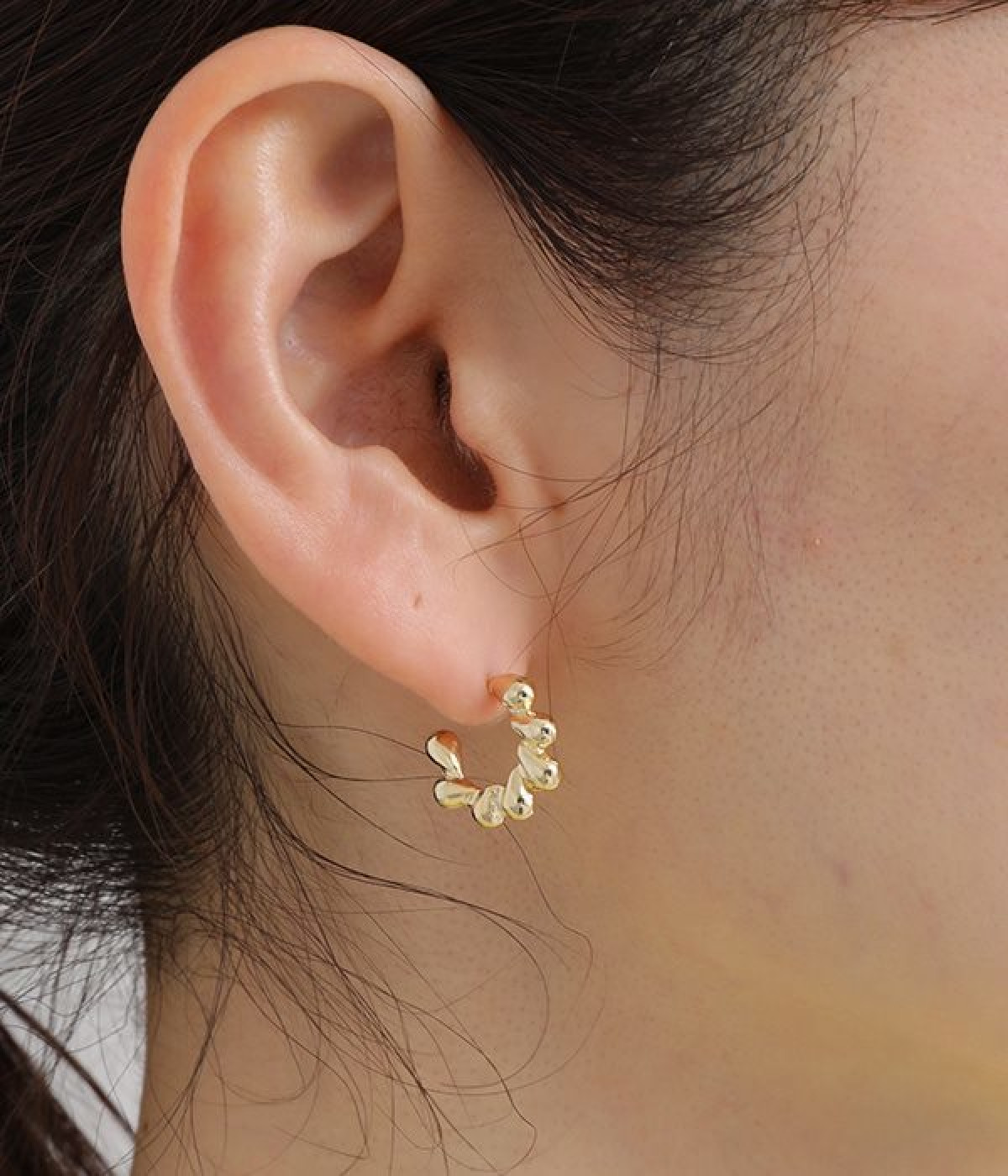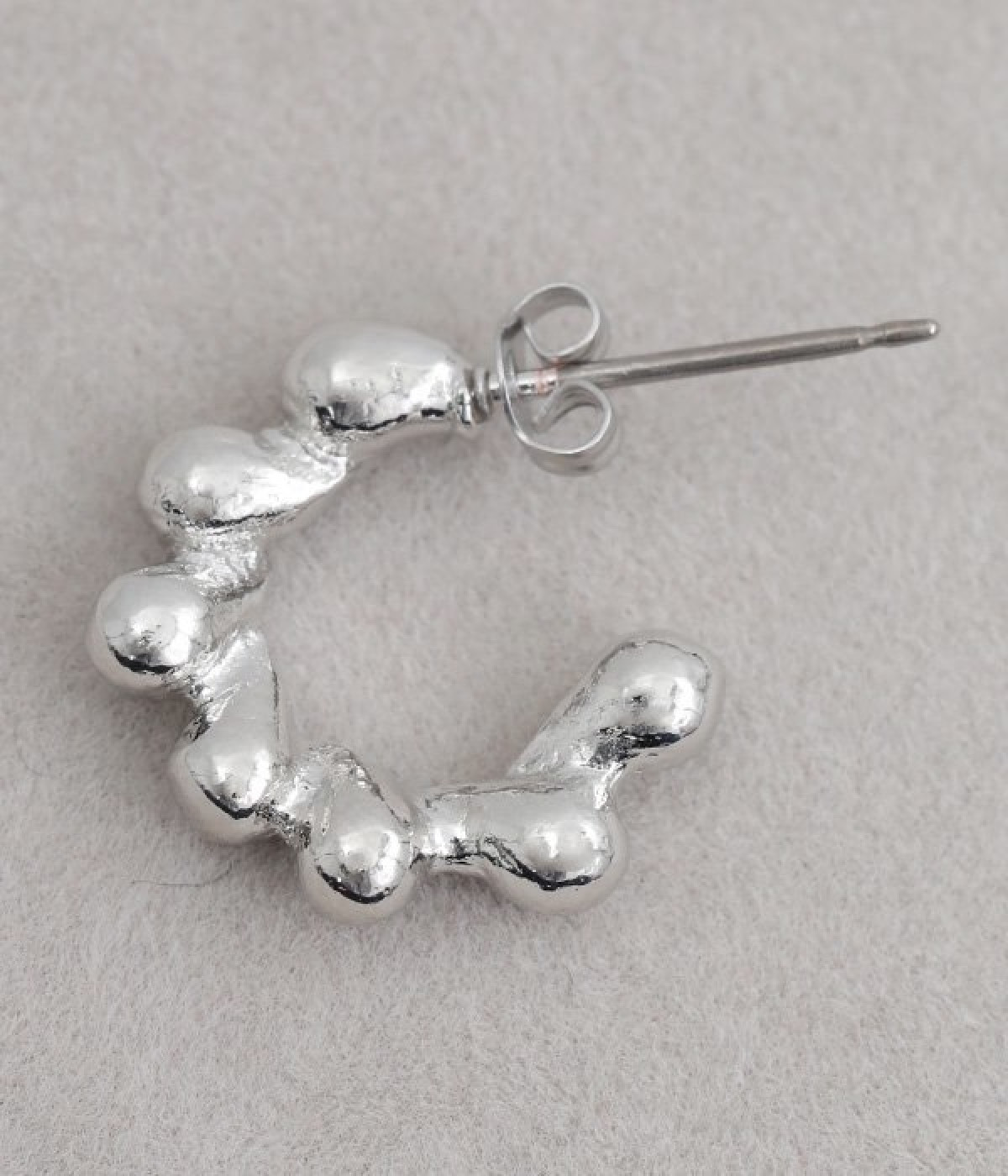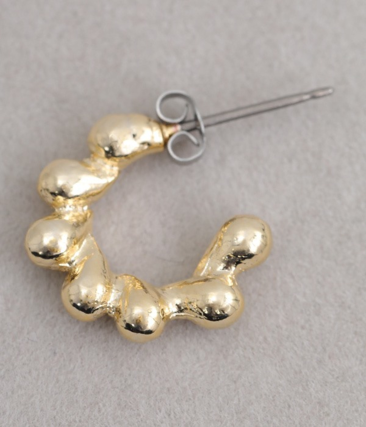 凹凸のある小ぶりなフープデザインが愛らしいピアスです。さりげなく耳に寄り添うデザインで、顔まわりを華やかに彩ります。シンプルなデザインなので、お手持ちのイヤーカフやピアスとの重ね付けもおすすめです。メタリックカラーが上品で、カジュアルな着こなしに凛とした雰囲気をプラスしてくれます。肌あたりのやさしいニッケルフリーメッキを使用しているのもポイントです。