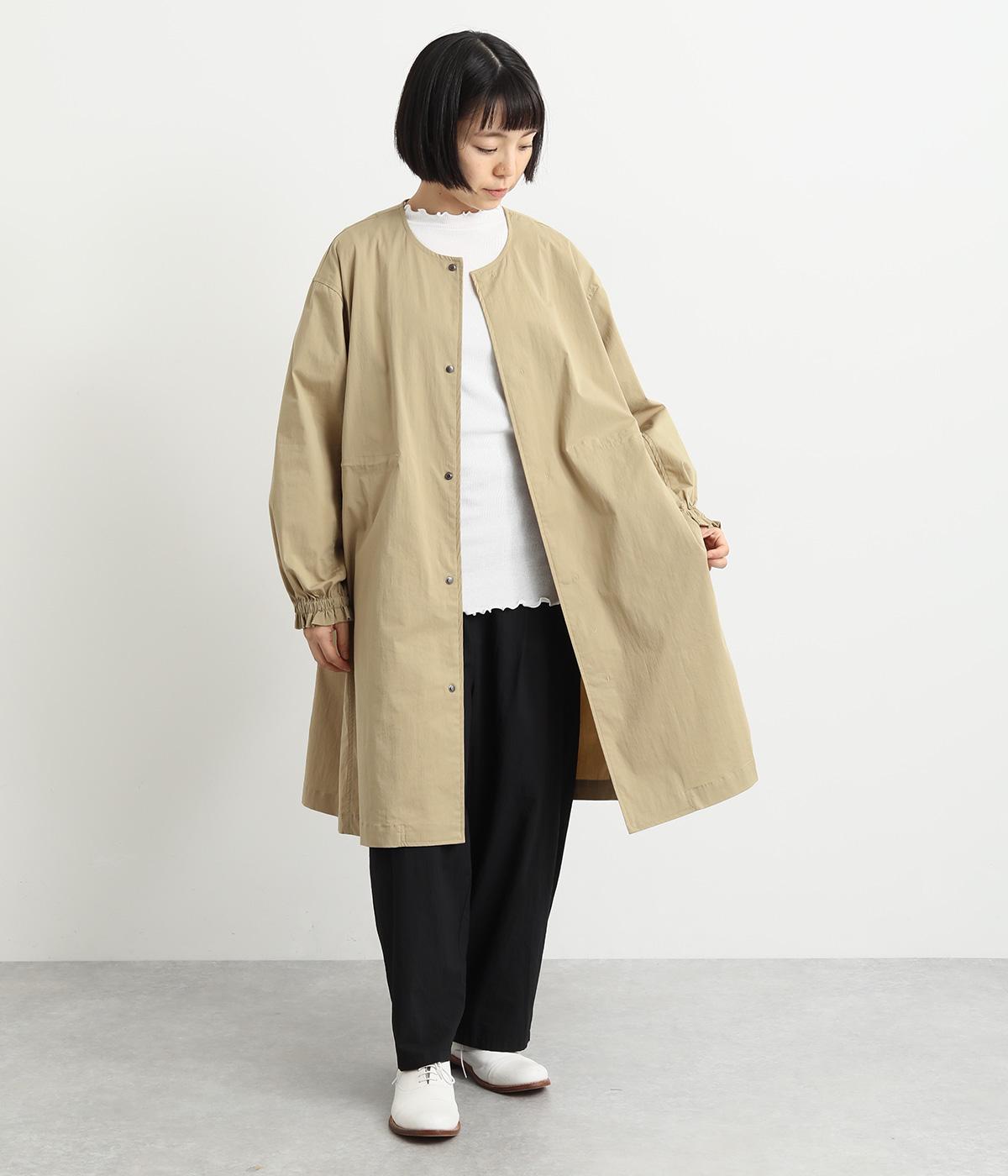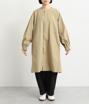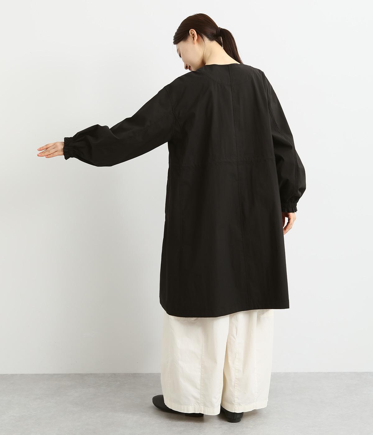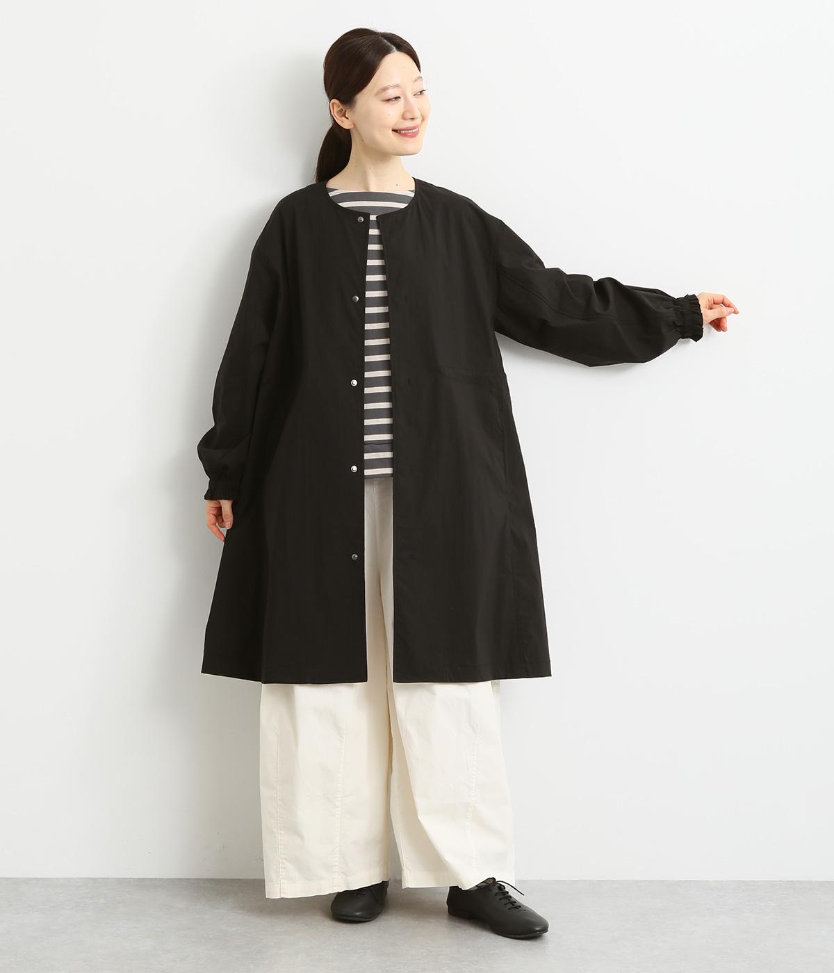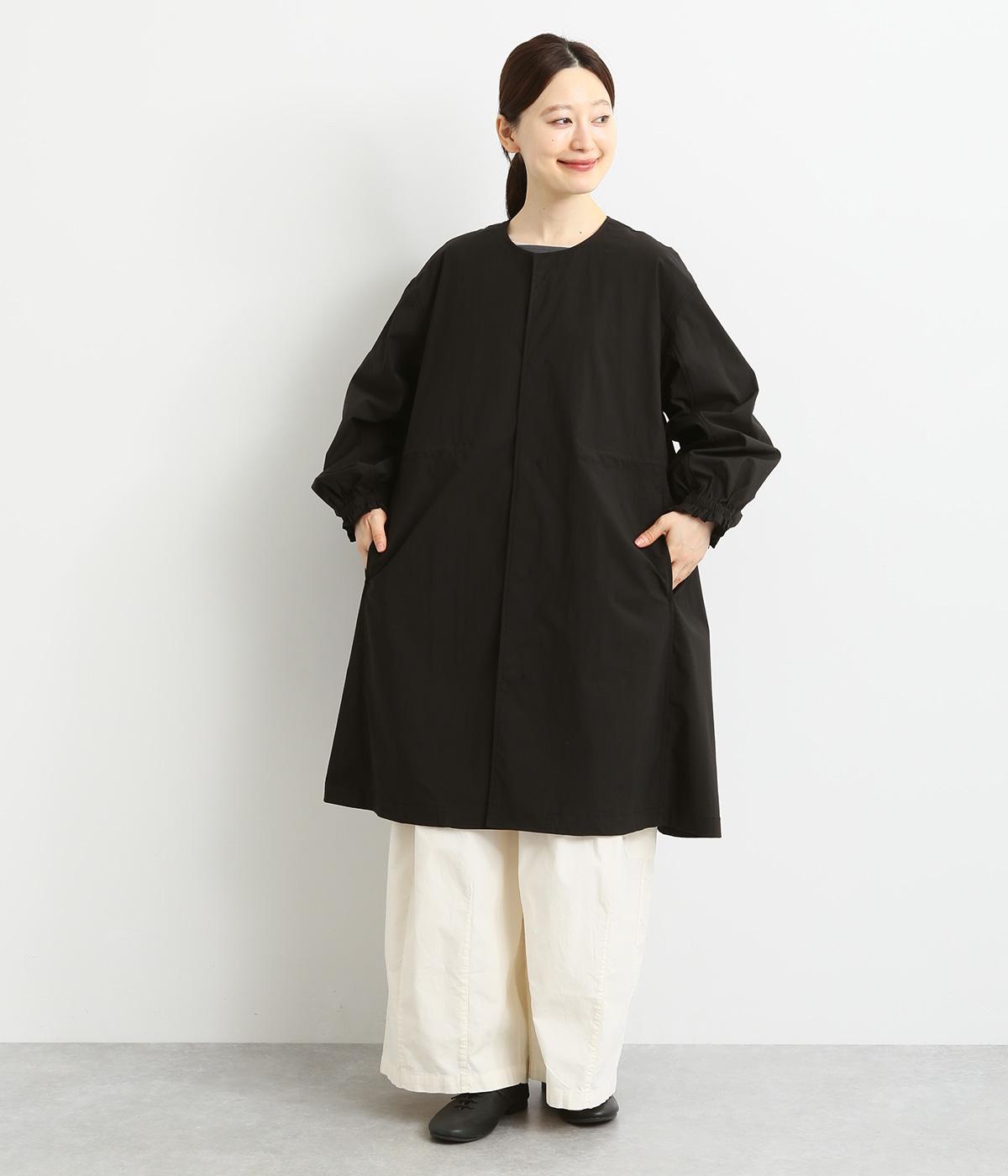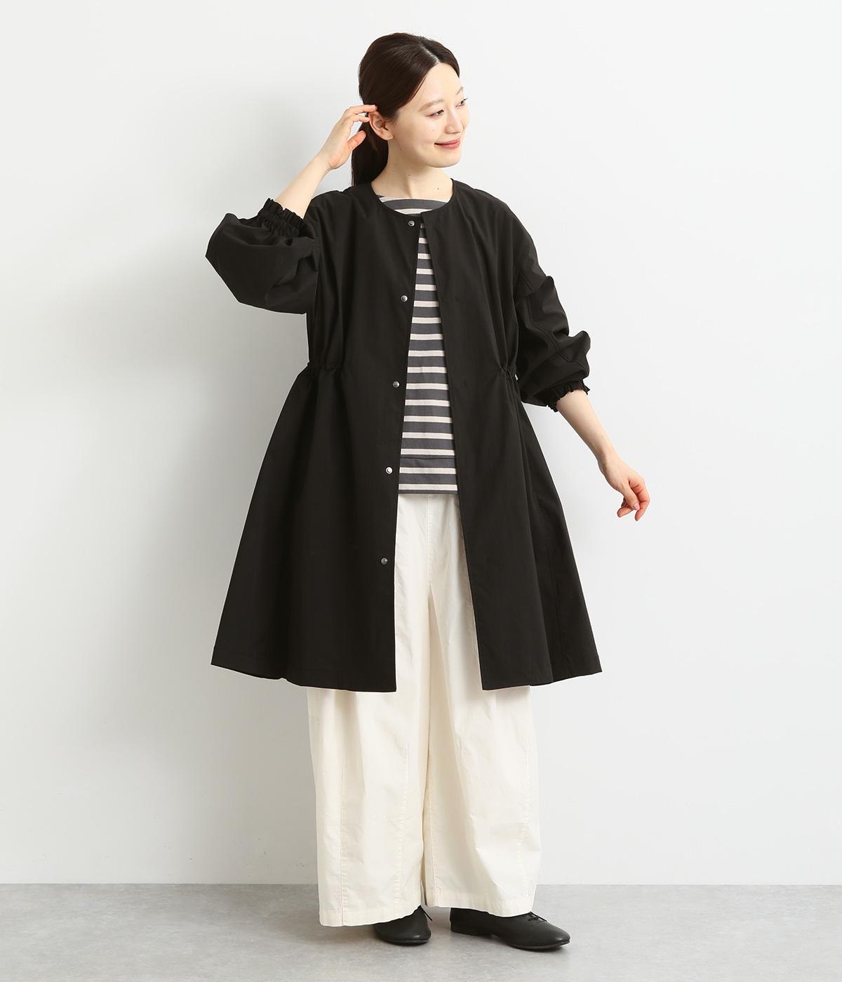 ノーカラーと比翼ボタンですっきりとシンプルな印象のミドル丈コートです。袖口はゴムのシャーリング仕様で、シャツのようにまくし上げても◎。ウエスト裏のドロストコードでシルエットに変化をつけることもできます。
