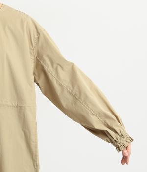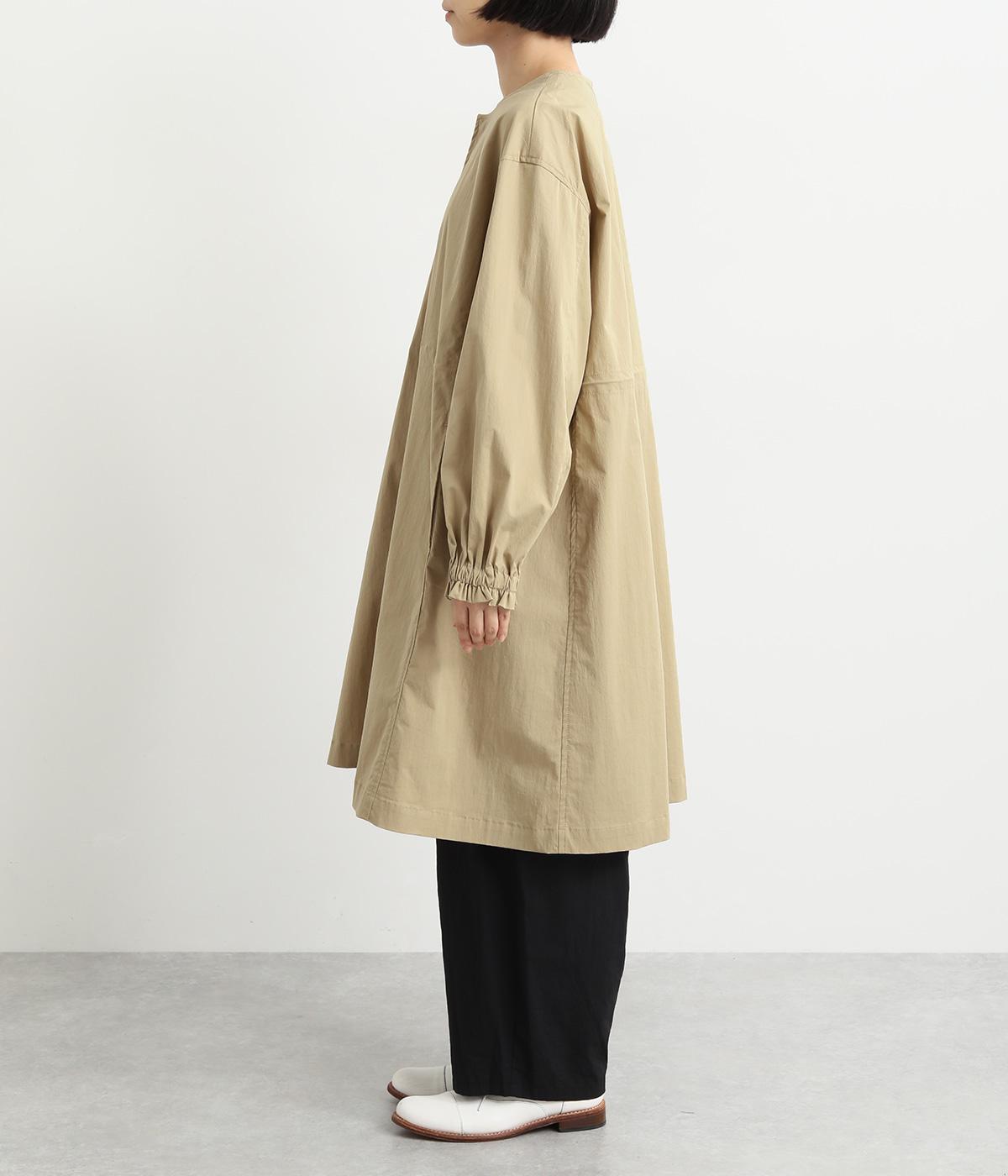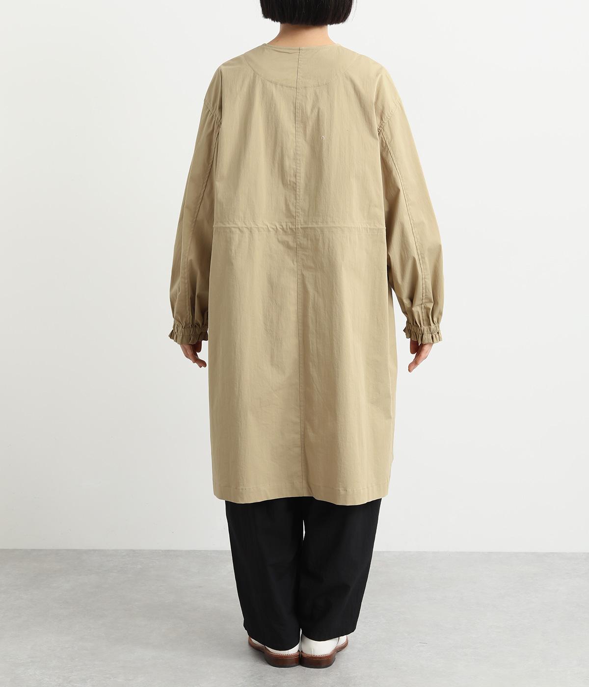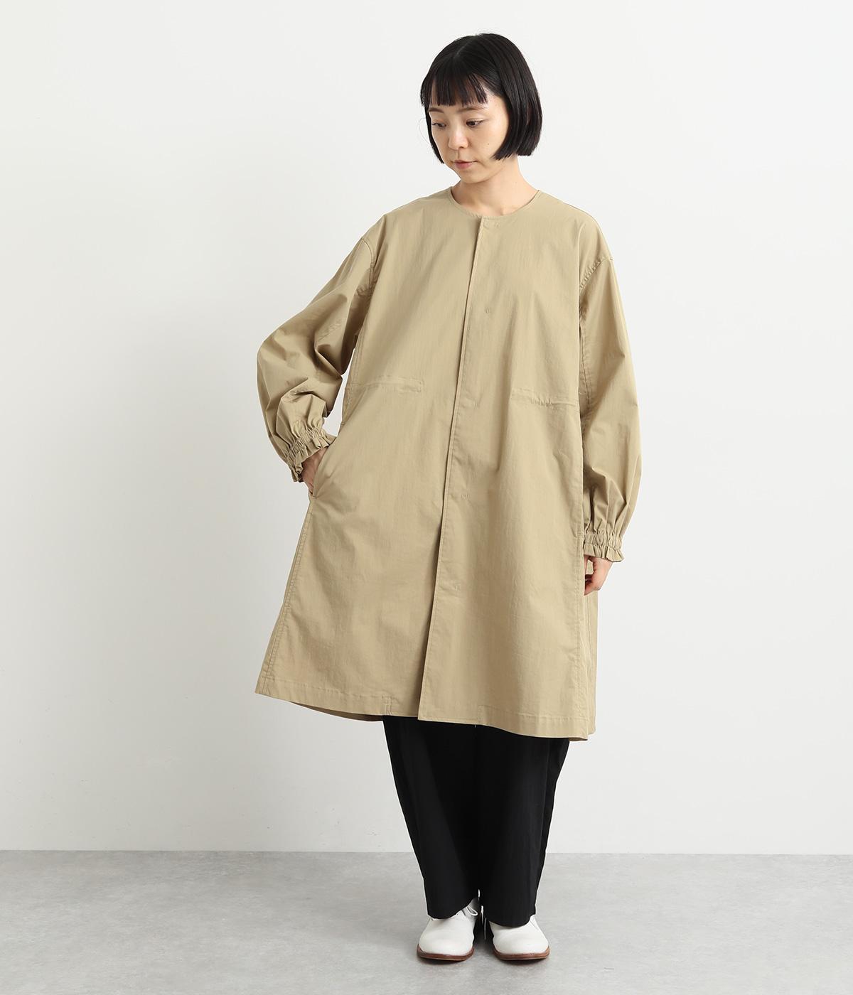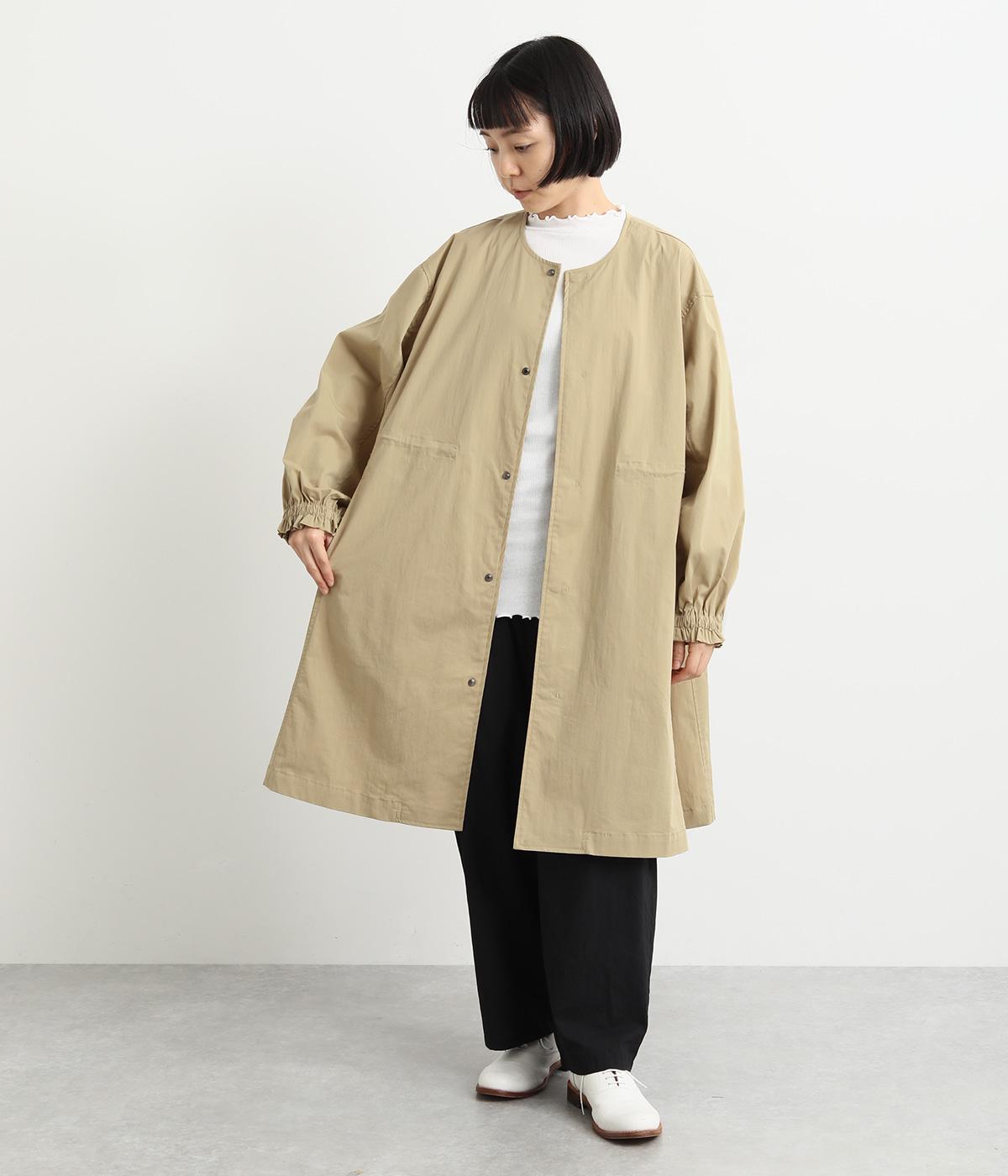 ノーカラーと比翼ボタンですっきりとシンプルな印象のミドル丈コートです。袖口はゴムのシャーリング仕様で、シャツのようにまくし上げても◎。ウエスト裏のドロストコードでシルエットに変化をつけることもできます。