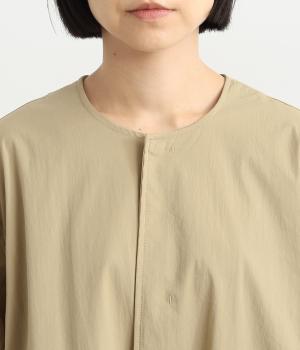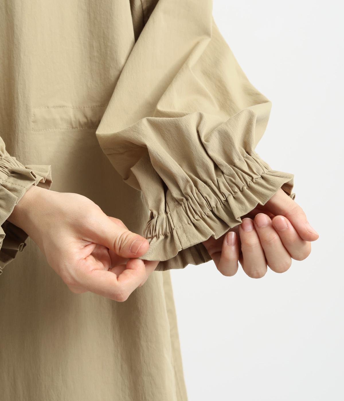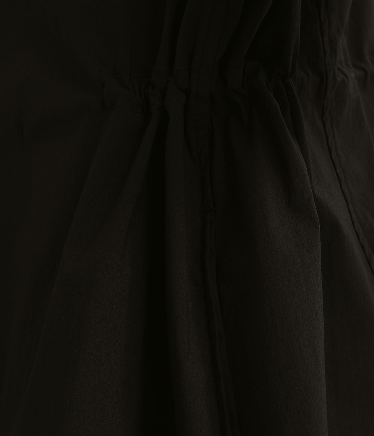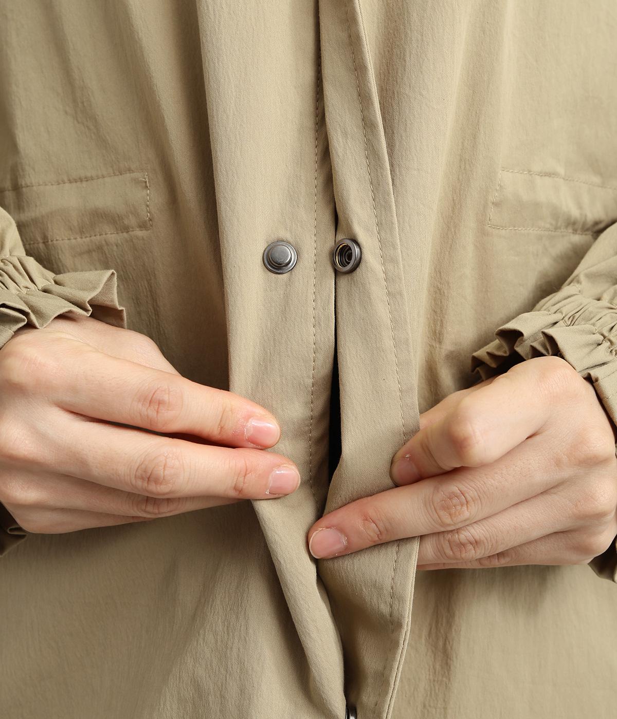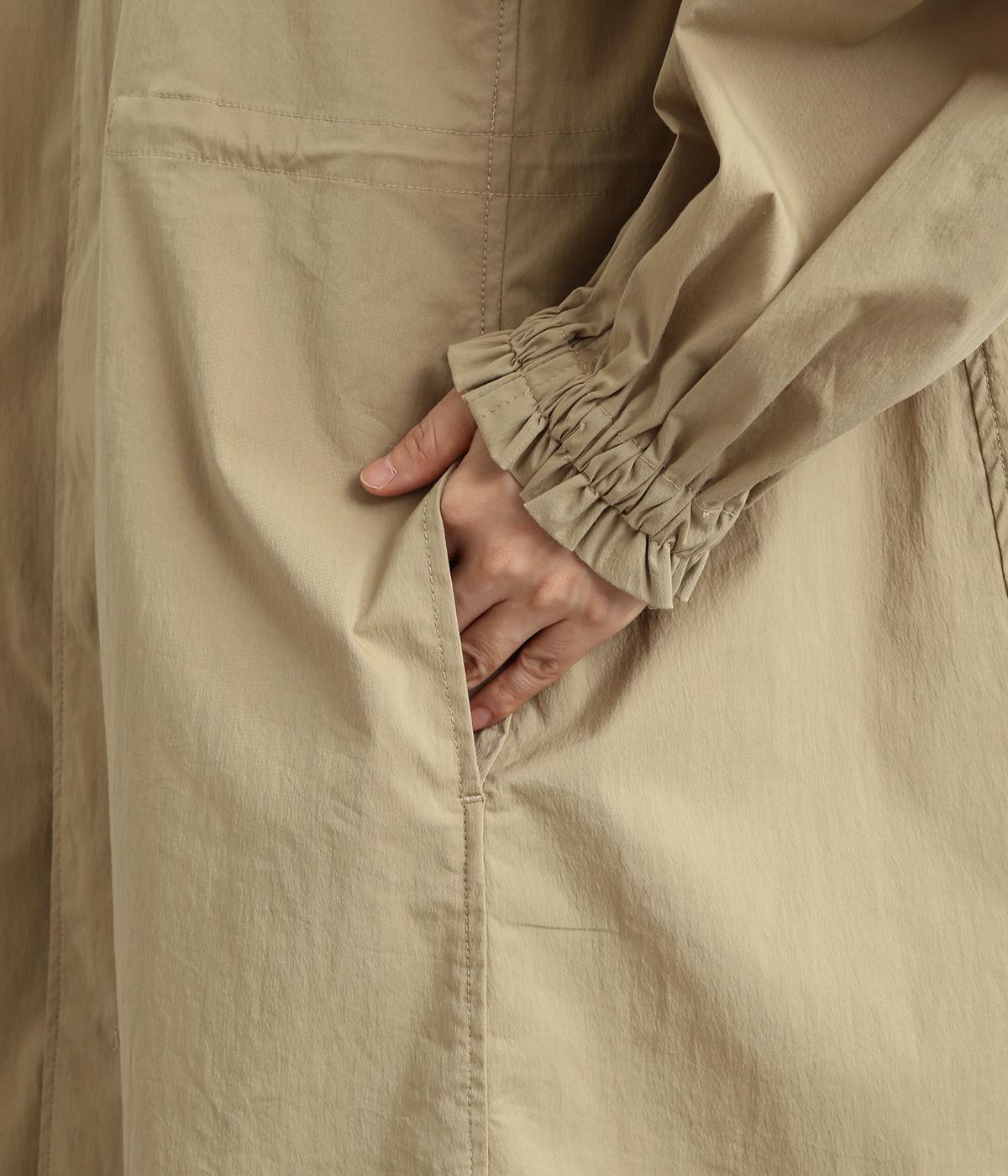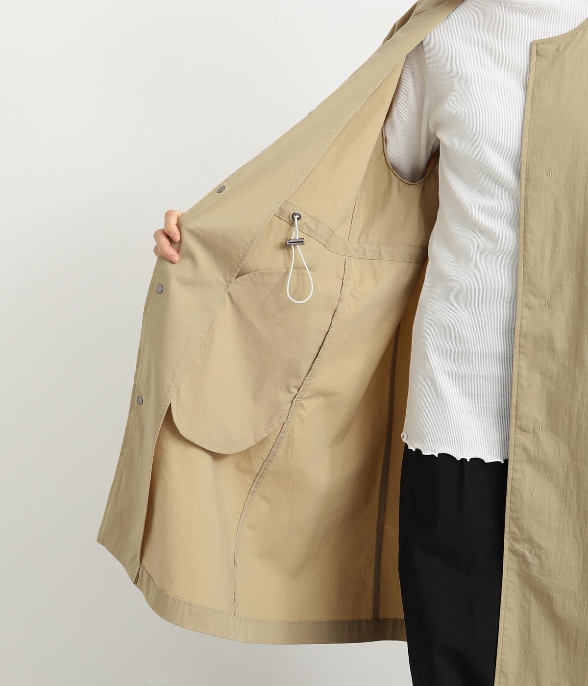 ノーカラーと比翼ボタンですっきりとシンプルな印象のミドル丈コートです。袖口はゴムのシャーリング仕様で、シャツのようにまくし上げても◎。ウエスト裏のドロストコードでシルエットに変化をつけることもできます。