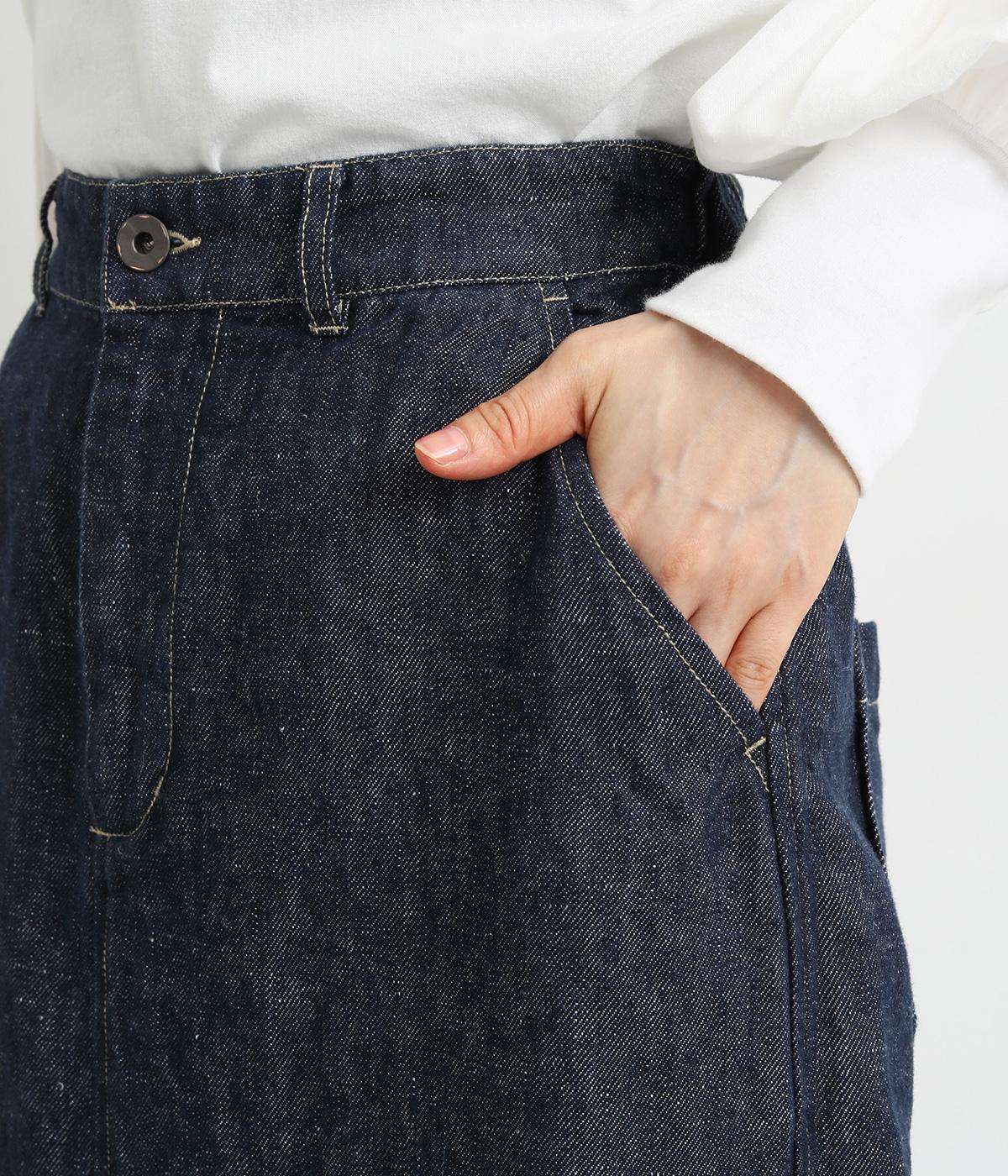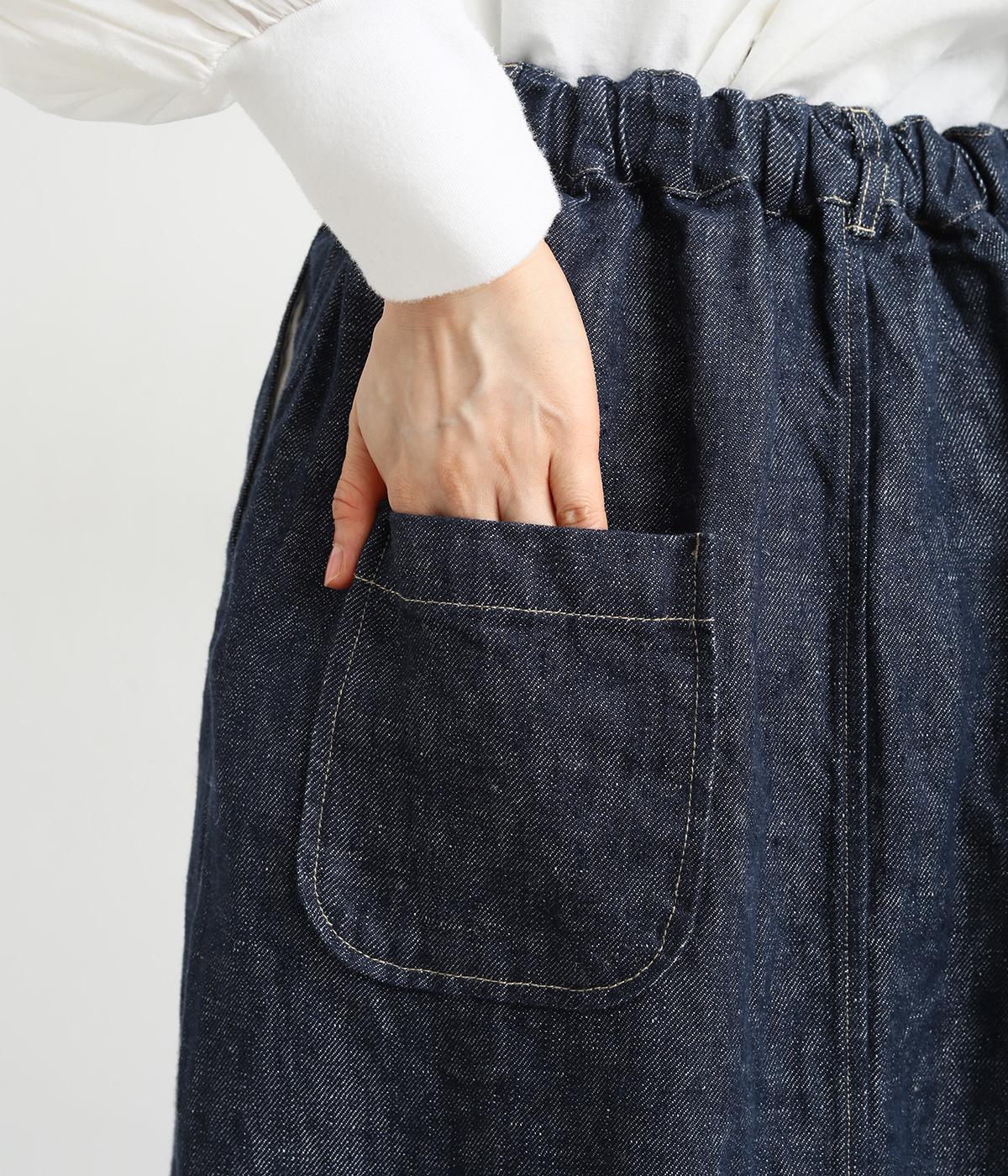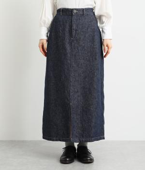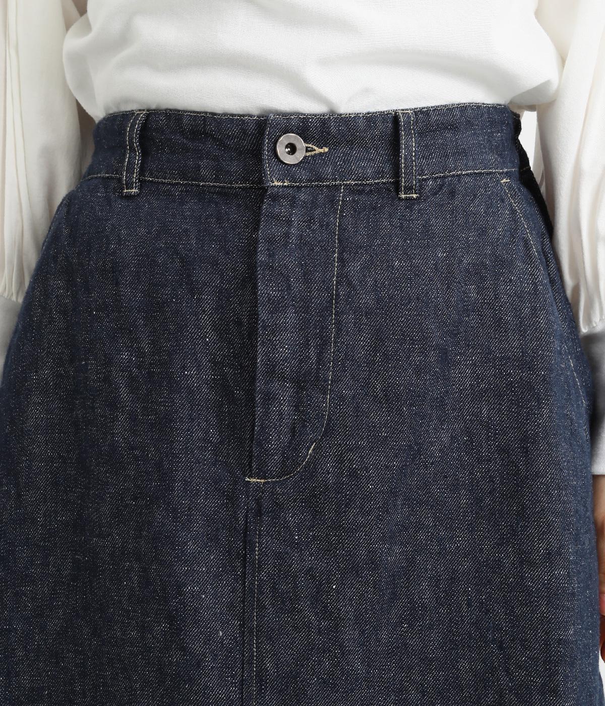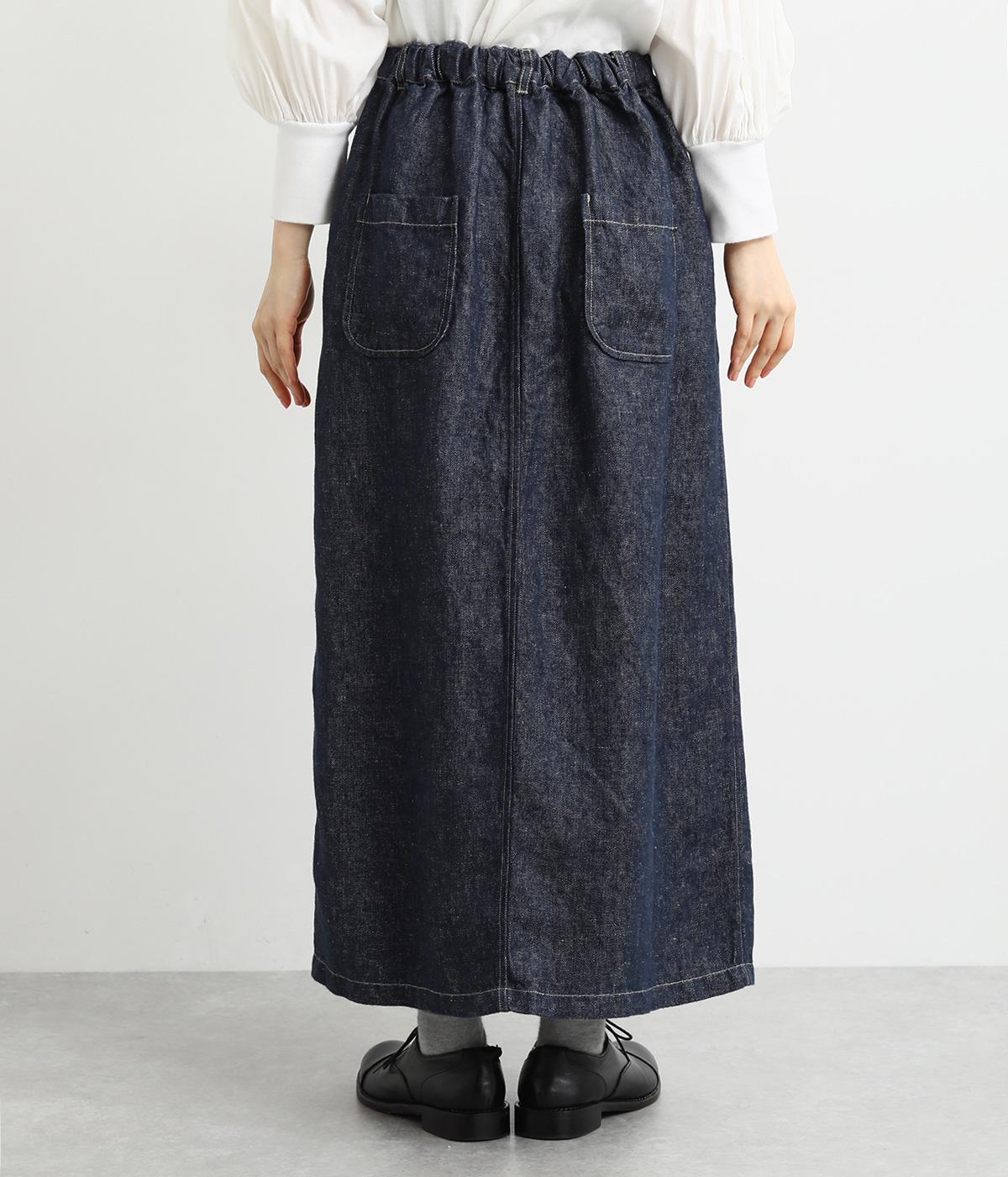 全体的に太番手ステッチを入れて無骨さのある印象ながらも、リネン特有のクラシカルで上質感もあるデニムスカートです。センタースリットで動きやすさも確保しました。前ボタン仕様ですがうしろゴムで着やすさも◎。