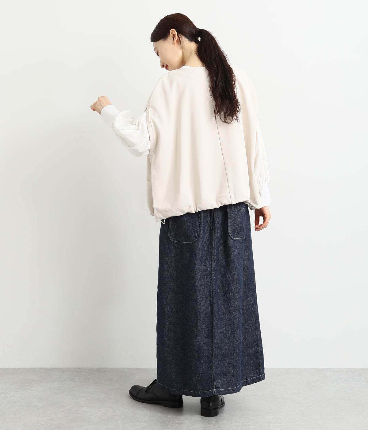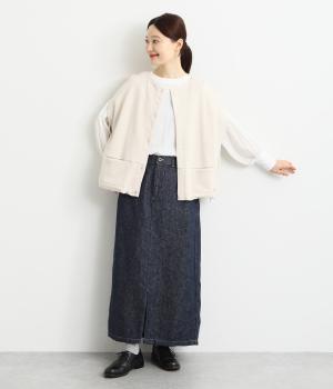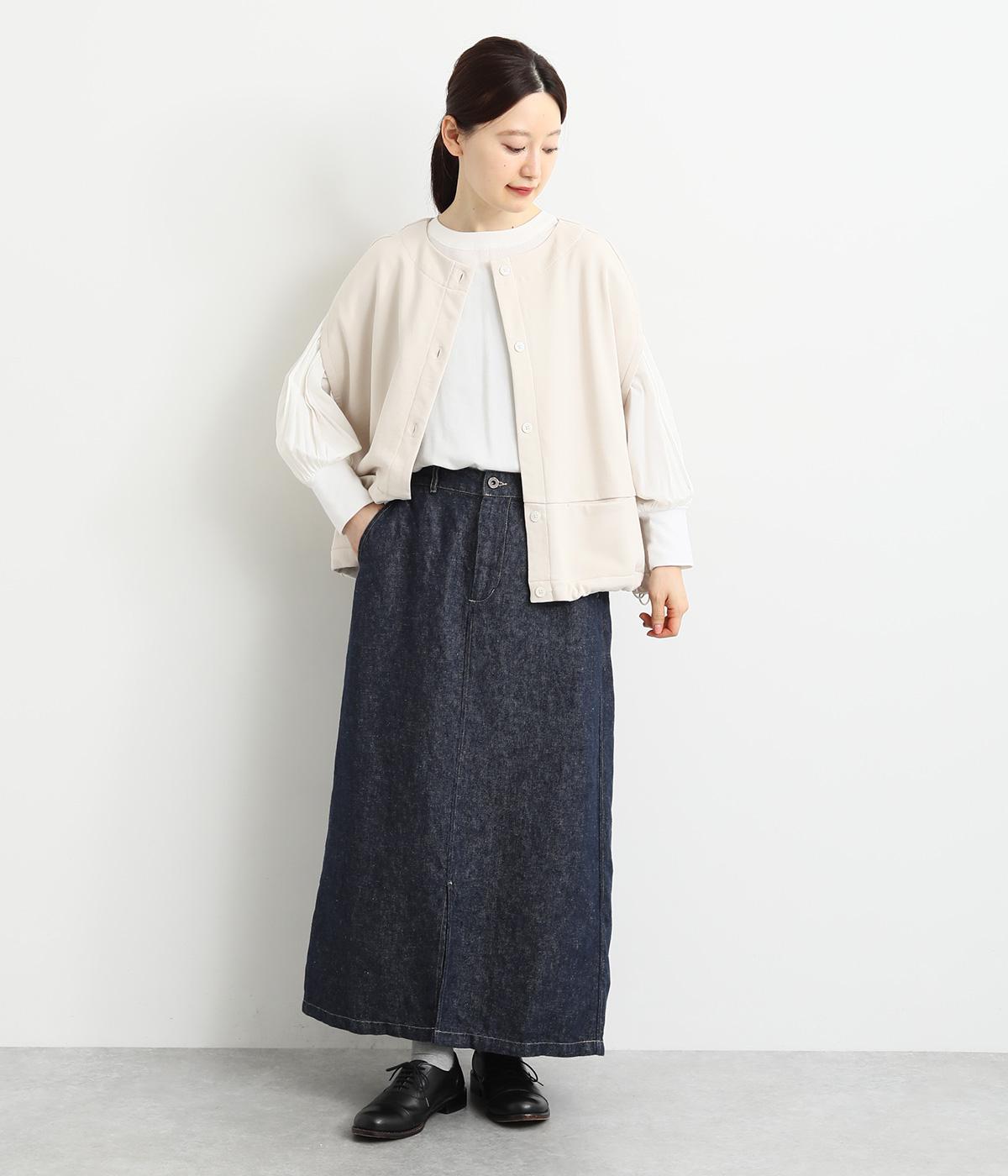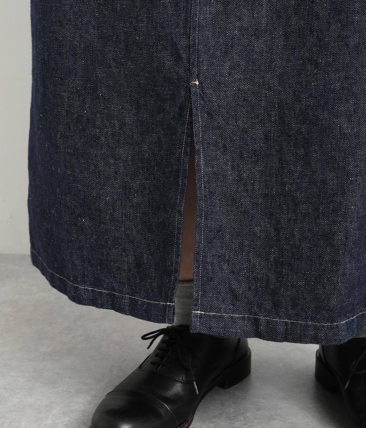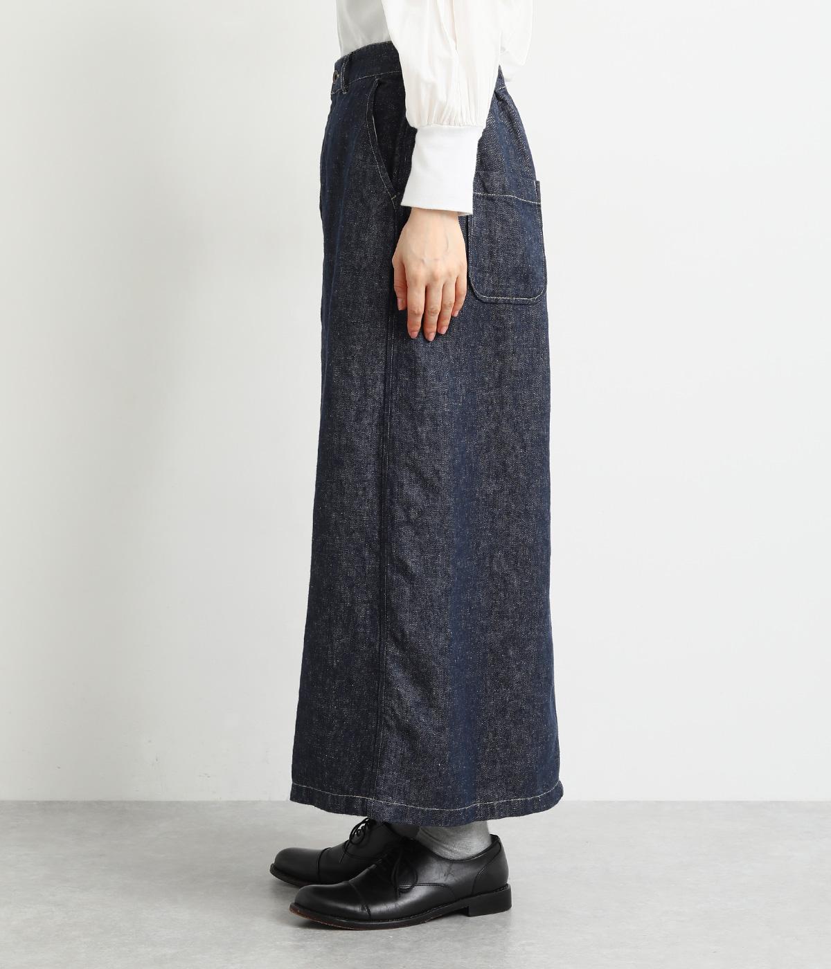 全体的に太番手ステッチを入れて無骨さのある印象ながらも、リネン特有のクラシカルで上質感もあるデニムスカートです。センタースリットで動きやすさも確保しました。前ボタン仕様ですがうしろゴムで着やすさも◎。