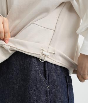 ポンチョ型のデザインにシンプルでスッキリとした印象のシームポケットを取り入れました。裾はドロストコード仕様に。ぎゅっと絞れば丸みのある可愛らしいシルエットに、ゆるめればラフで動きのあるラインにと変化を楽しめます。