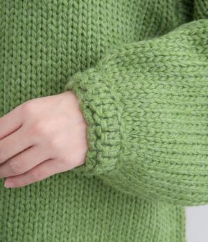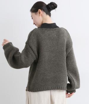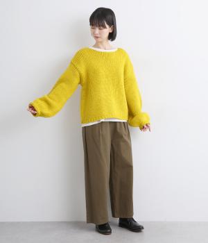 柔らかく保温性があり、ふんわりとした質感のアクリルウールバルキー素材。ほどよい伸縮性でストレスの少ない着心地です。ざっくりとした素朴な風合いが魅力です。