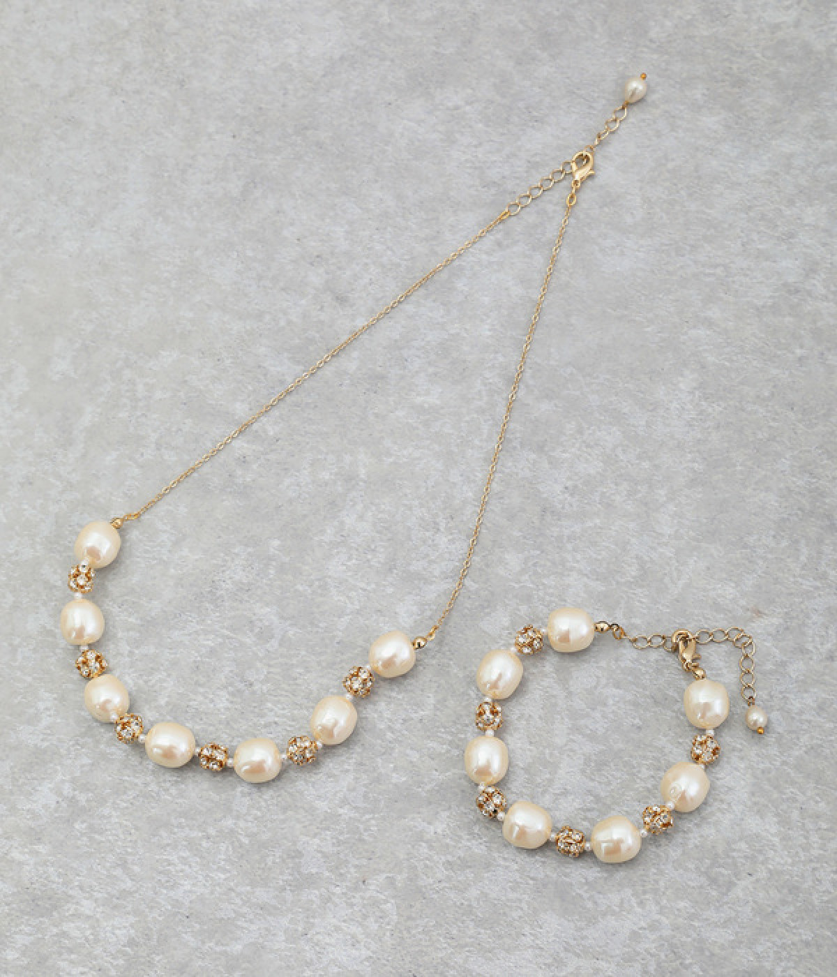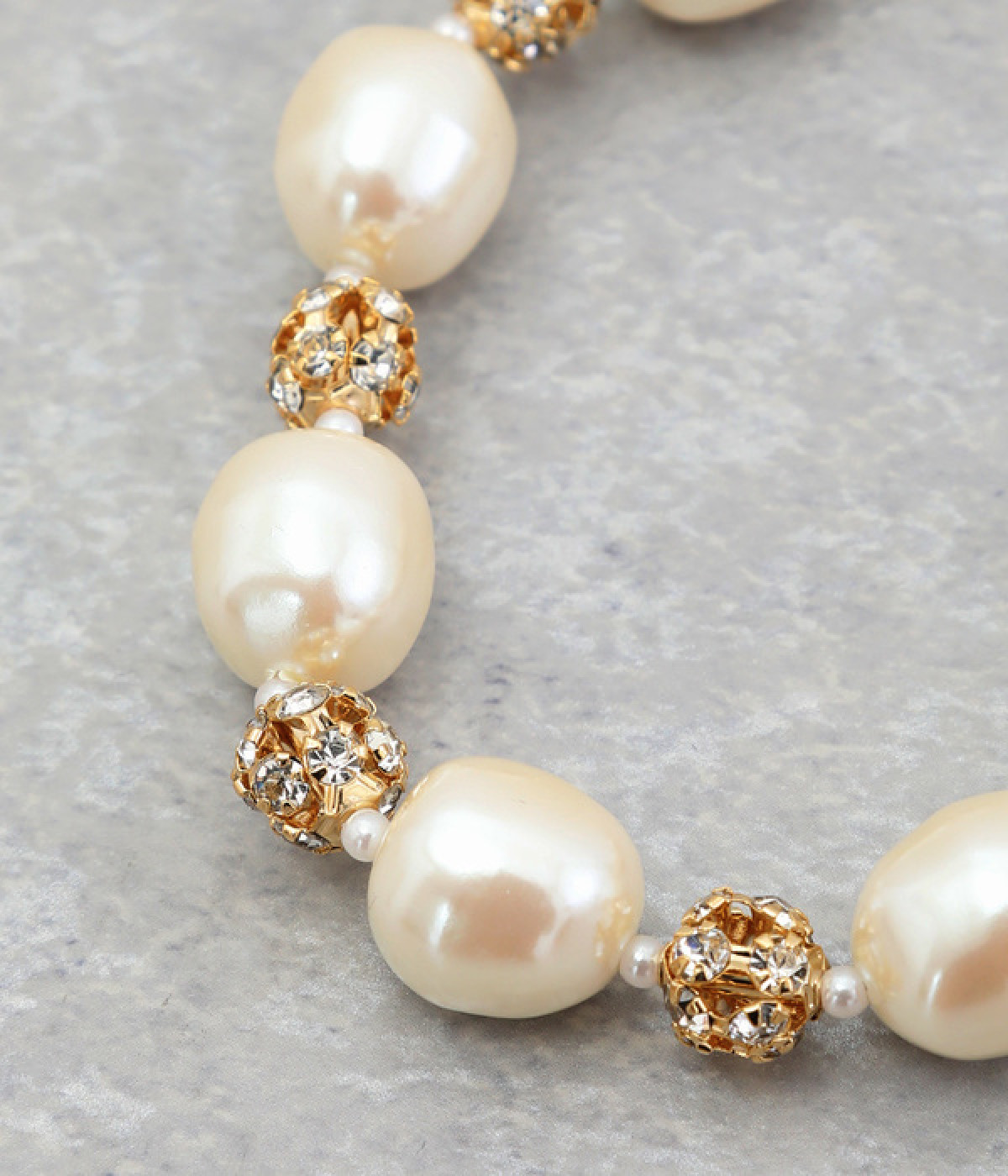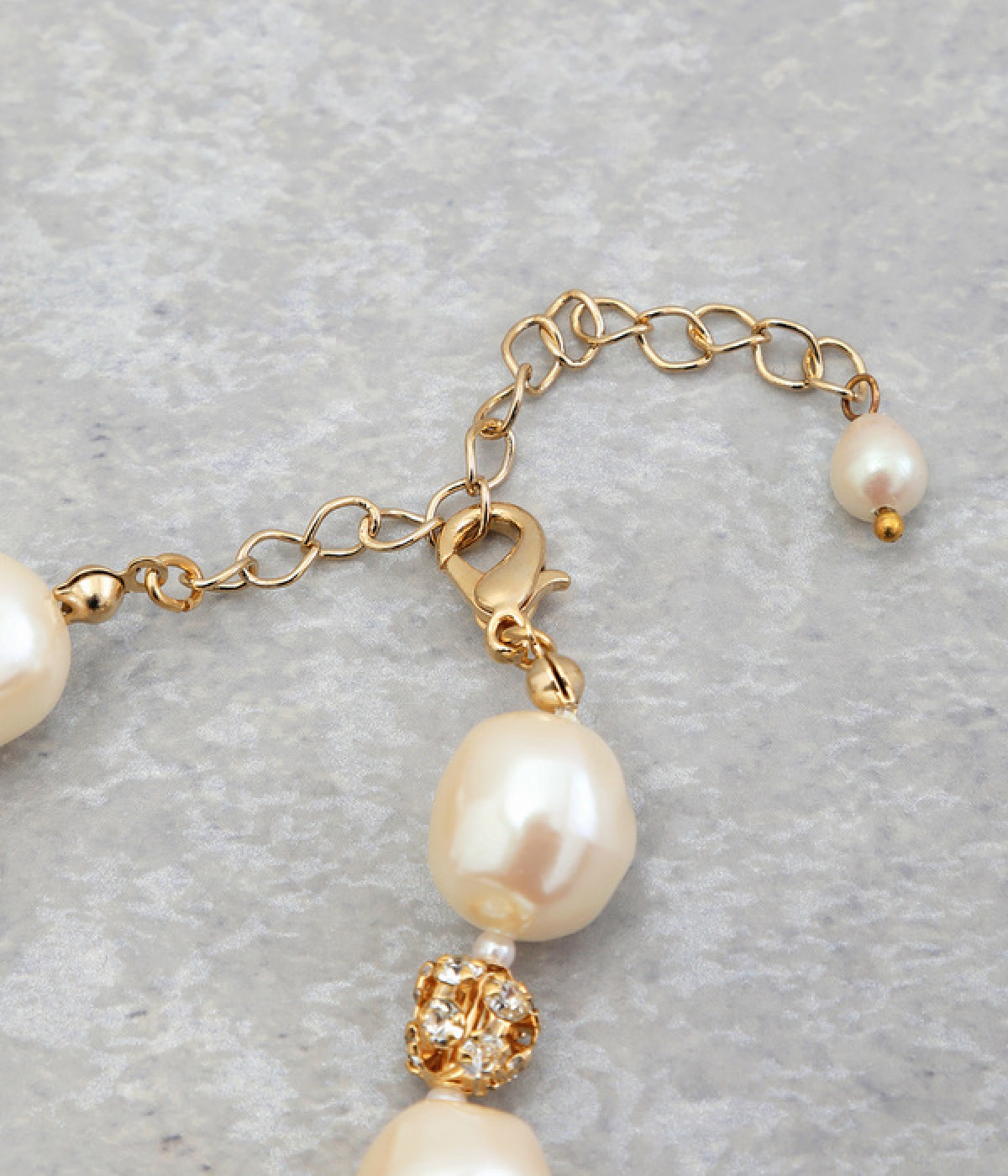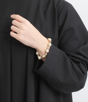 ナチュラルな輝きが美しい淡水パールと上品なきらめきの丸いロンデルビーズを贅沢に使ったブレスレットです。動くたびにさりげなく揺れるモチーフが手首回りを美しく可憐に演出。合わせやすいデザインなので、さまざまな着こなしにぴったり。普段使いにはもちろん、結婚式やパーティなどのお呼ばれシーンにも◎。同シリーズのイヤーアクセサリーやネックレスと一緒に使うのもオススメです。