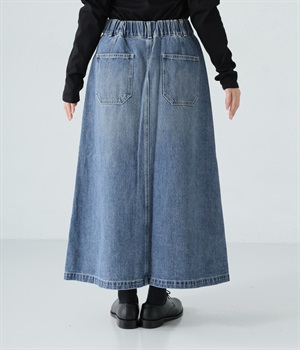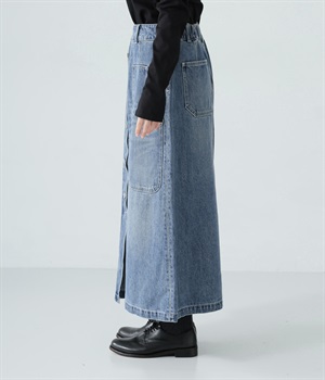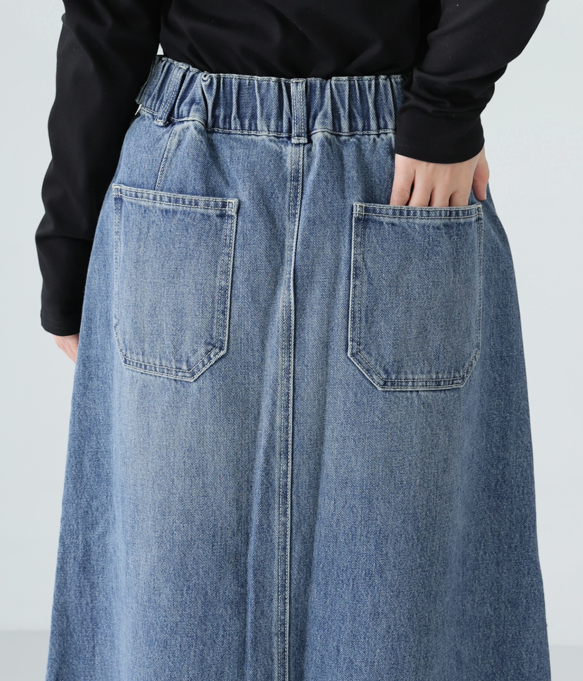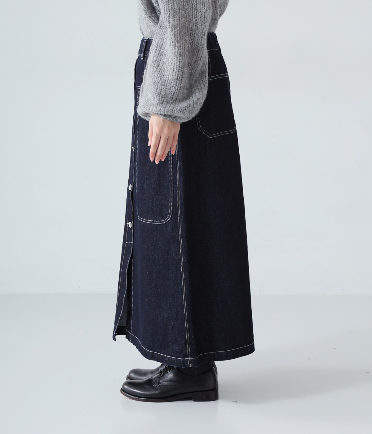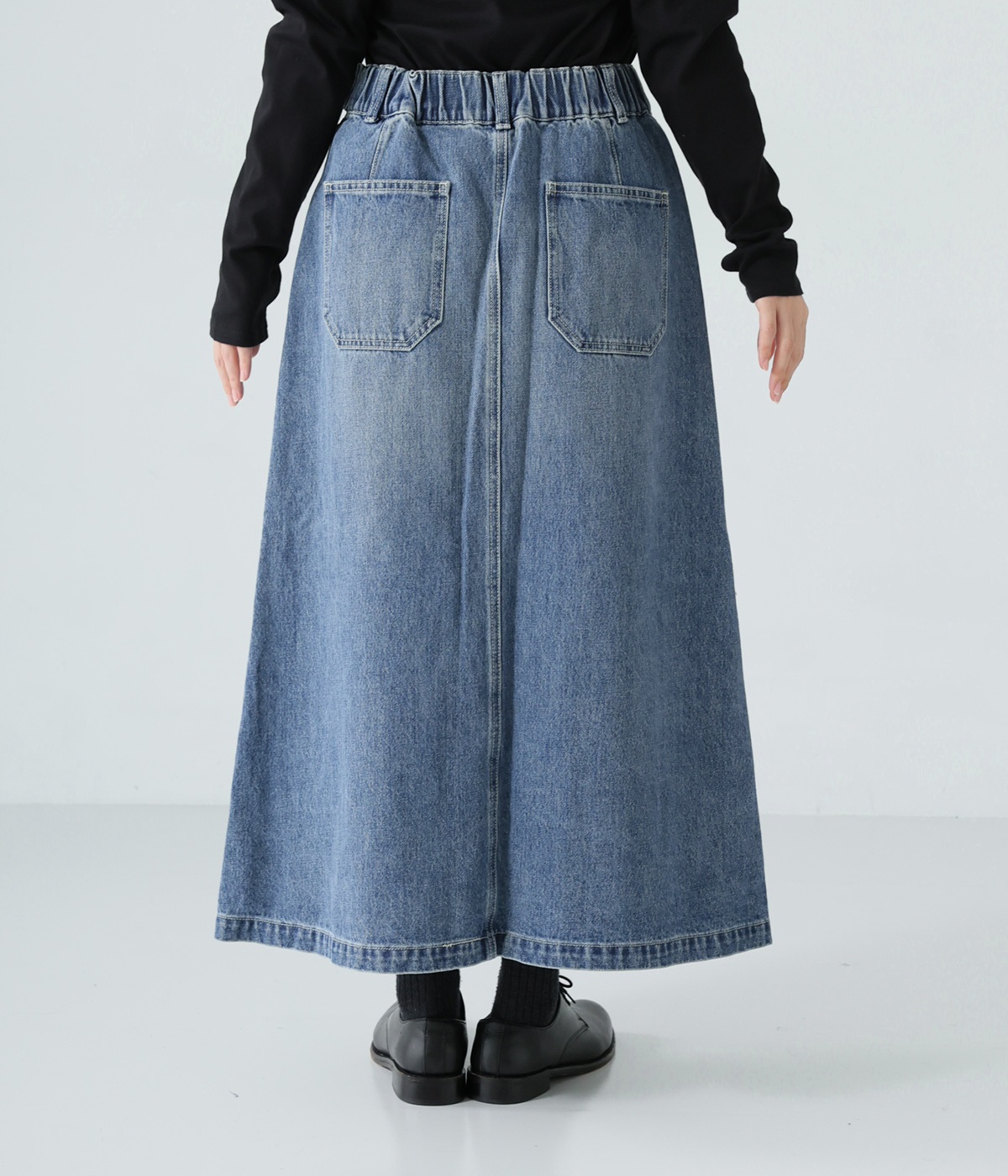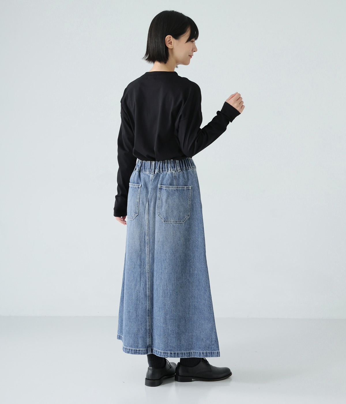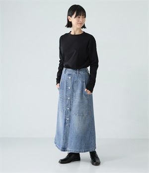 オールシーズン着用していただける適度な肉感のコットンデニムを使用したスカートです。ロング丈ながら前裾にはスリットが入っているので足さばきも良く、軽やかな足元に。裾に向かって広がるキレイなAラインシルエットが上品で女性らしさ引き立つカジュアルスタイルが楽しめます。ウエストは後ろのみゴム仕様で、左サイドにはファスナー付き。