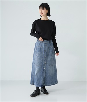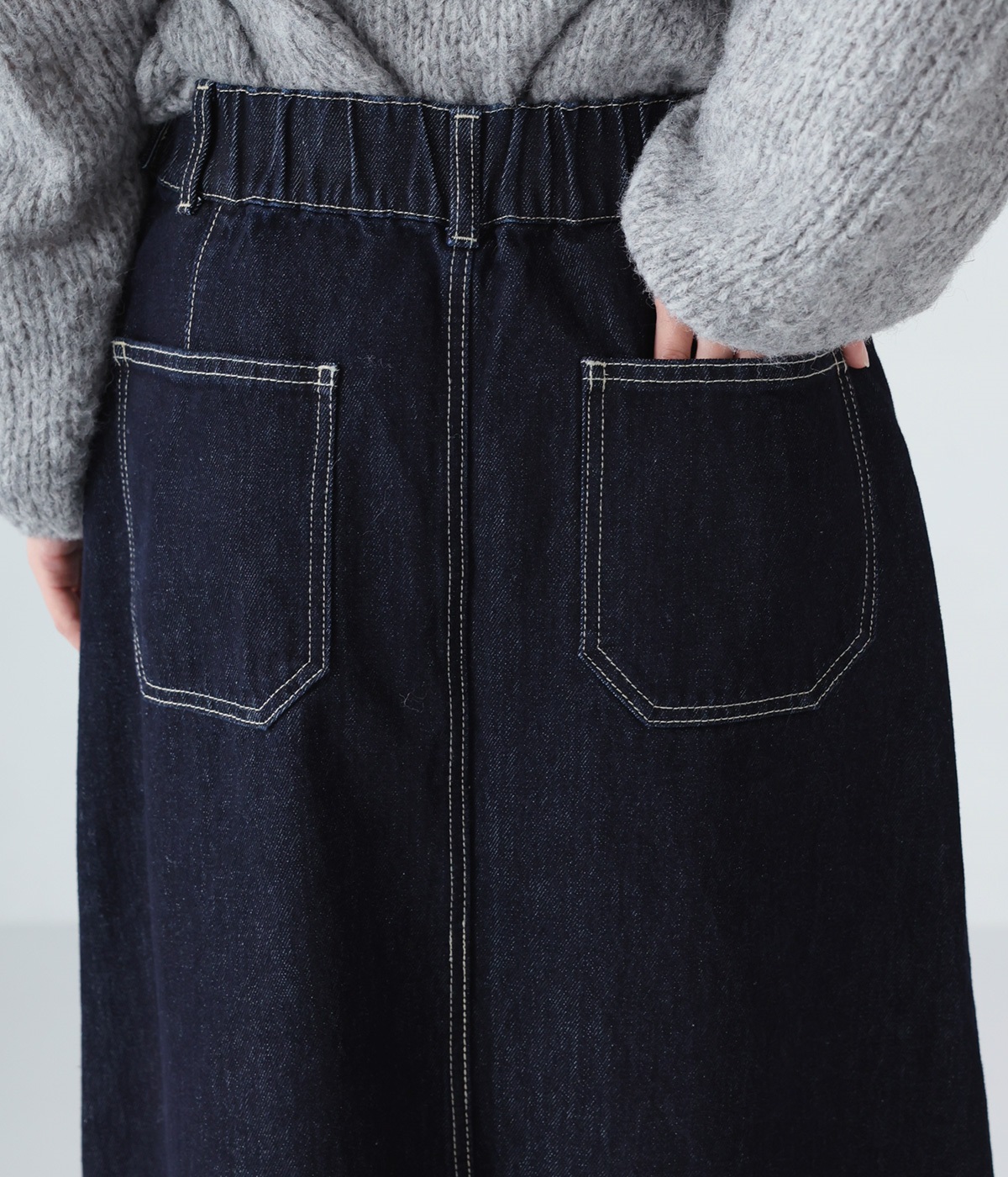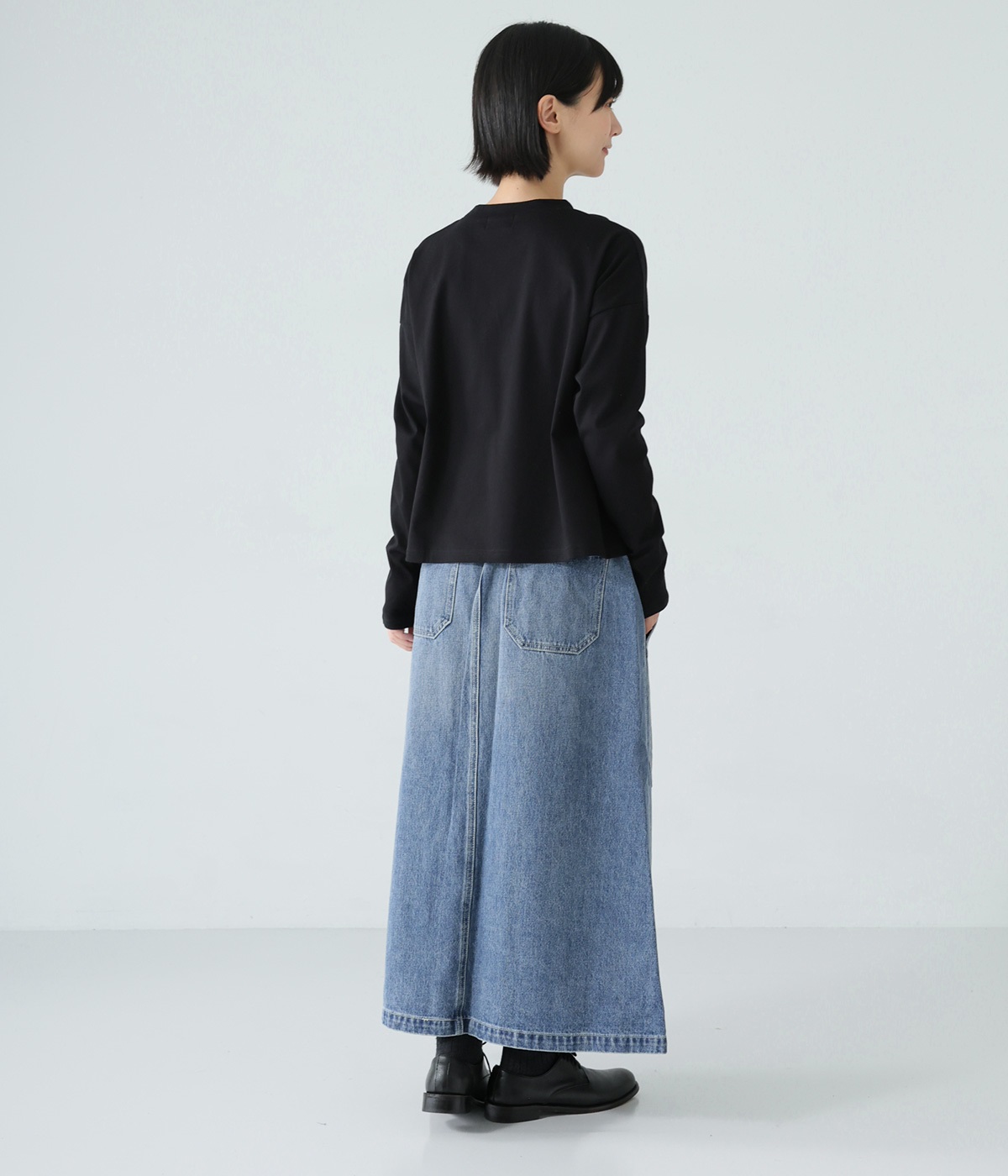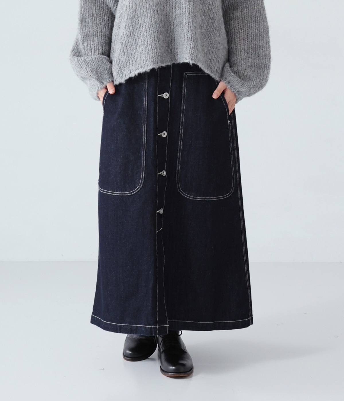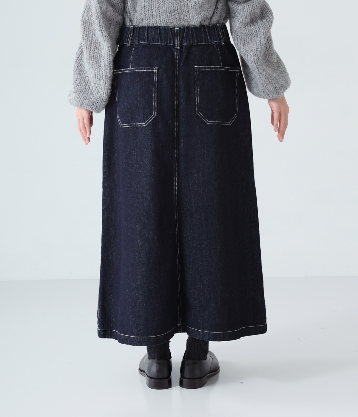オールシーズン着用していただける適度な肉感のコットンデニムを使用したスカートです。ロング丈ながら前裾にはスリットが入っているので足さばきも良く、軽やかな足元に。裾に向かって広がるキレイなAラインシルエットが上品で女性らしさ引き立つカジュアルスタイルが楽しめます。ウエストは後ろのみゴム仕様で、左サイドにはファスナー付き。