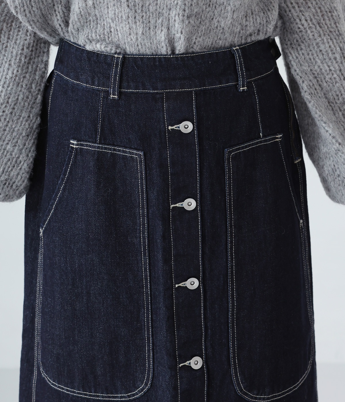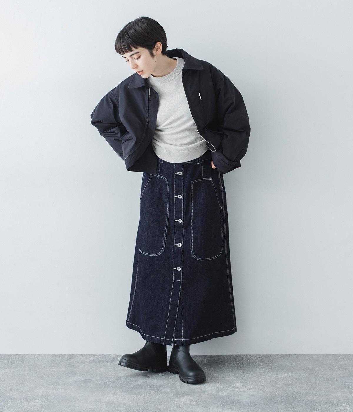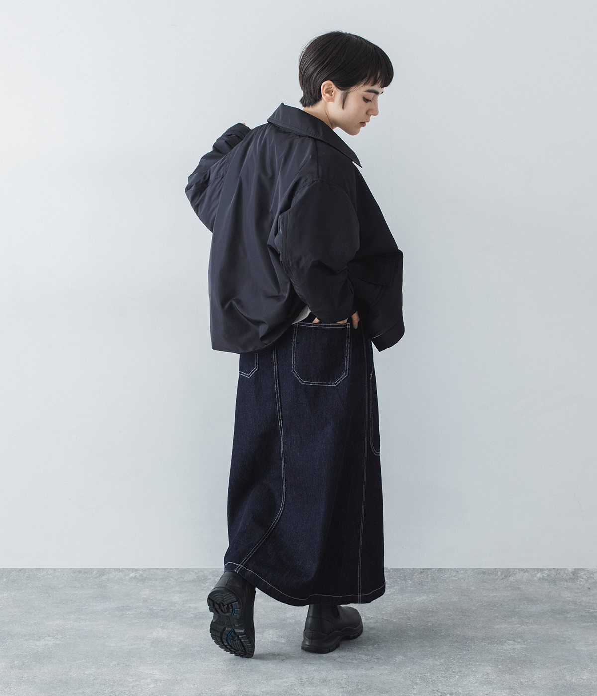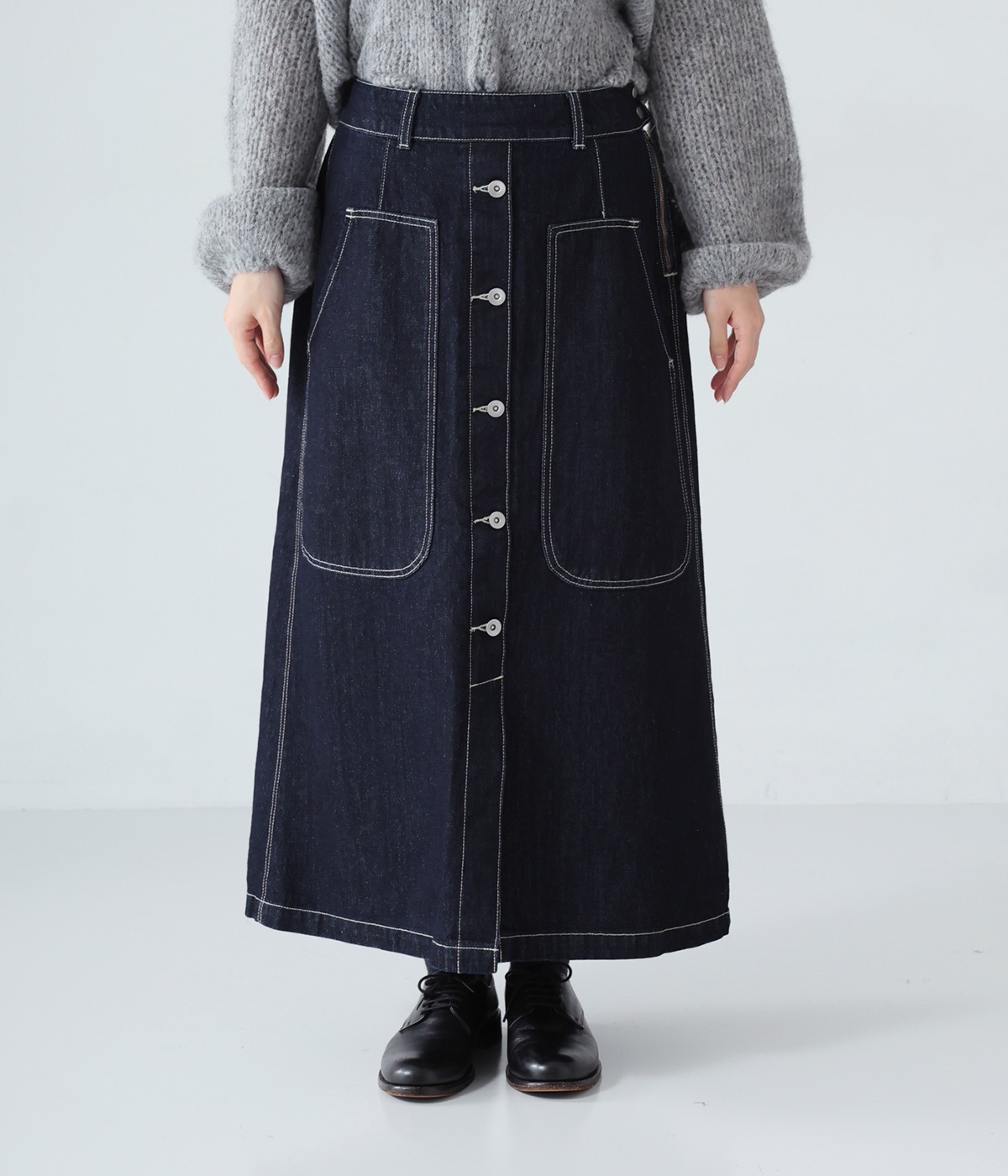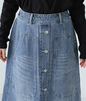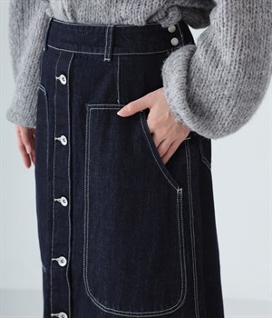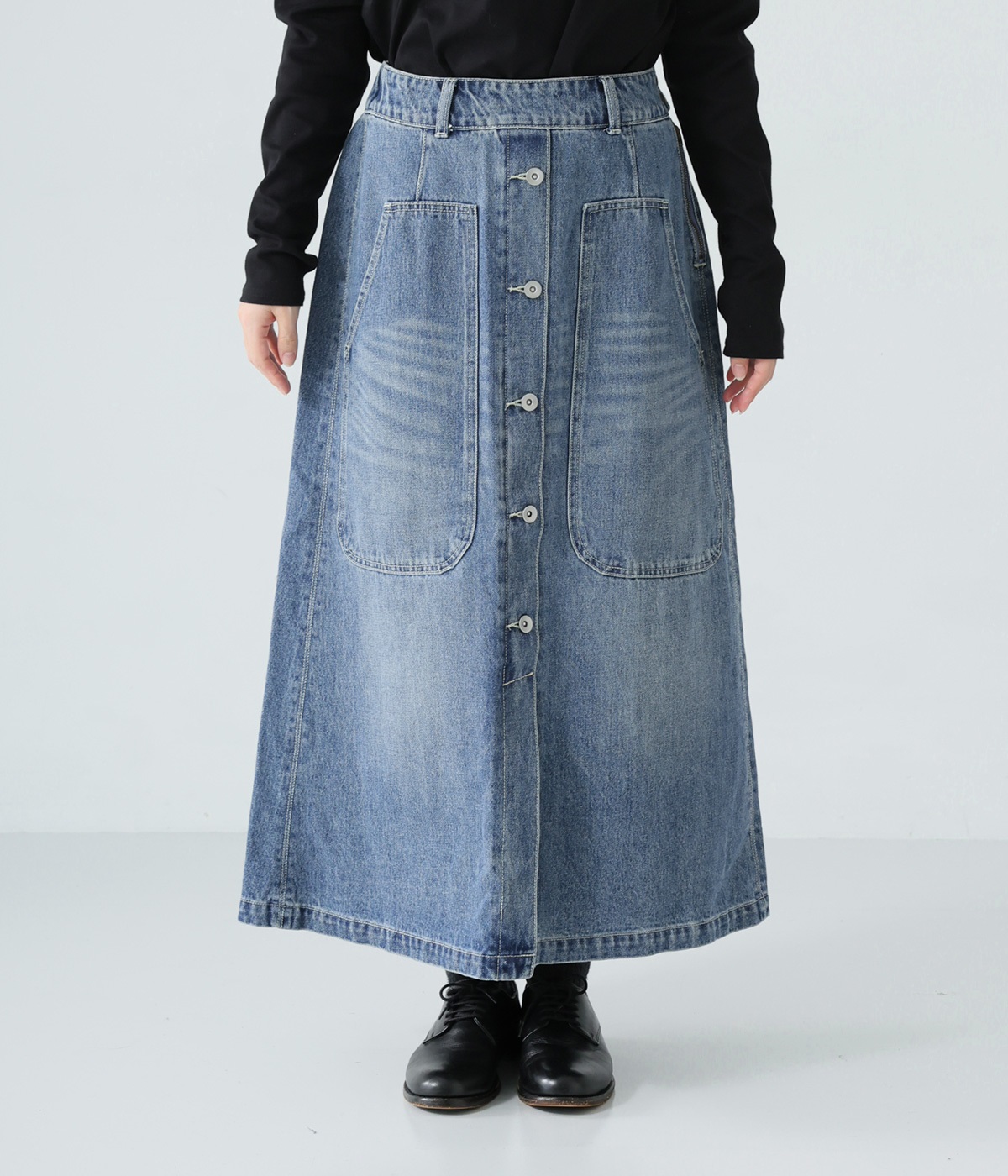 オールシーズン着用していただける適度な肉感のコットンデニムを使用したスカートです。ロング丈ながら前裾にはスリットが入っているので足さばきも良く、軽やかな足元に。裾に向かって広がるキレイなAラインシルエットが上品で女性らしさ引き立つカジュアルスタイルが楽しめます。ウエストは後ろのみゴム仕様で、左サイドにはファスナー付き。