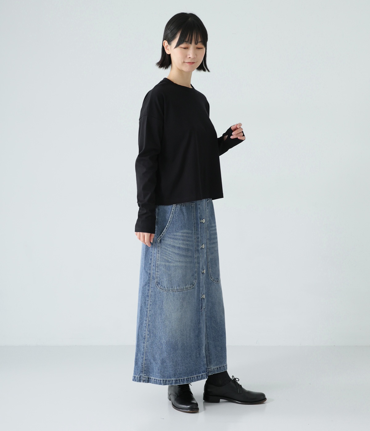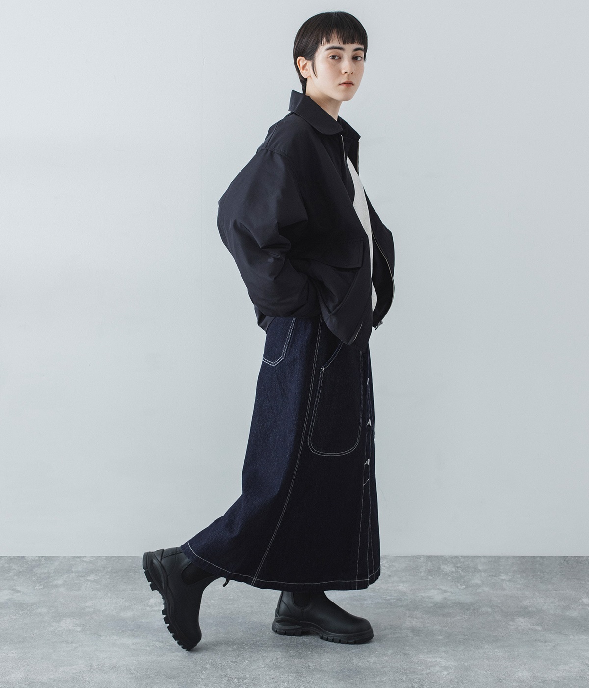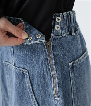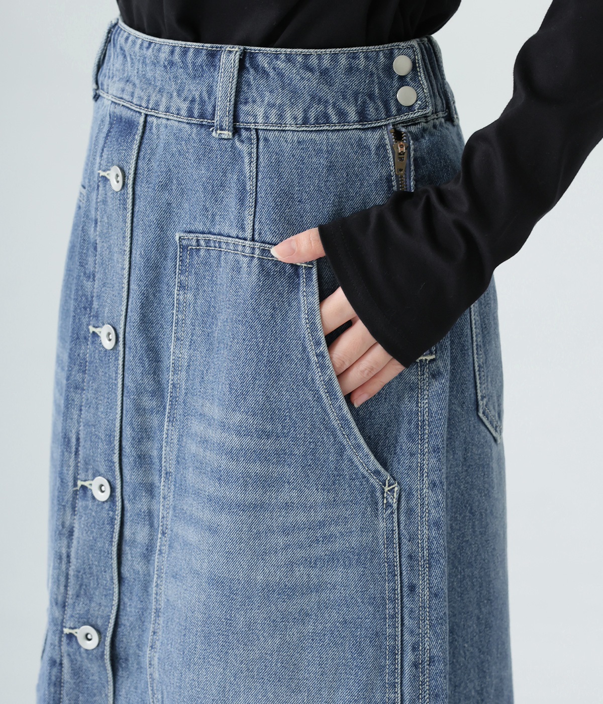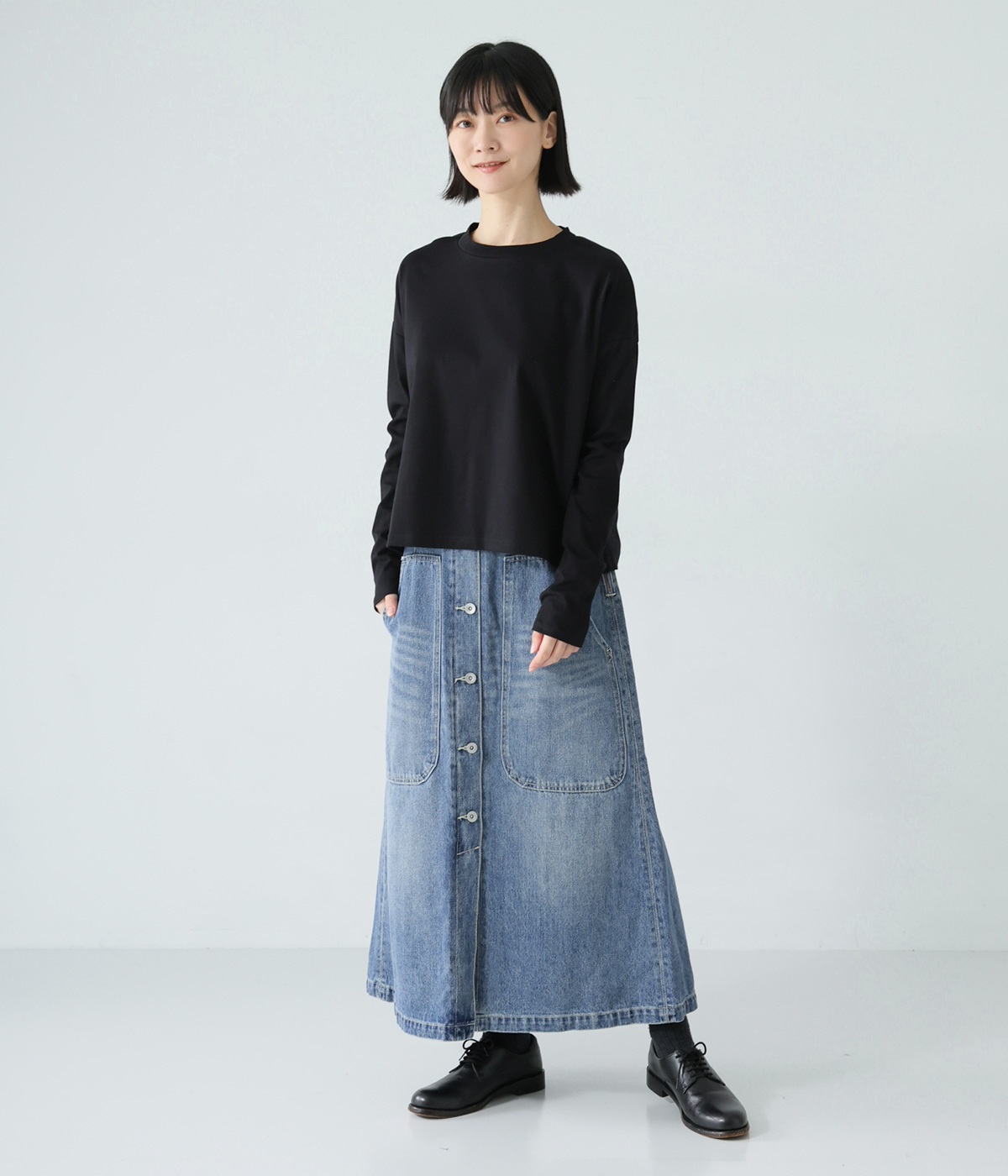 オールシーズン着用していただける適度な肉感のコットンデニムを使用したスカートです。ロング丈ながら前裾にはスリットが入っているので足さばきも良く、軽やかな足元に。裾に向かって広がるキレイなAラインシルエットが上品で女性らしさ引き立つカジュアルスタイルが楽しめます。ウエストは後ろのみゴム仕様で、左サイドにはファスナー付き。