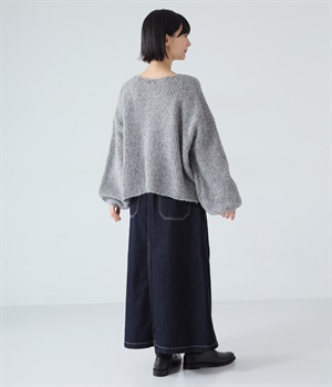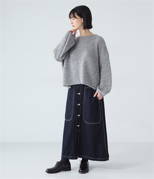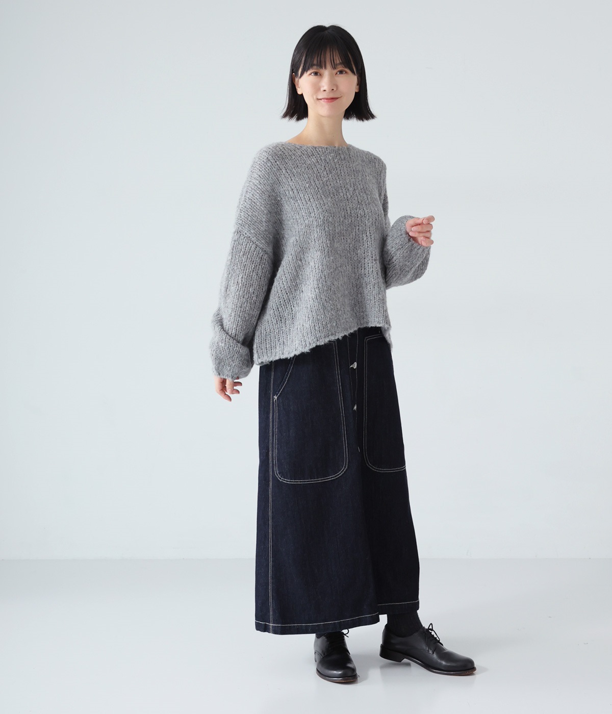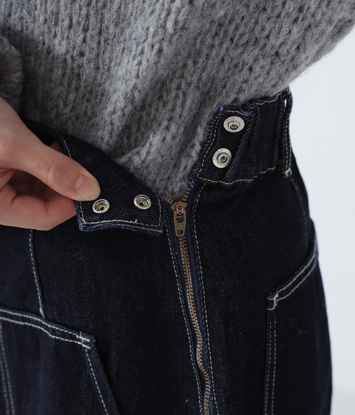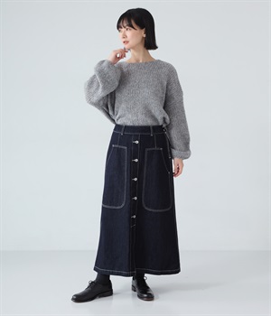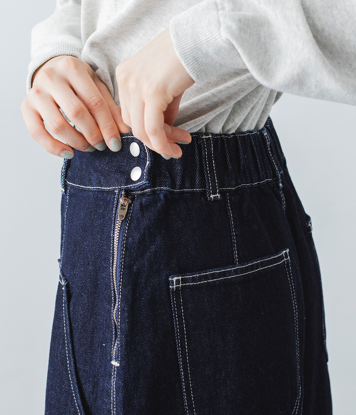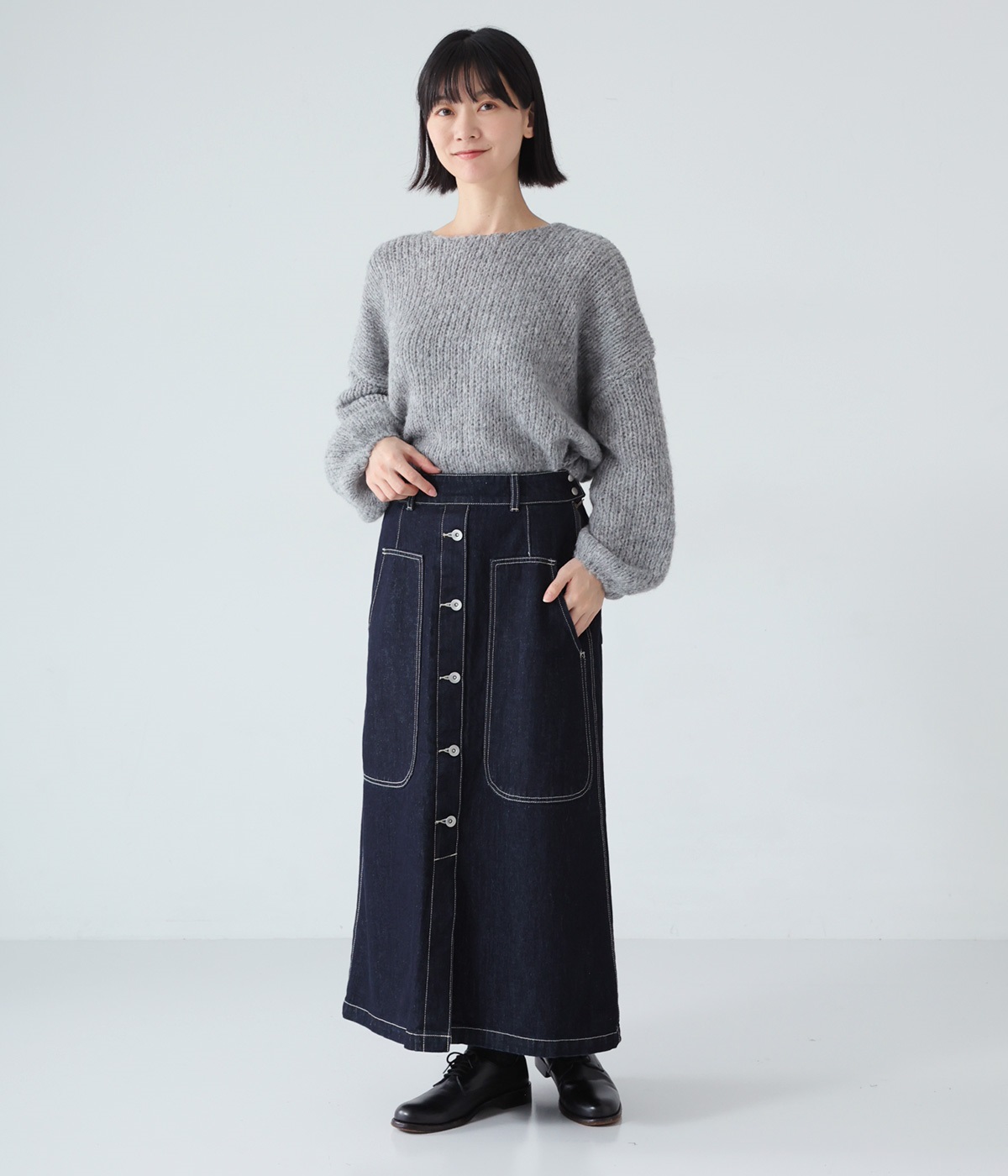 オールシーズン着用していただける適度な肉感のコットンデニムを使用したスカートです。ロング丈ながら前裾にはスリットが入っているので足さばきも良く、軽やかな足元に。裾に向かって広がるキレイなAラインシルエットが上品で女性らしさ引き立つカジュアルスタイルが楽しめます。ウエストは後ろのみゴム仕様で、左サイドにはファスナー付き。