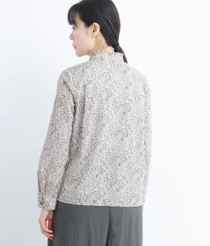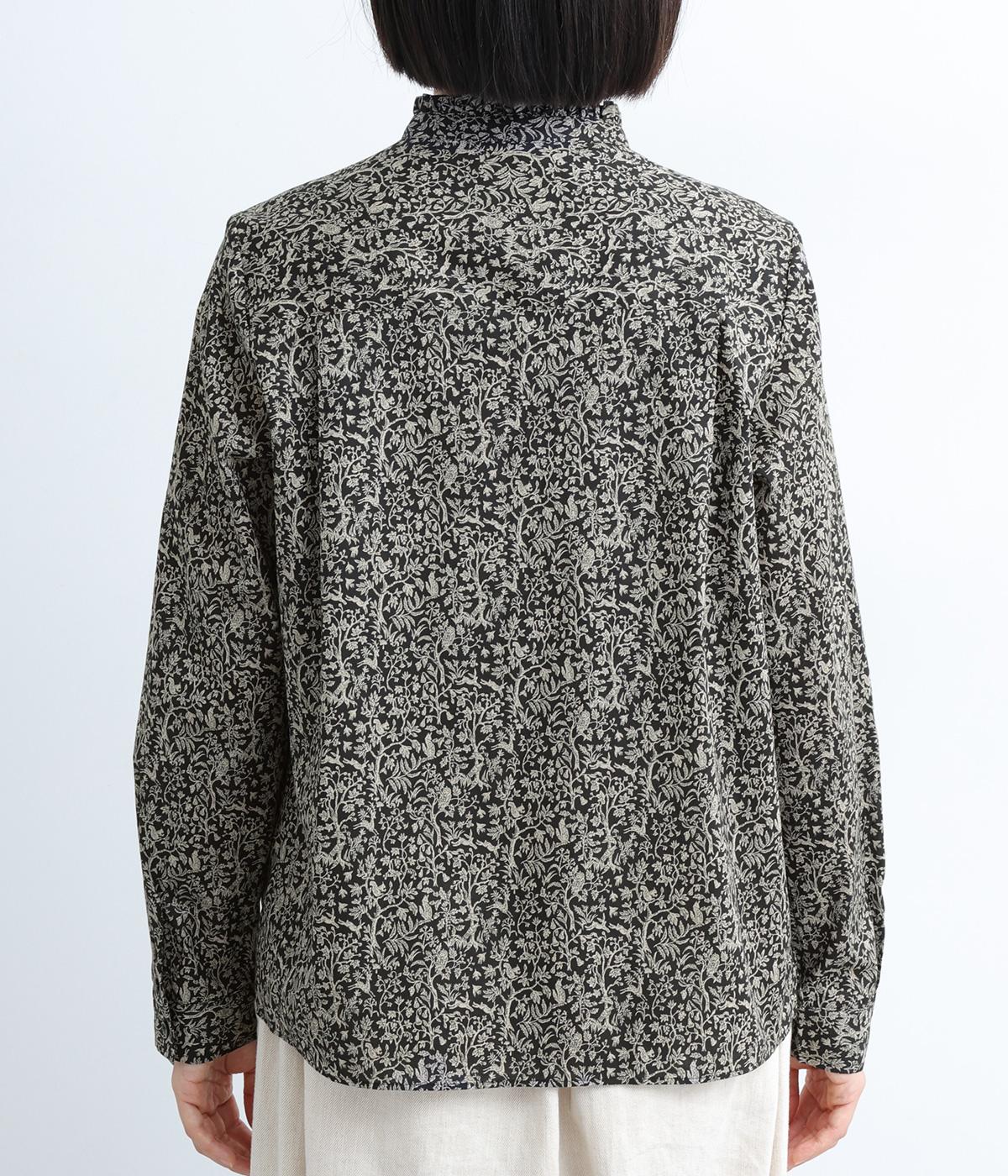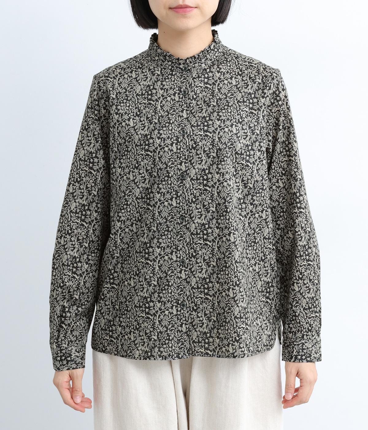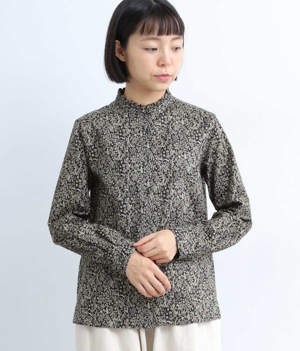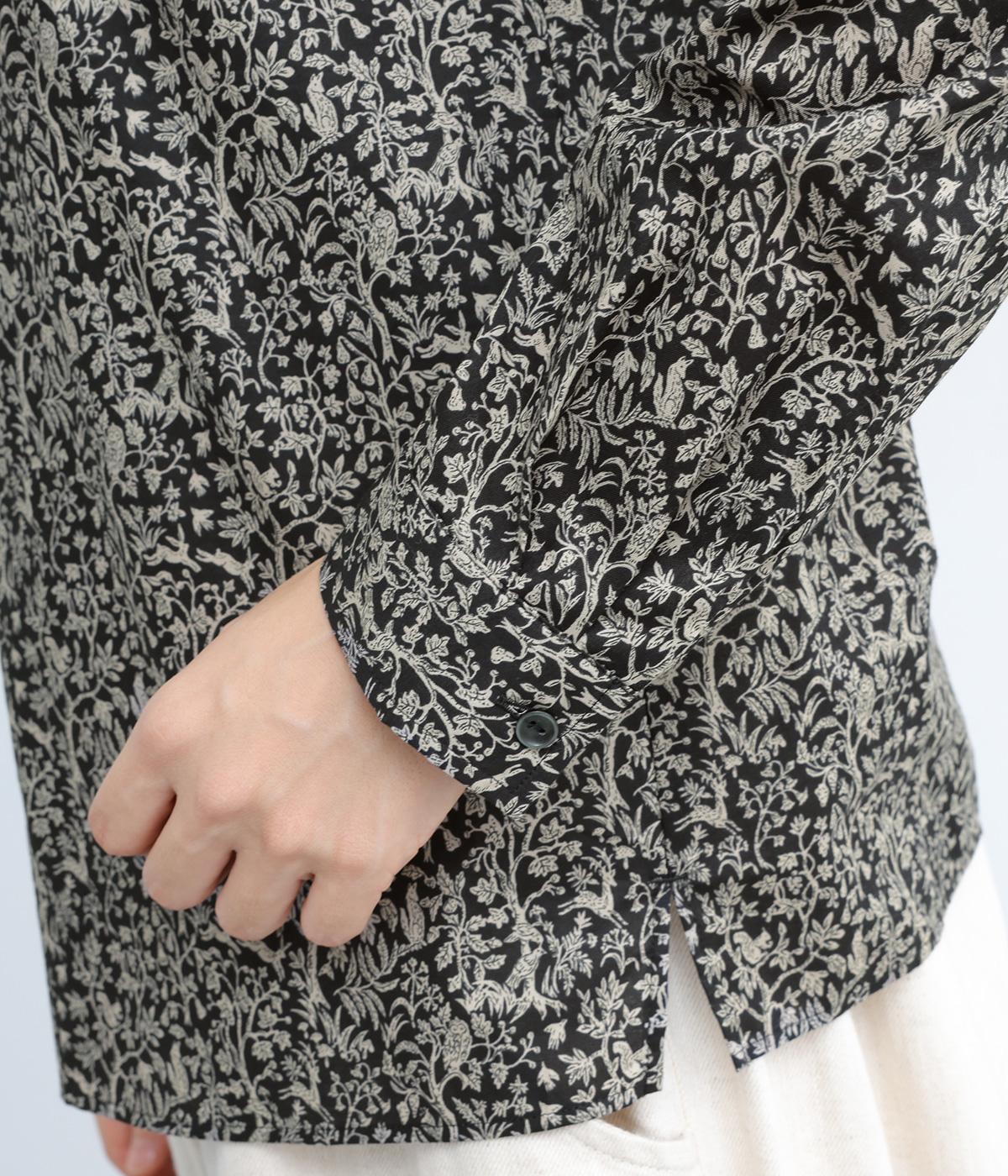 シックなフォレスト柄が印象的なシャツです。スタンドフリルが顔まわりに華やかさを添えます。一枚で着てもインナーとして柄をのぞかせても◎。ほどよい丈感でボトムスを選ばず、幅広いコーディネートに取り入れられる一枚です。