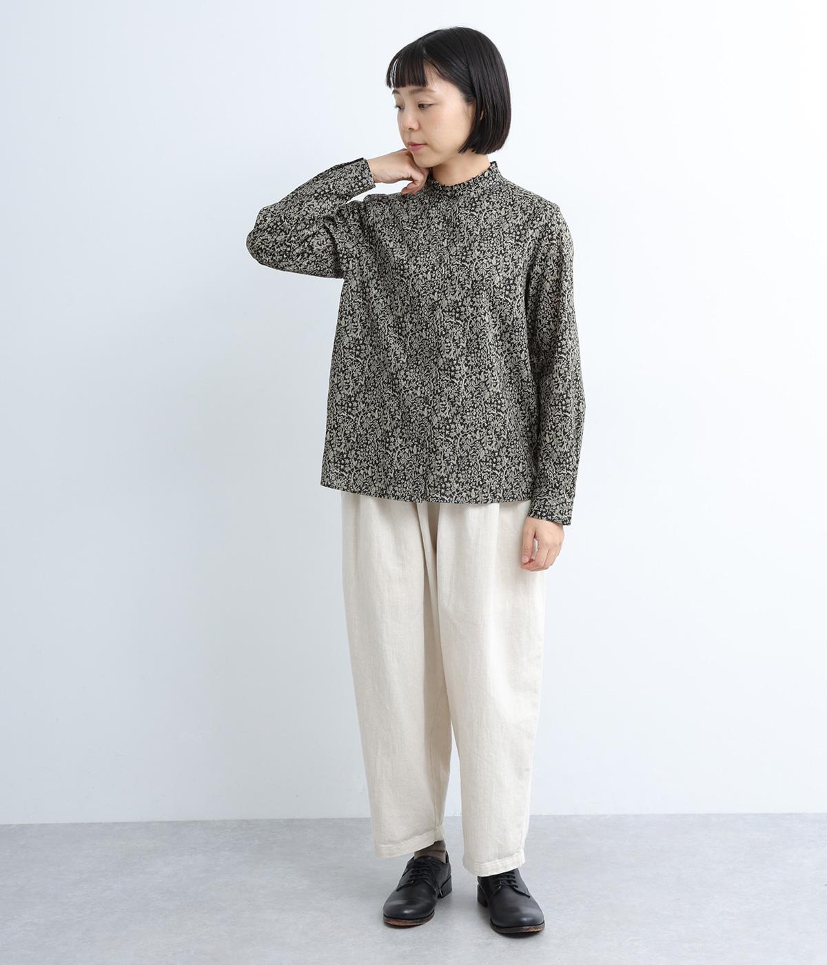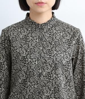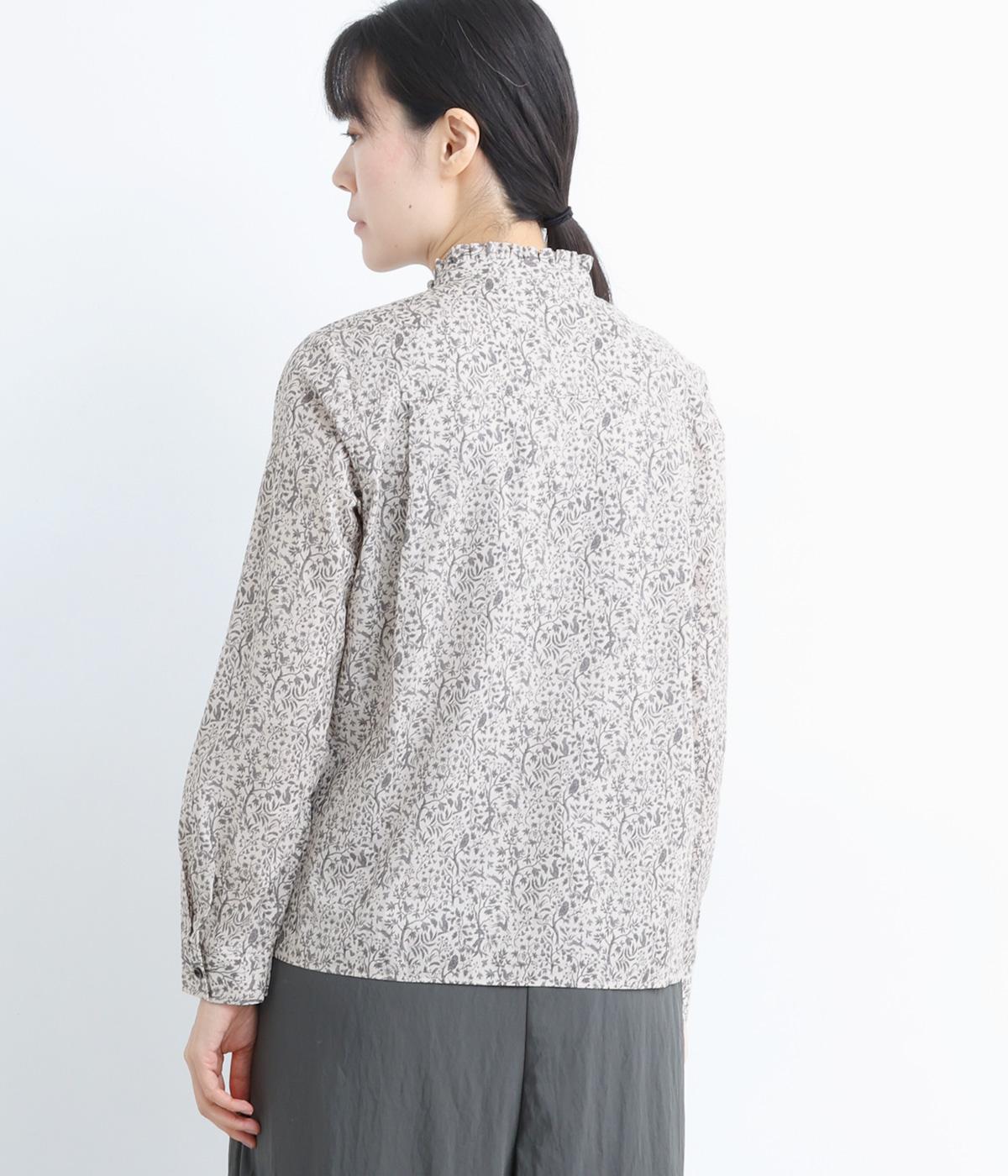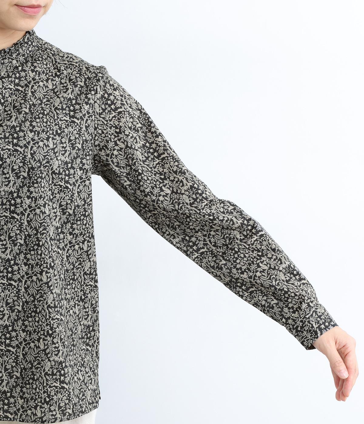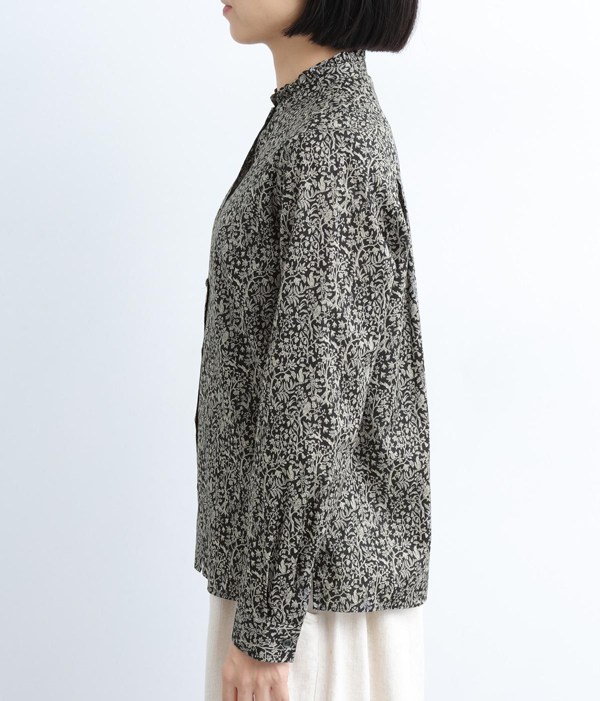 シックなフォレスト柄が印象的なシャツです。スタンドフリルが顔まわりに華やかさを添えます。一枚で着てもインナーとして柄をのぞかせても◎。ほどよい丈感でボトムスを選ばず、幅広いコーディネートに取り入れられる一枚です。