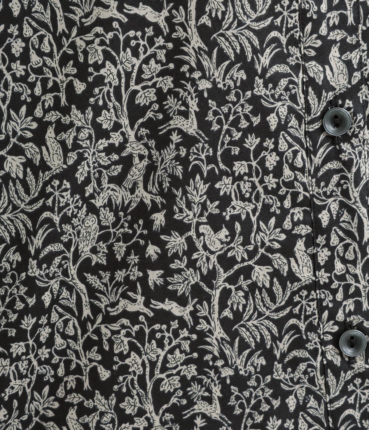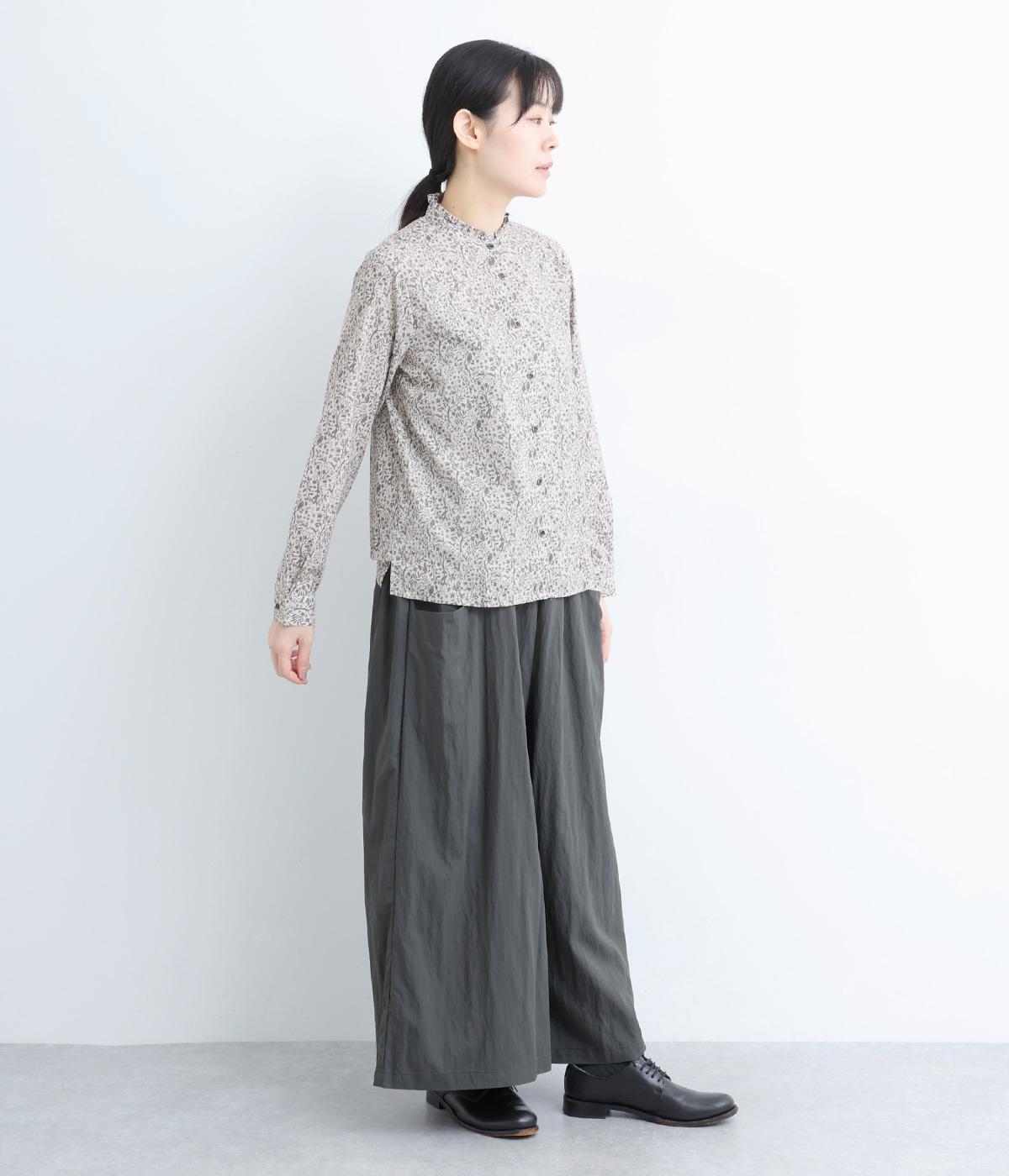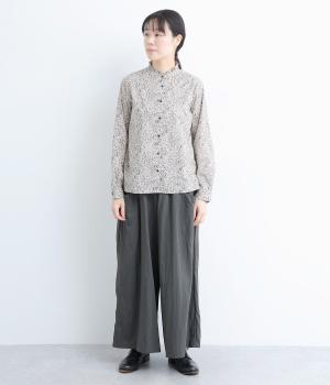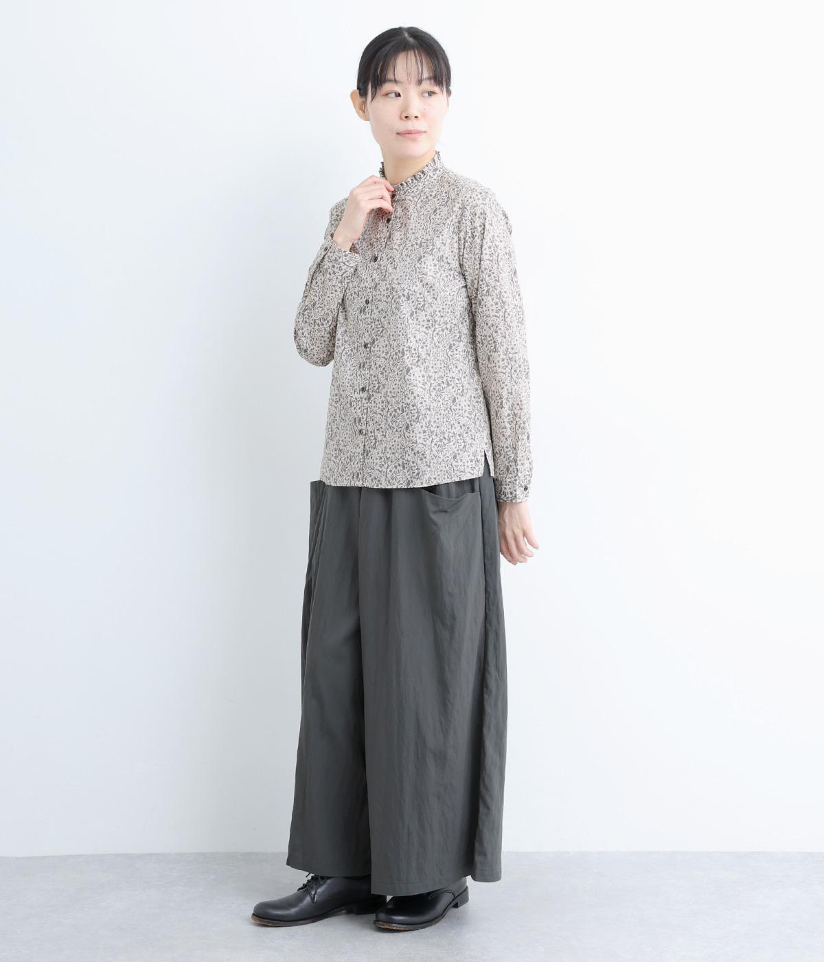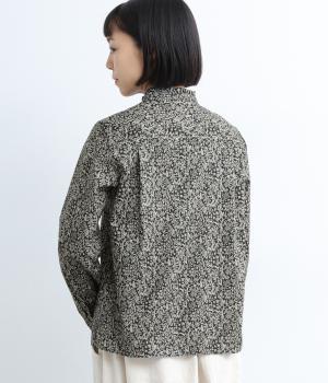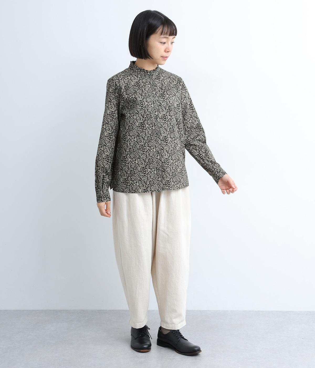 シックなフォレスト柄が印象的なシャツです。スタンドフリルが顔まわりに華やかさを添えます。一枚で着てもインナーとして柄をのぞかせても◎。ほどよい丈感でボトムスを選ばず、幅広いコーディネートに取り入れられる一枚です。