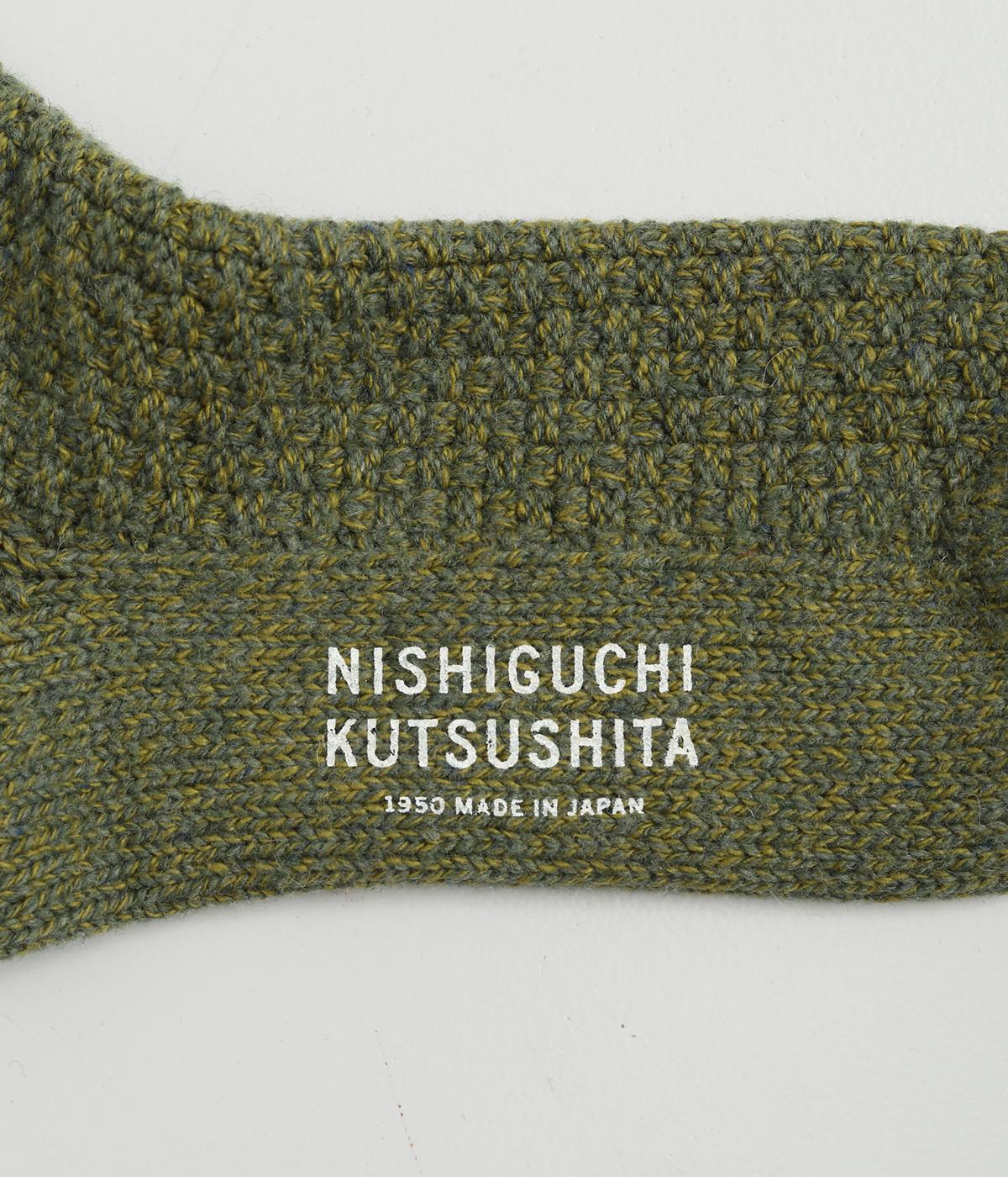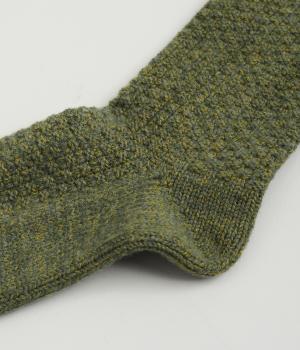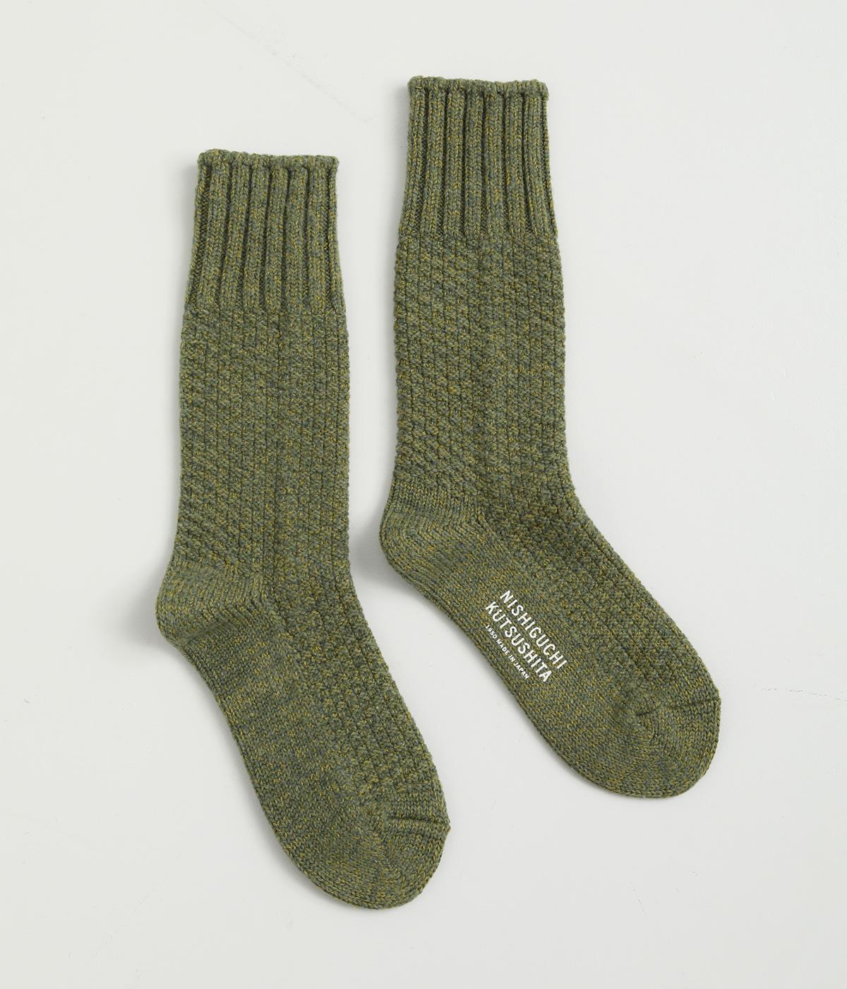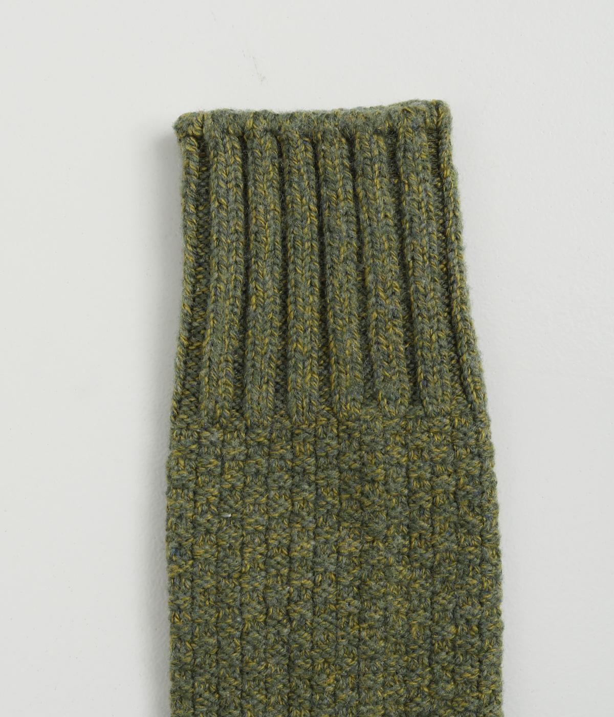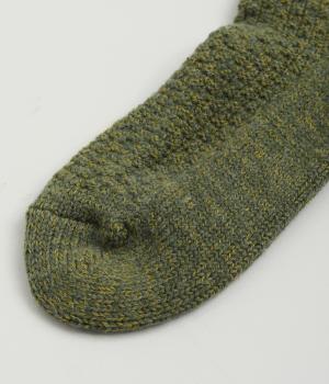 しっかりとした編み立てで足もとを守ってくれるソックス。ネップのようなほっこりとしたあたたかみのある表情が魅力。マニッシュテイストにもなじむ一足で、履き口はリブ編みにしてさり気なくデザイン性をつけました。