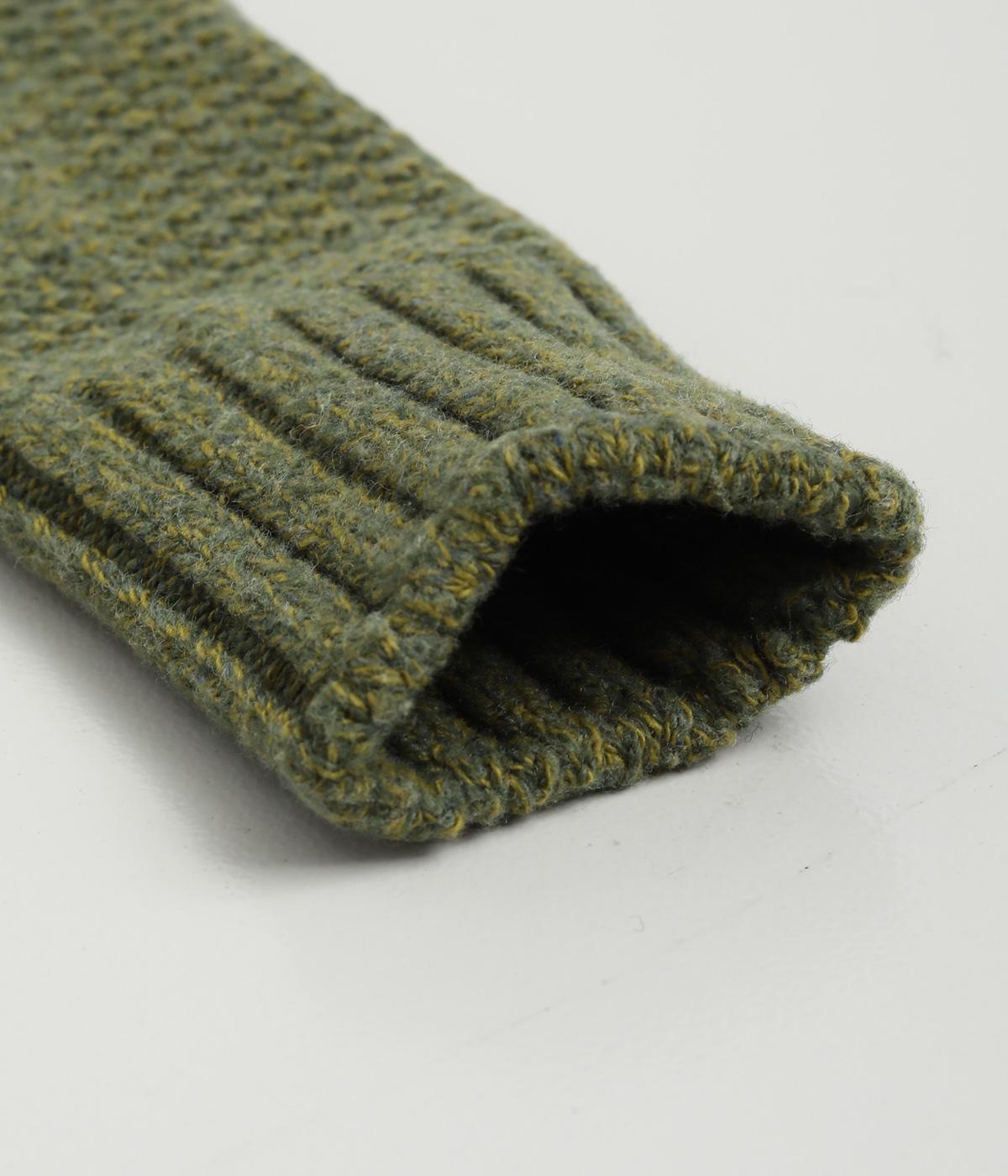 リサイクルウールとコットンをブレンドした環境にやさしい素材で編み立てました。通常のウールよりも厚手で丈夫なので、アウトドアやキャンプ、トレッキングなどのシーンでも活躍します。