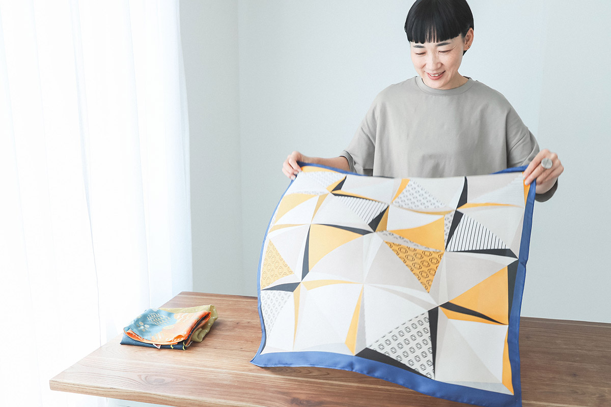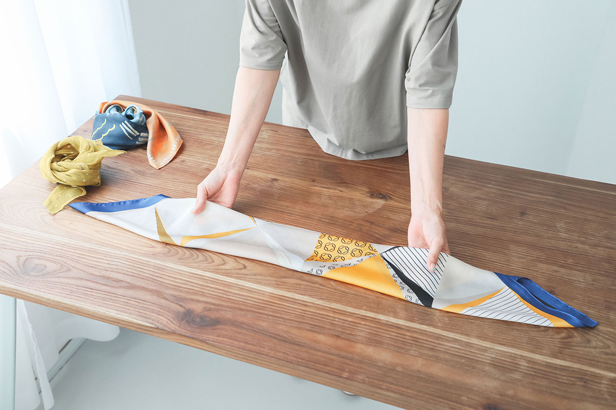 1 、スカーフを広げて置く(表裏がある場合は裏面を上にする)