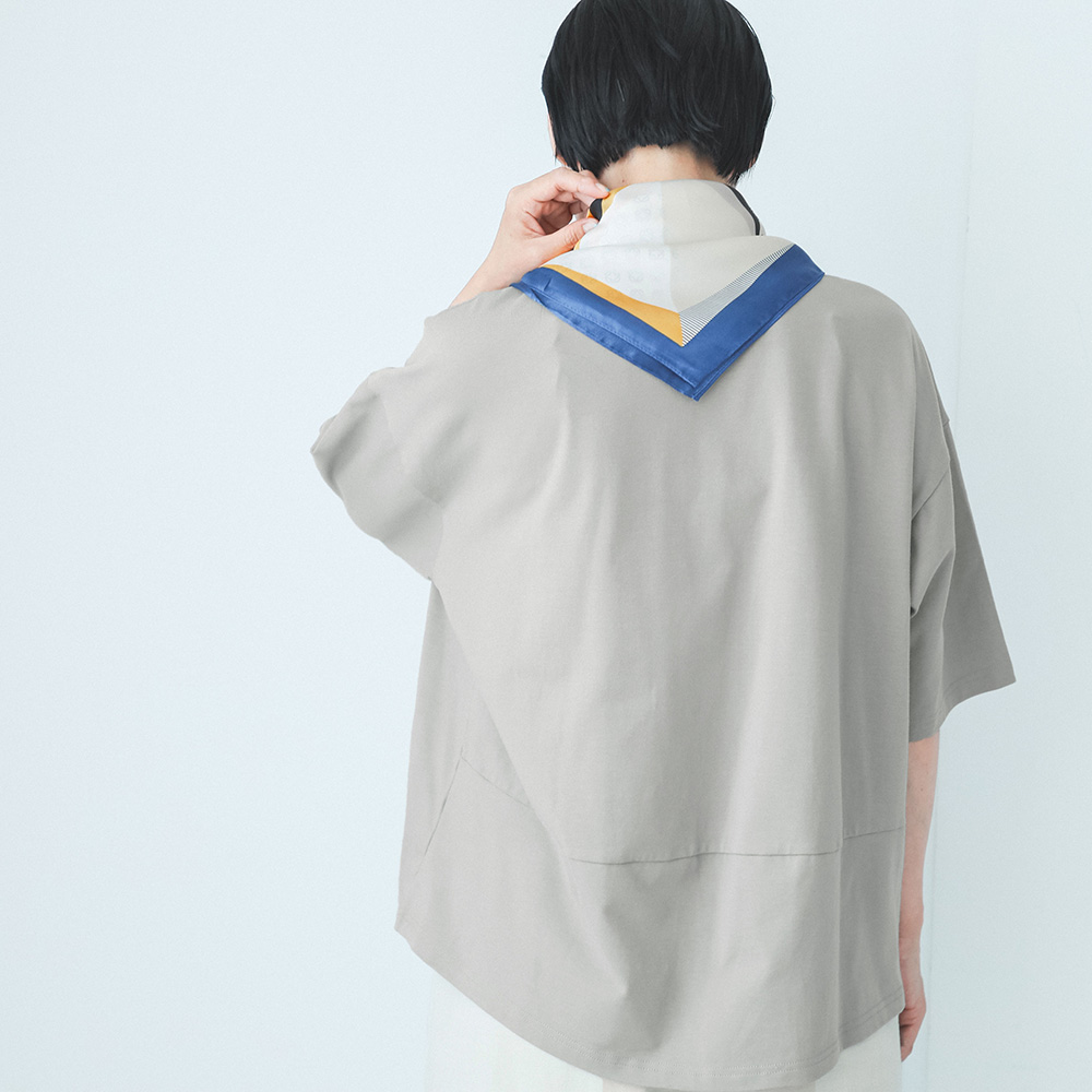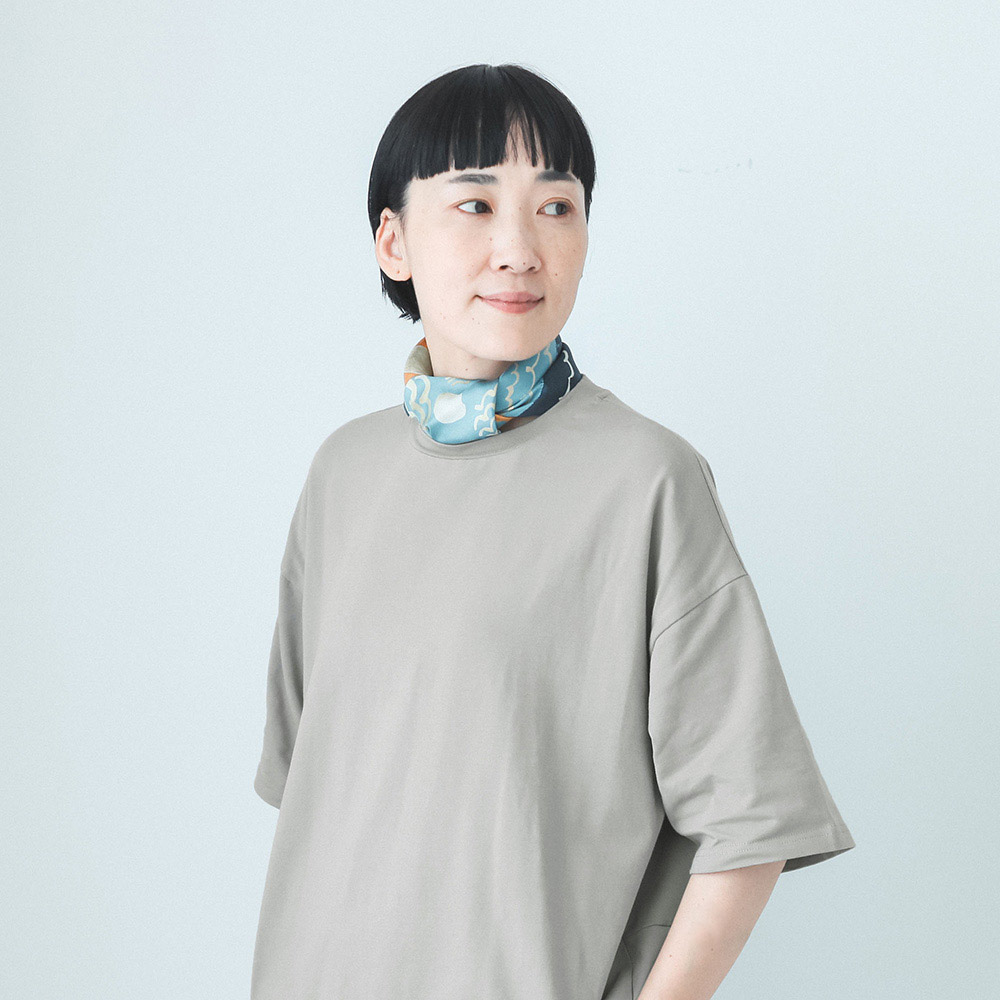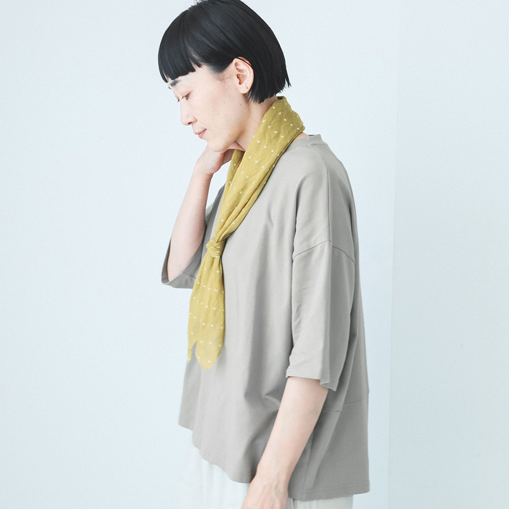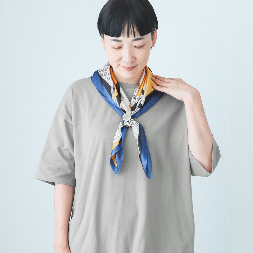 ▲シルクスカーフ ¥13,200 nume首まわりをさりげなくカバーし、上品な印象に見せてくれる巻き方です。服の中にスカーフの端を入れこむため、結び目の先の形や長さのバランスを気にしなくても大丈夫なところも◎。