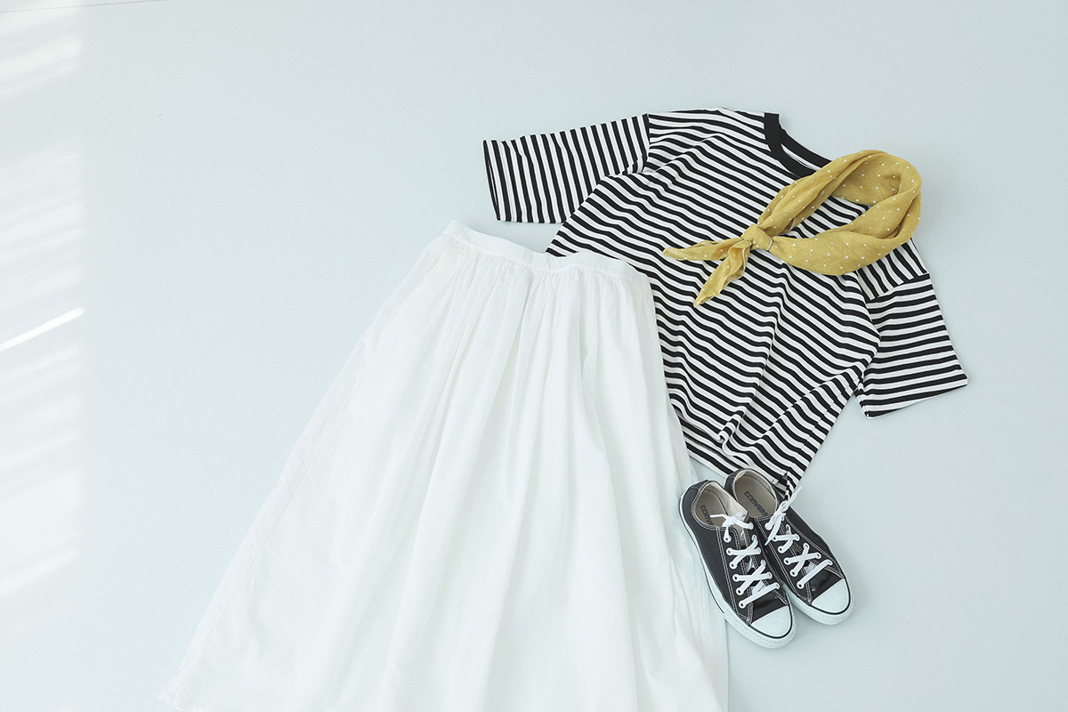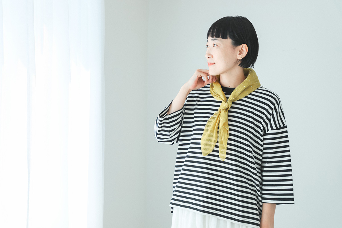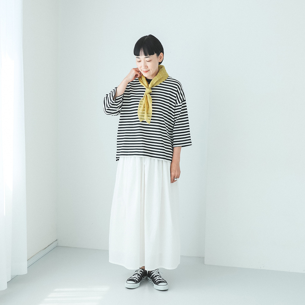 ▲ボーダーカットソー ¥5,610 &yarn/スカート 、スニーカー、スカーフは参考商品ボーダーなど柄モノの洋服に合わせるときは、スカーフはボリュームをおさえてすっきりコンパクトに巻くとバランスよくみせられます。