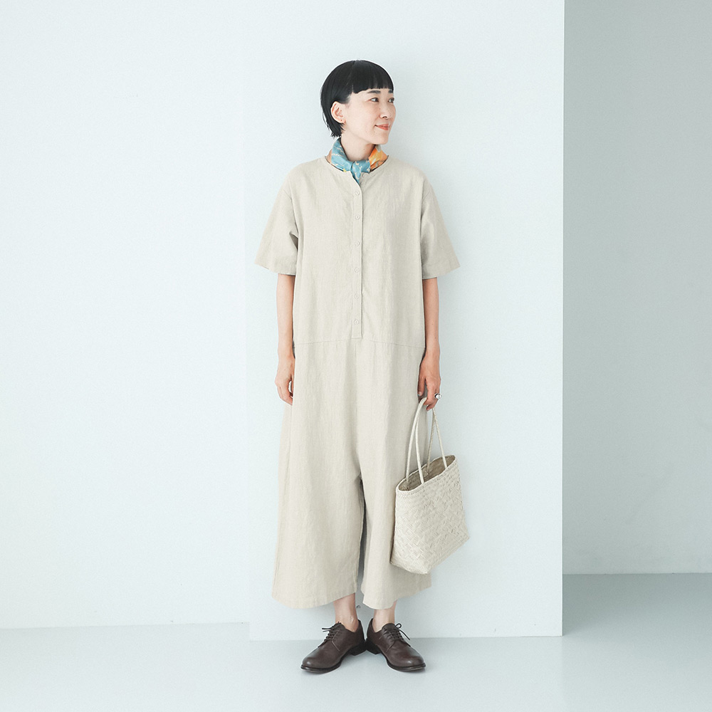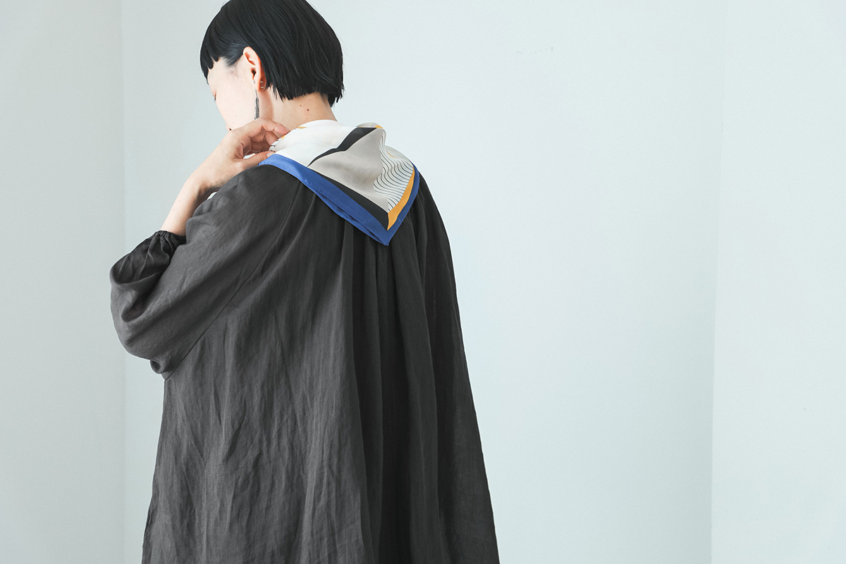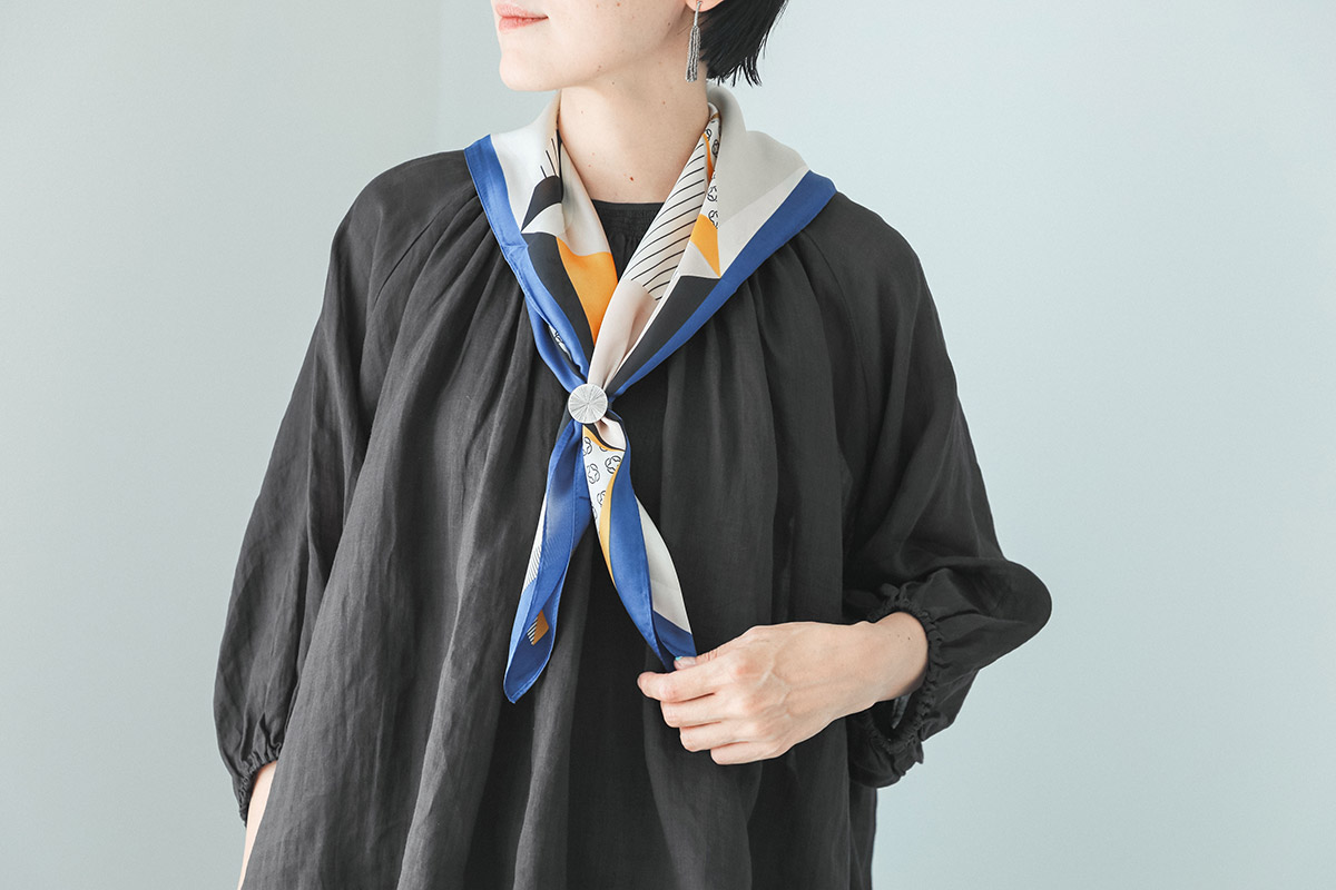 ワンピースやオールインワンなどの生地の面積の多い服がちょっと単調? と感じたとき、スカーフは効果てきめん!