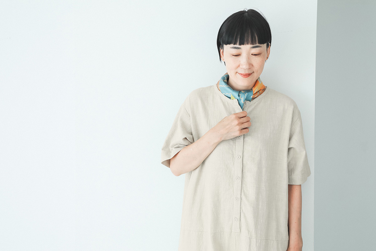シャツを着るなら、折り返しがある襟ではなく、バンドカラーやノーカラーのすっきりとした襟のものを選ぶのがおすすめです。