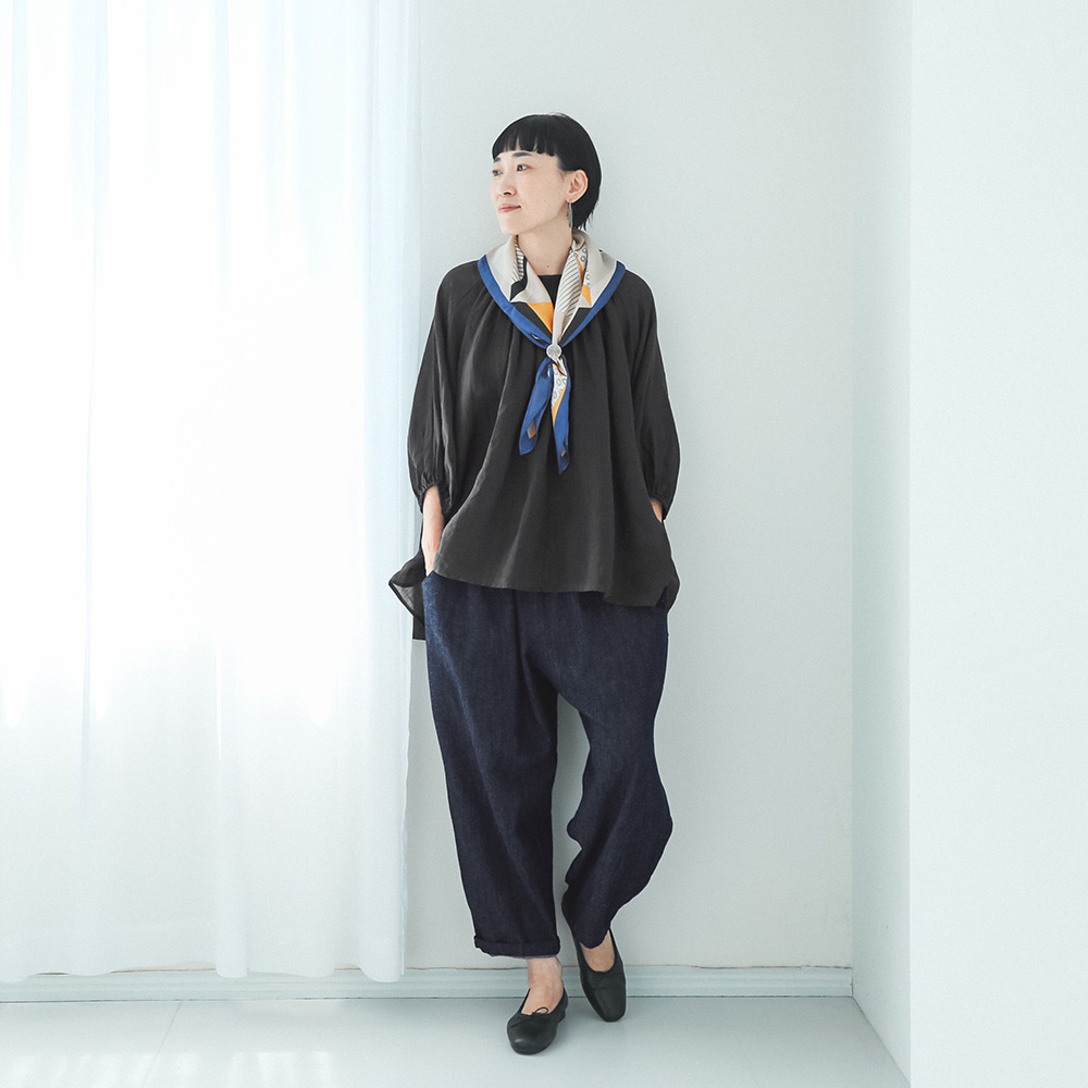 ふんわり巻いたスカーフのボリュームが、ブラウス×パンツのシンプルなコーディネートに上品なアクセントを添えてくれます。