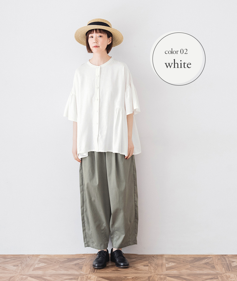 程よい開きのバンドカラーで重ね着にも活躍します。