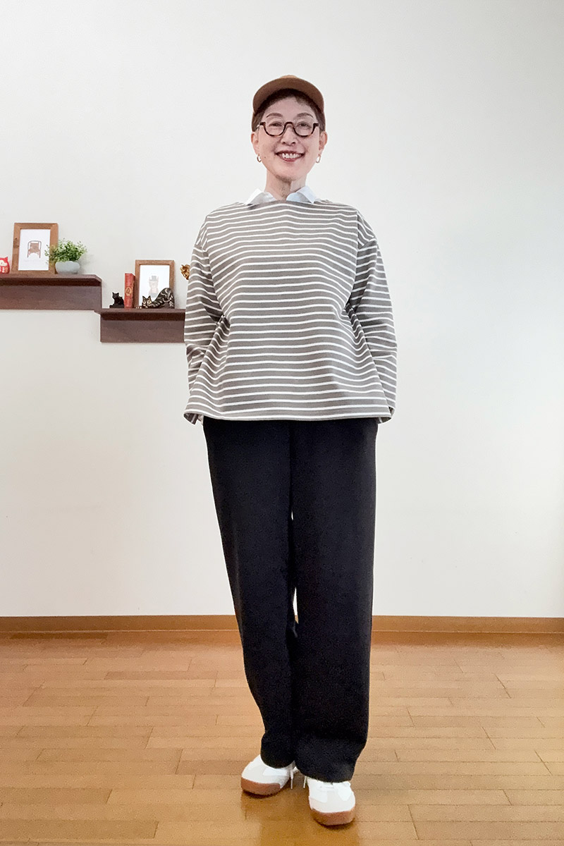 「ベージュ×ホワイトのボーダーはやさしいイメージの配色ですが、白いシャツを中に着ることで顔まわりがパッと明るく華やかになります。ボトムには黒のスウェットパンツを合わせました」