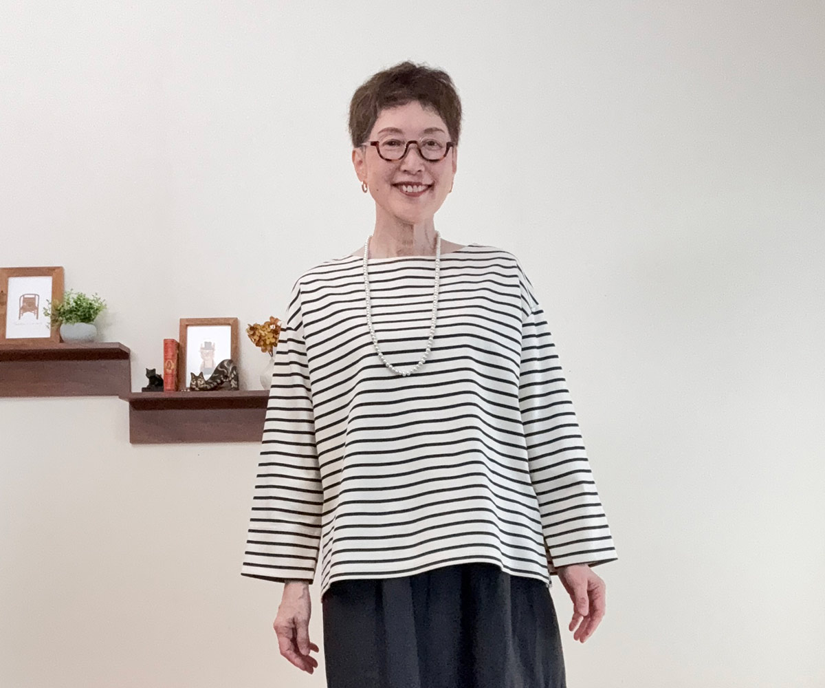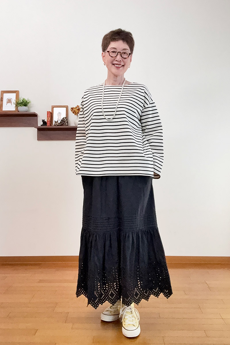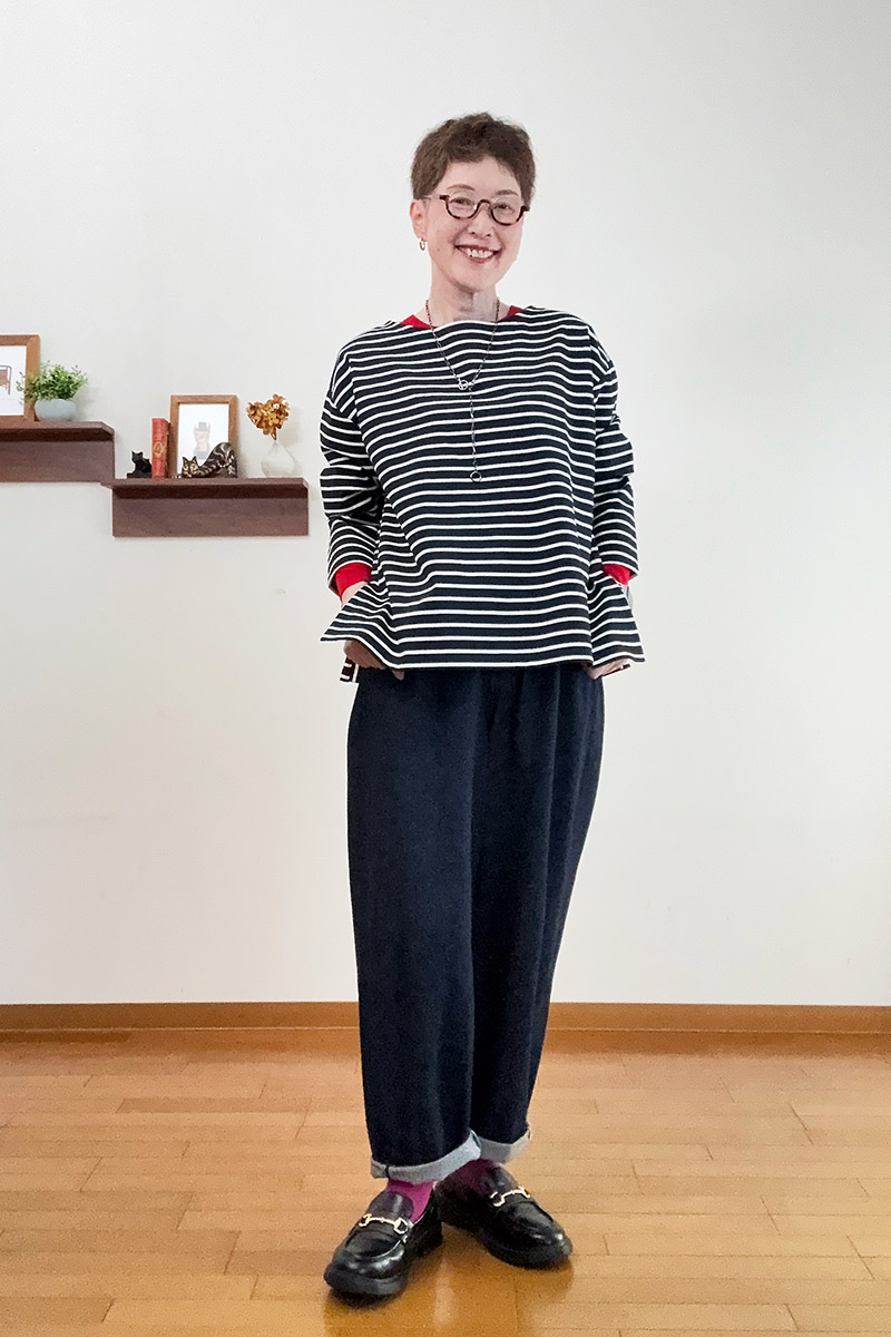 「ボーダーカットソーは大好きなアイテム。秋だけでなくどの季節にも着られて便利ですし、昔から着ているので安心感があります。