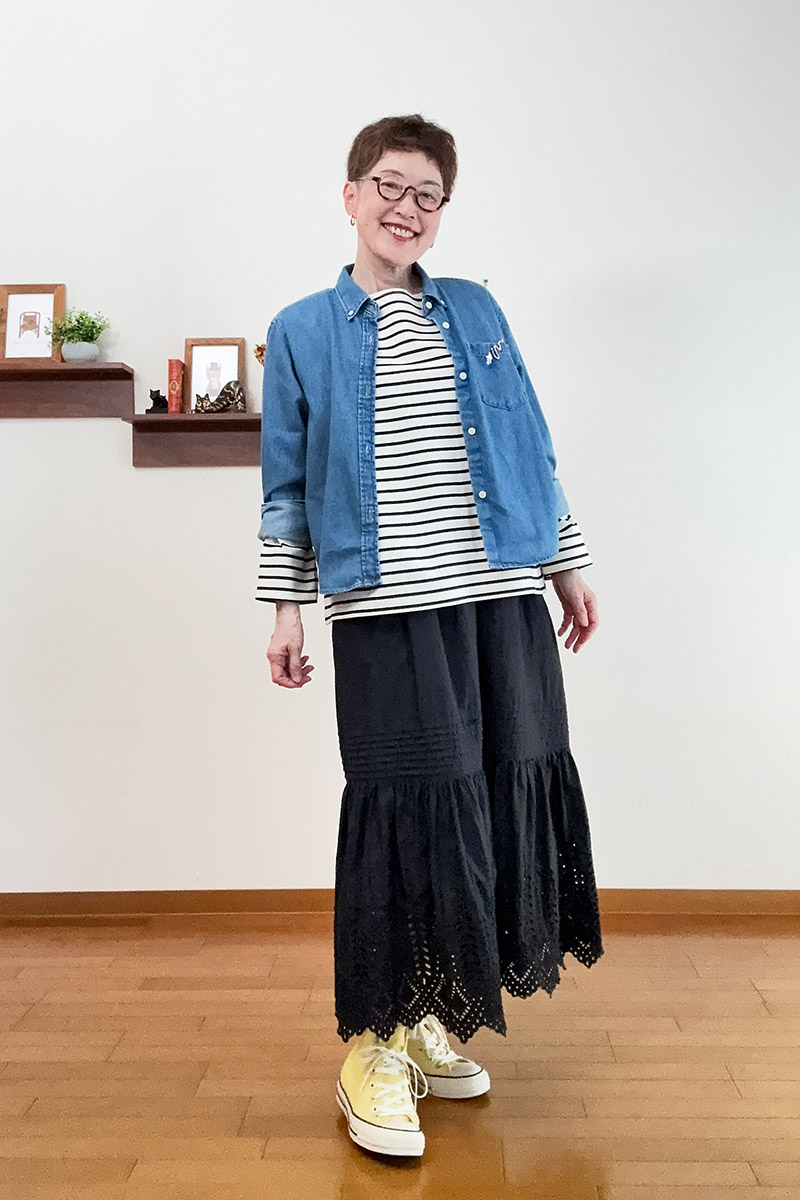 デニムシャツを上に羽織って、よりカジュアルな装いに。さっと折った袖口からもボーダーをのぞかせることで、こなれ感がアップします。