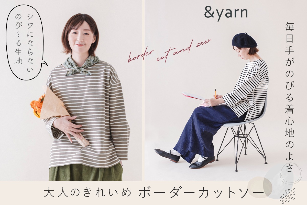 ▲ボーダーロングスリーブプルオーバー ¥6,050 &yarnナチュランオリジナルブランド「&yarn(アンドヤーン)」の新作を着用いただきました! 色はベージュ×ホワイト、ネイビー×ホワイト、キナリ×ブラックの3色展開です。(Mimiさんが上の写真で着用しているのはキナリ×ブラック。)